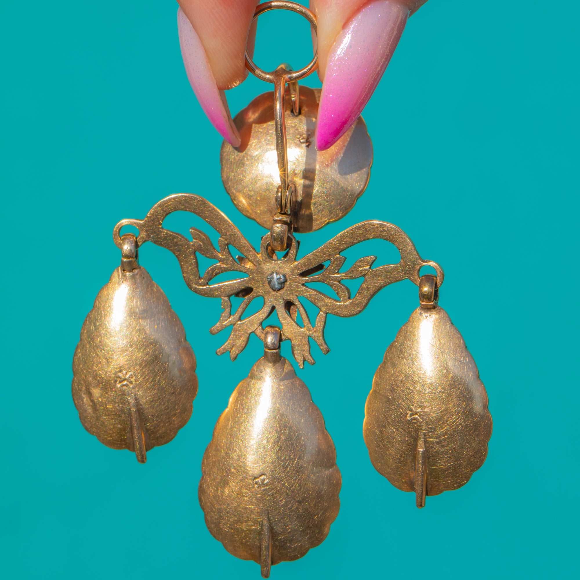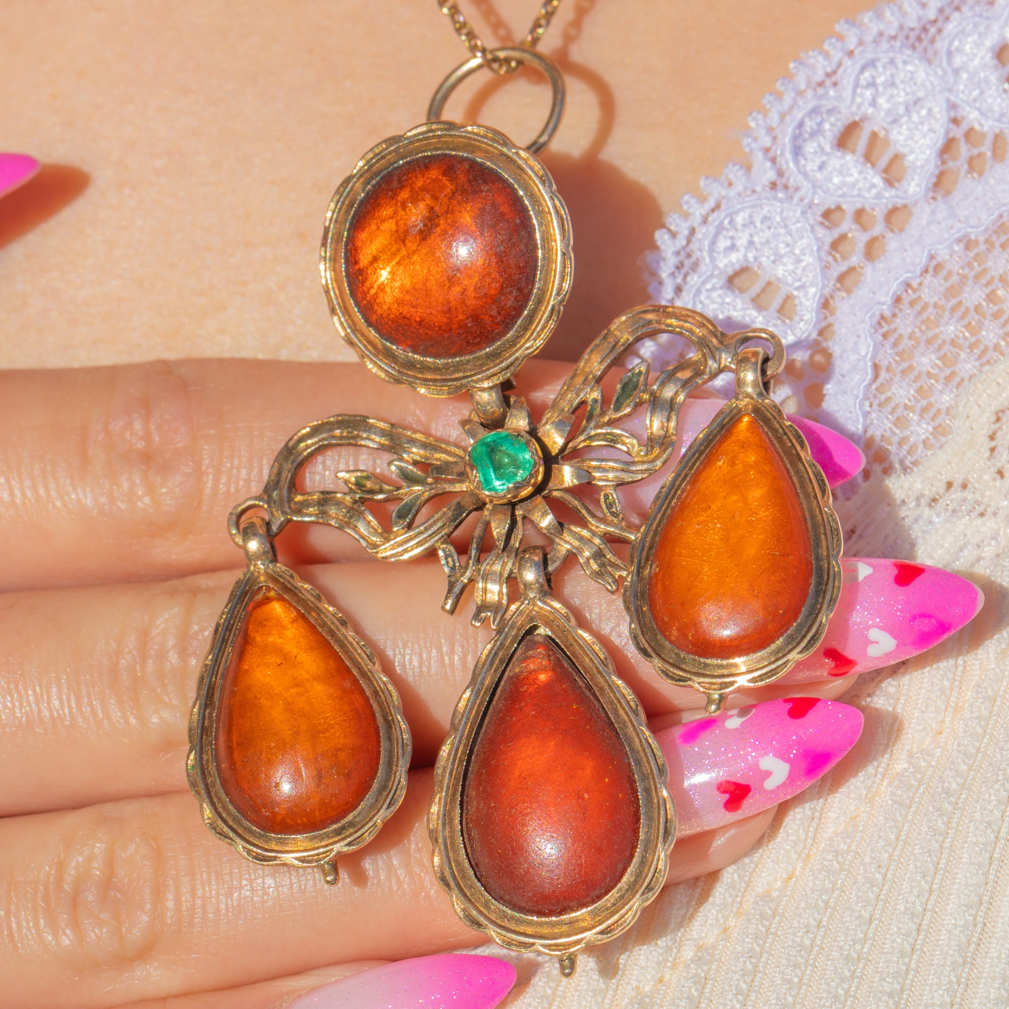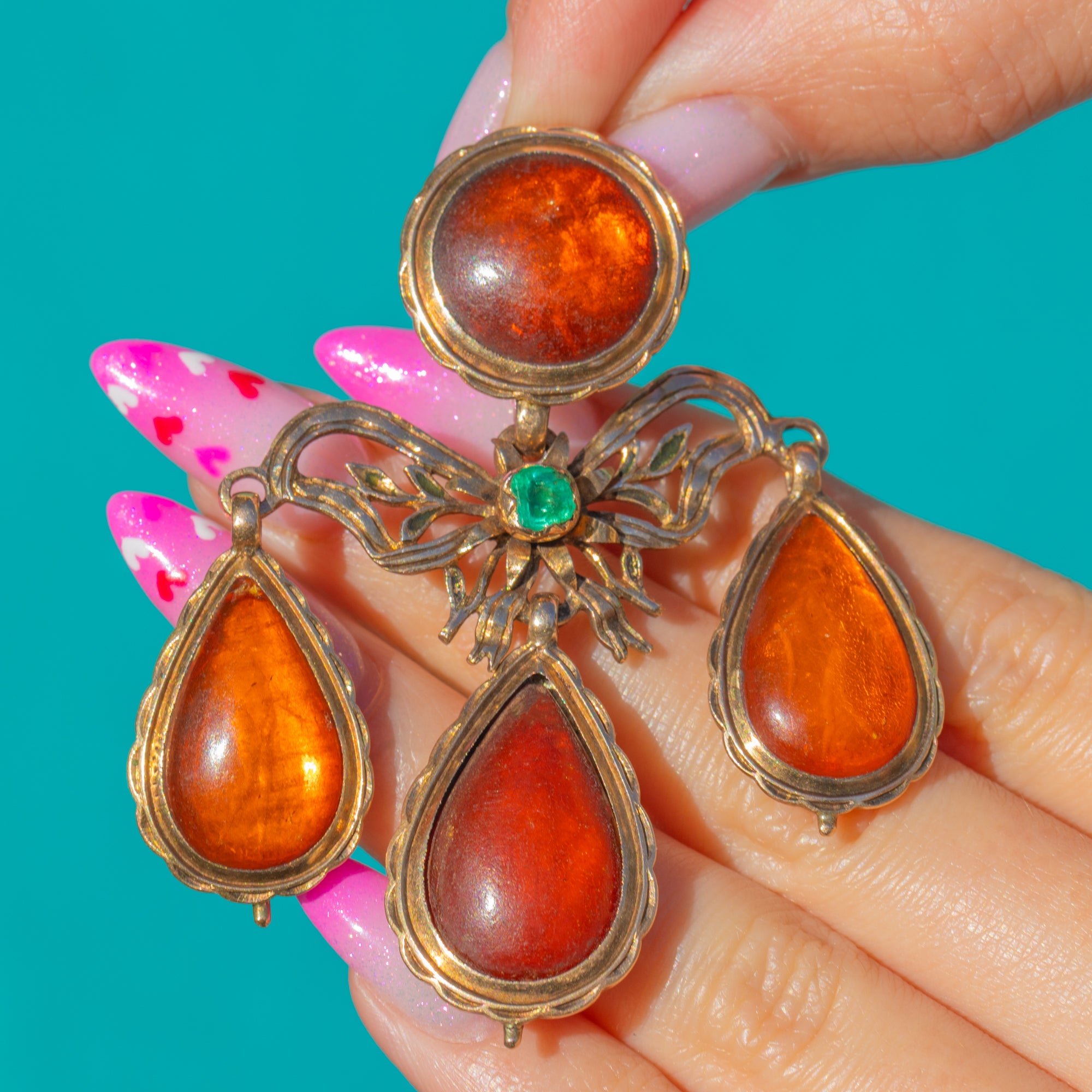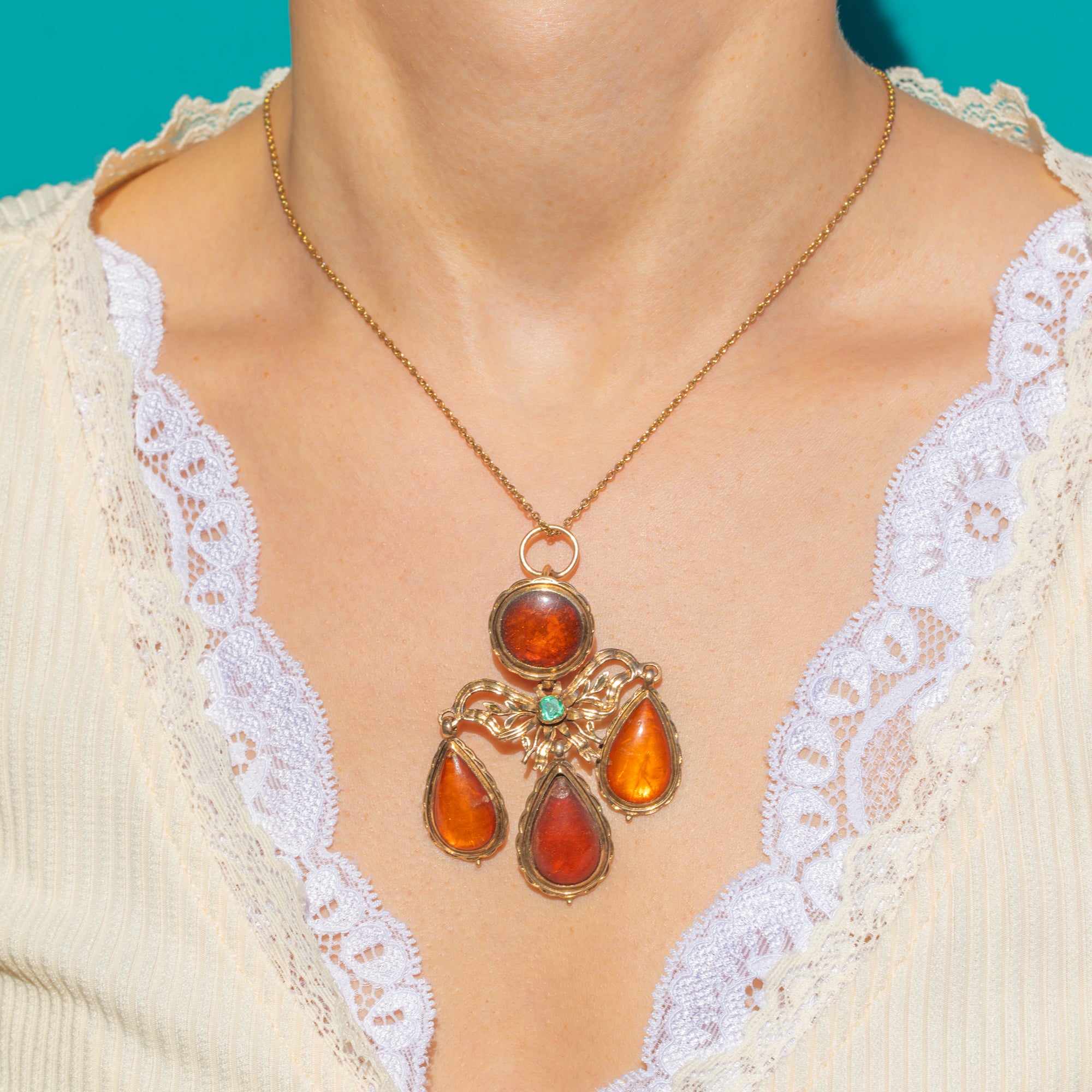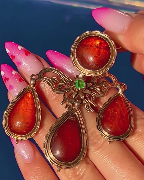 A sumptuous Portuguese Georgian girandole pendant ablaze with glowing Amber and a vivid Emerald accent. Crafted in rich 18ct Gold, the design centres a round Amber cabochon over a graceful bow and foliate openwork, cascading to three articulated pear-shaped Amber drops. The scalloped closed-back bezels and fluid movement are quintessentially Georgian, creating a romantic chandelier silhouette that dances with every step.