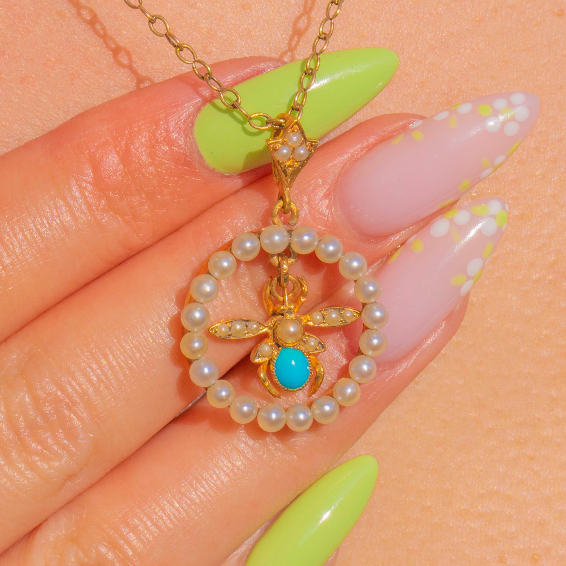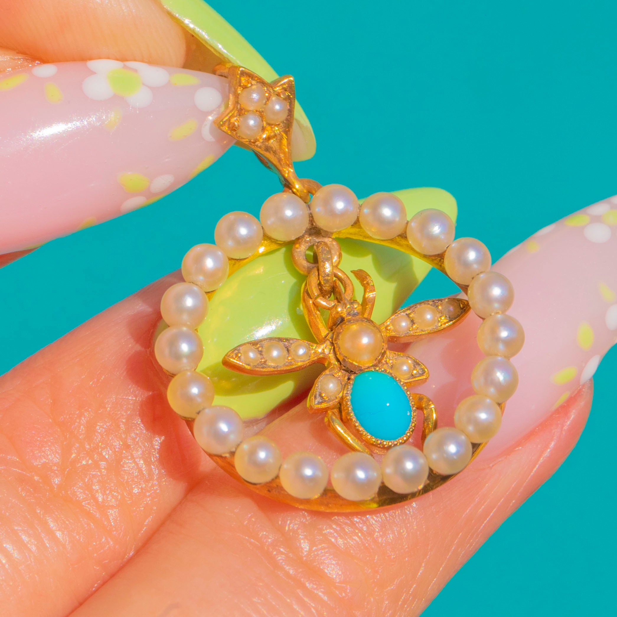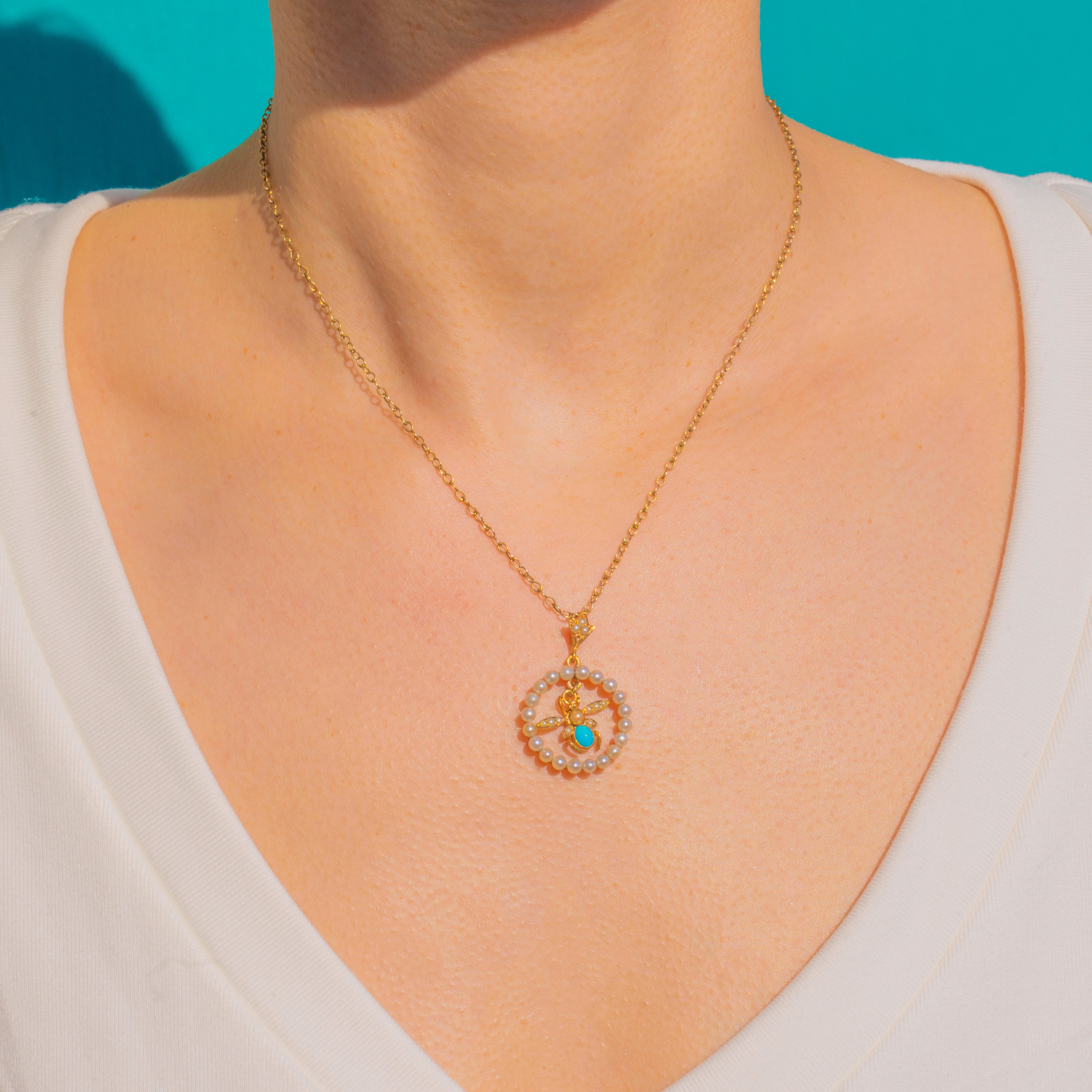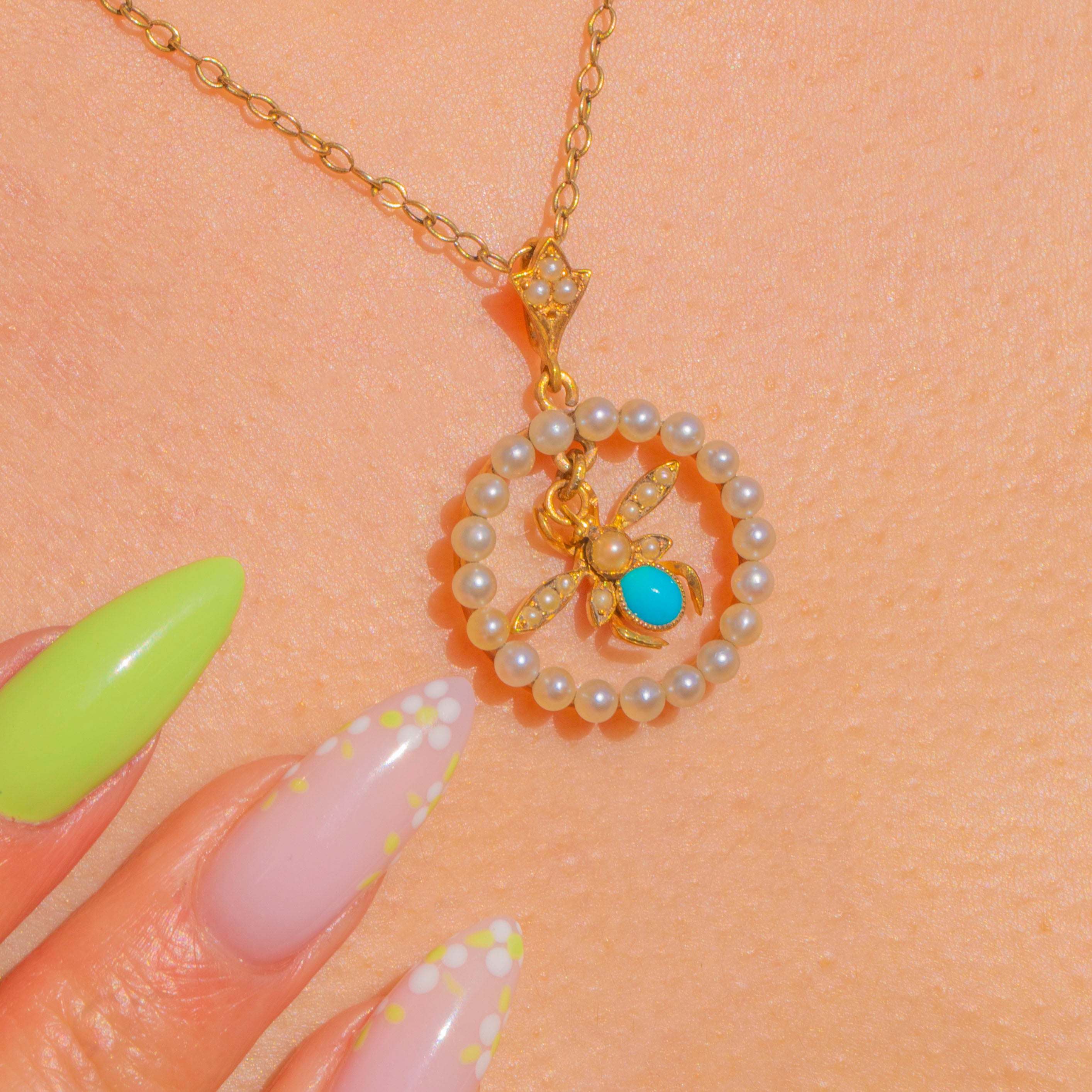 A charming Victorian fly pendant in rich 15ct Gold, set with luminous Pearls and a vivid Turquoise cabochon. A halo of Seed Pearls forms a delicate wreath, while the articulated fly at the centre is beautifully detailed with a round Pearl head, elongated Pearl-set wings and an oval Turquoise body. The tapered bail is accented with three tiny Pearls for a refined finishing touch.