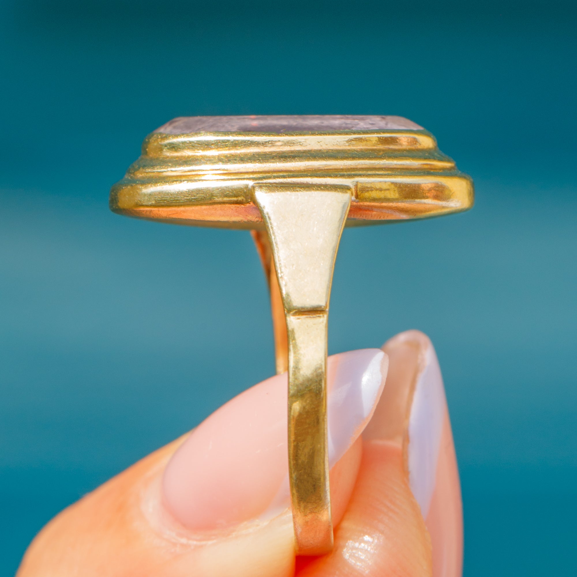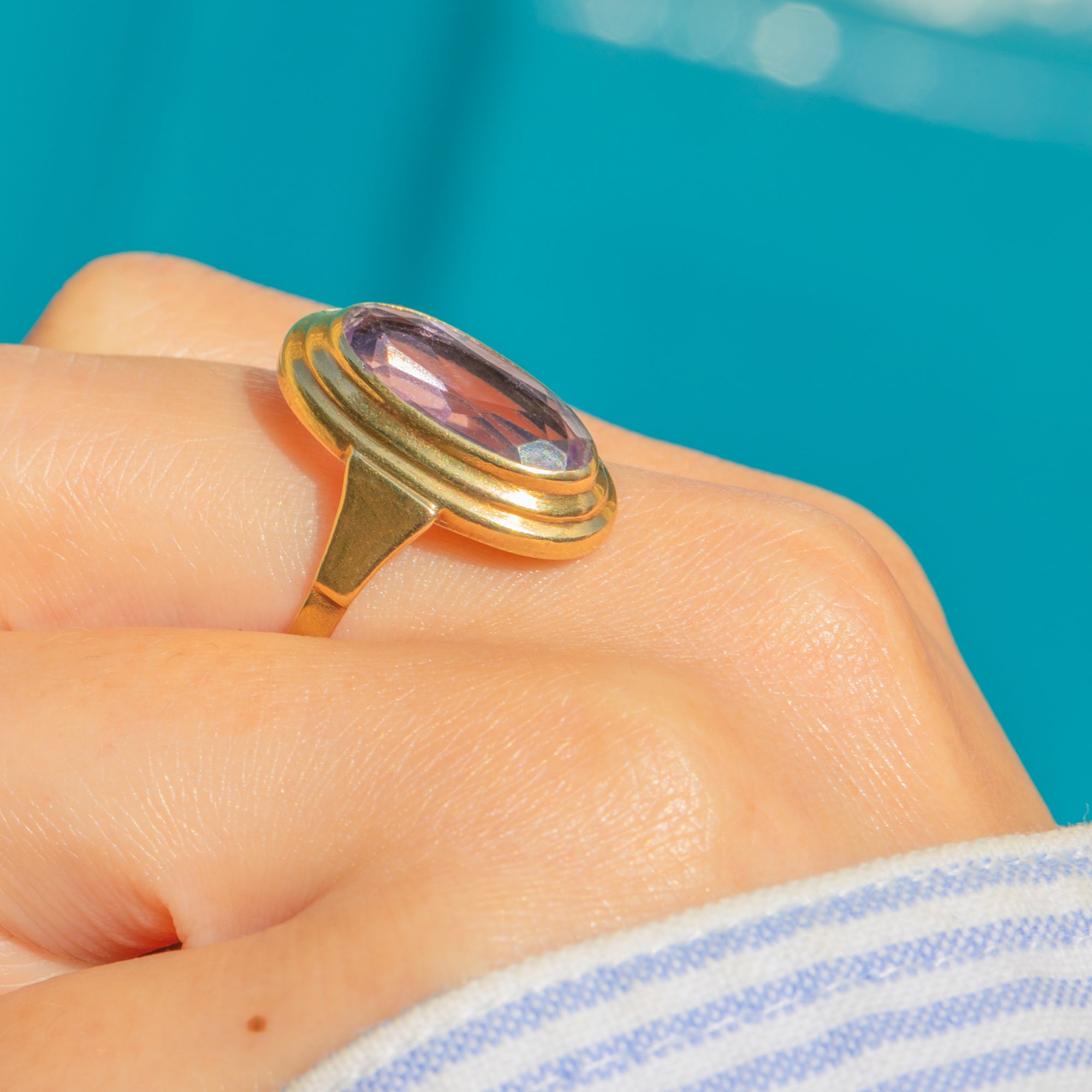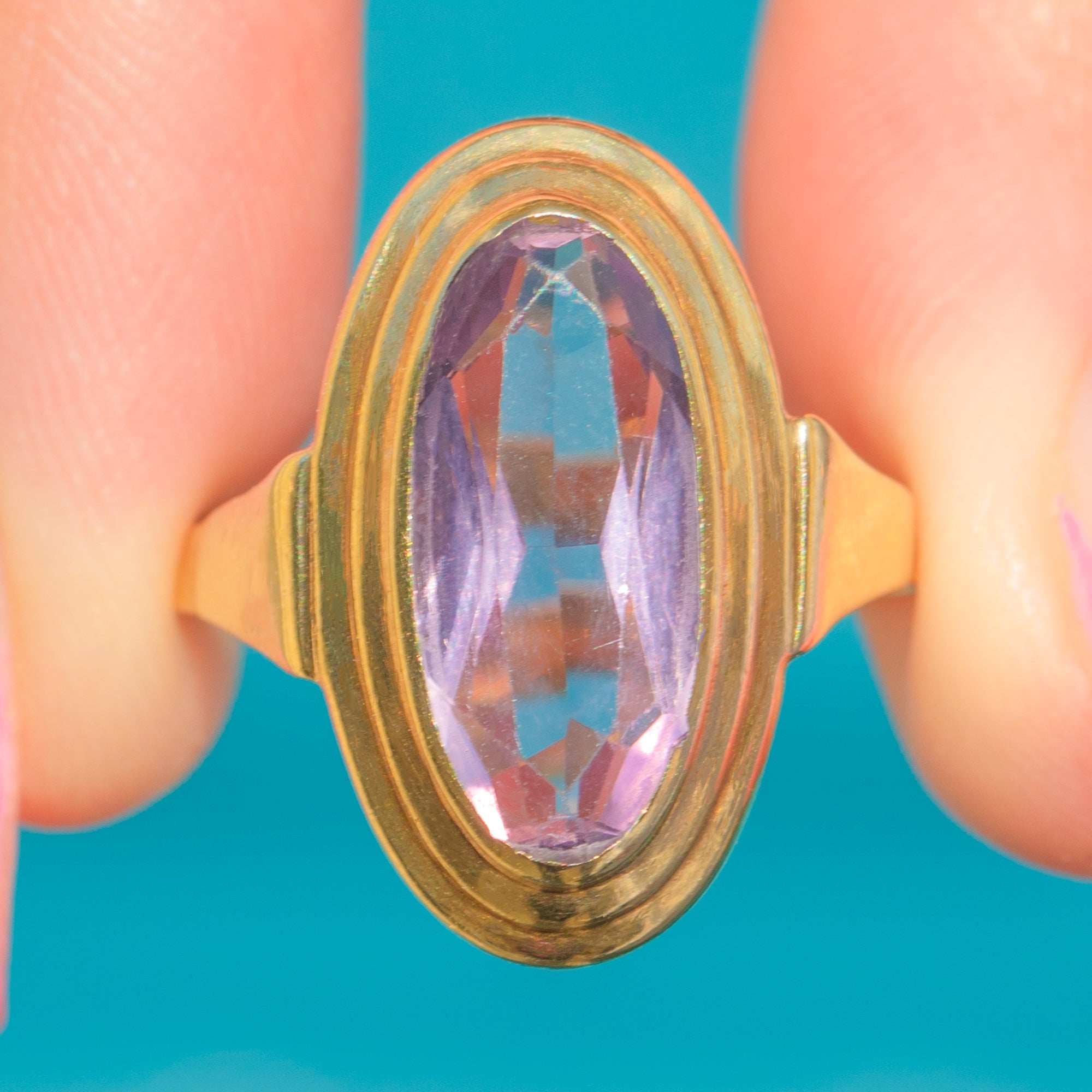 Her Amethyst is hugged tightly by a chunky bezel, sitting upon a smooth and buttery 9ct Gold band. It is safe to say that this vintage Amethyst ring is a real delight!