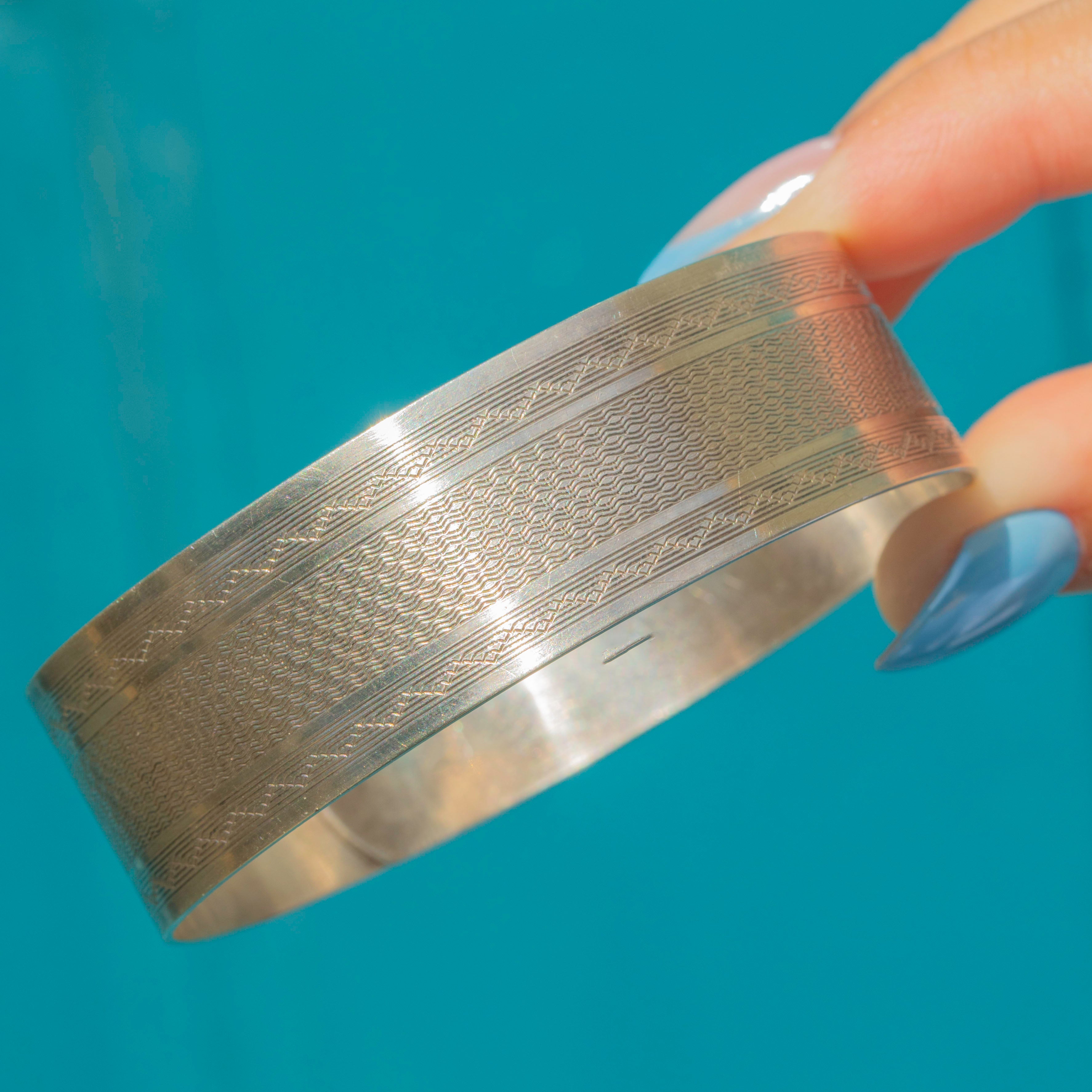 EXCELLENT: This amazing Charles Horner bangle is in great condition with no dents or scuffs. The texture on the Silver brings a lovely character, with areas of high shine and areas of darker patina within the stripes. The bangle closes tightly so you can wear it with confidence!