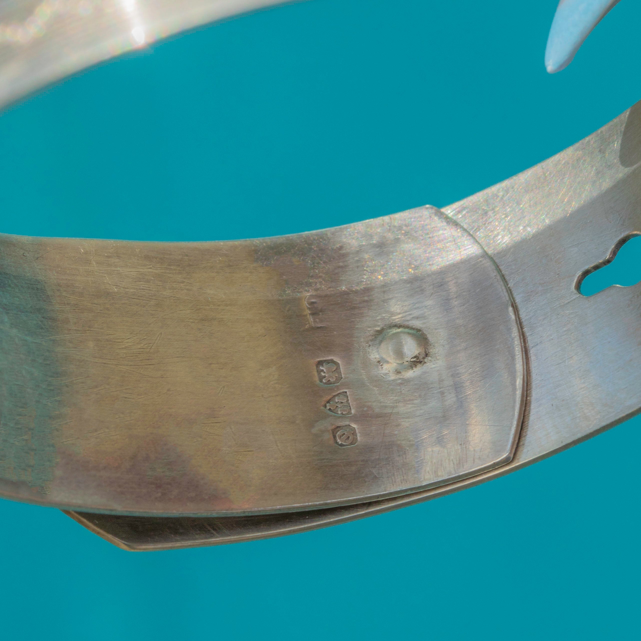 The bangle is a rare piece of English Silver signed by Charles Horner, made in 1939. It features the rare Chester hallmark, alongside the "C.H" Maker's Mark and the Lion Passant for Silver inside, as well as on the outside of the buckle.
