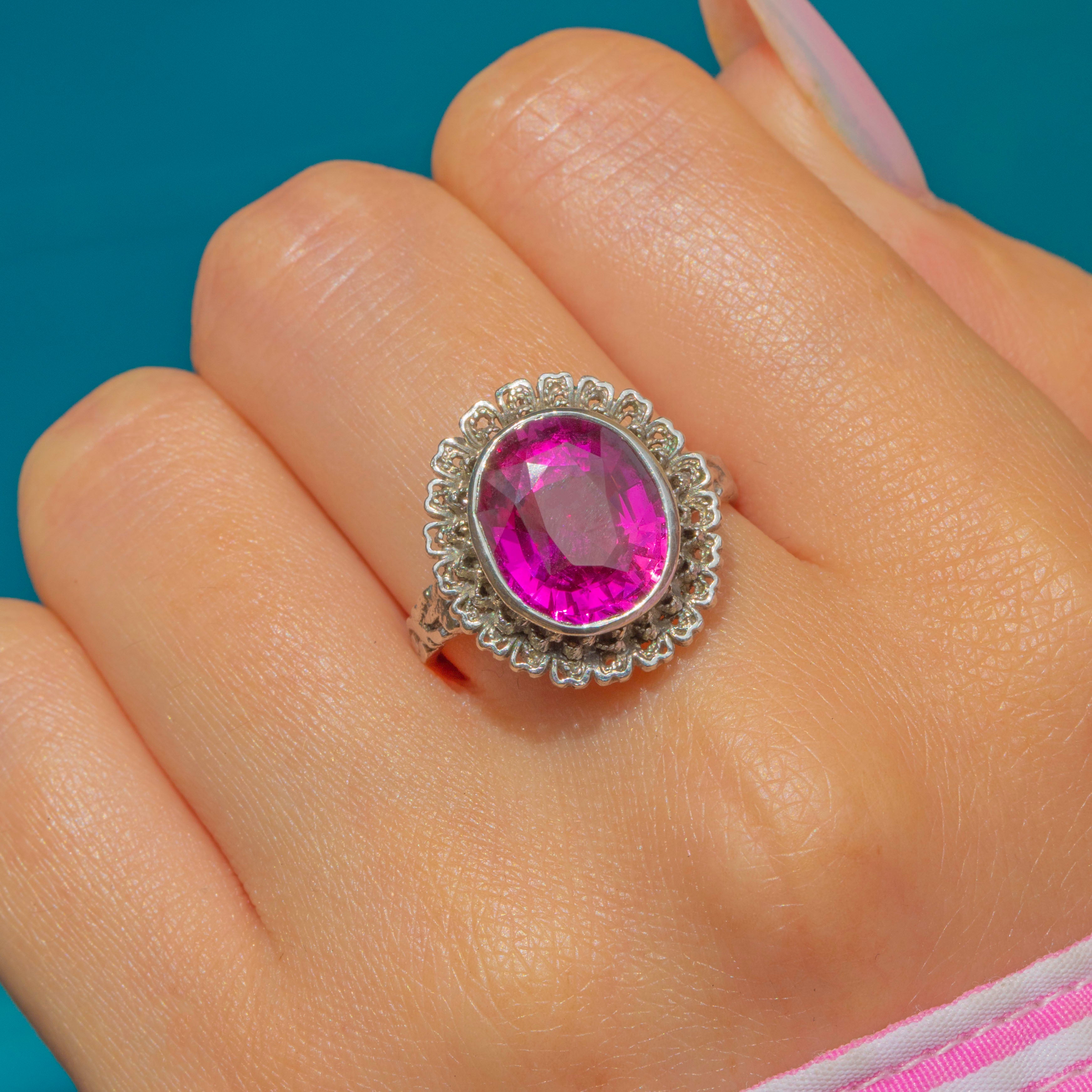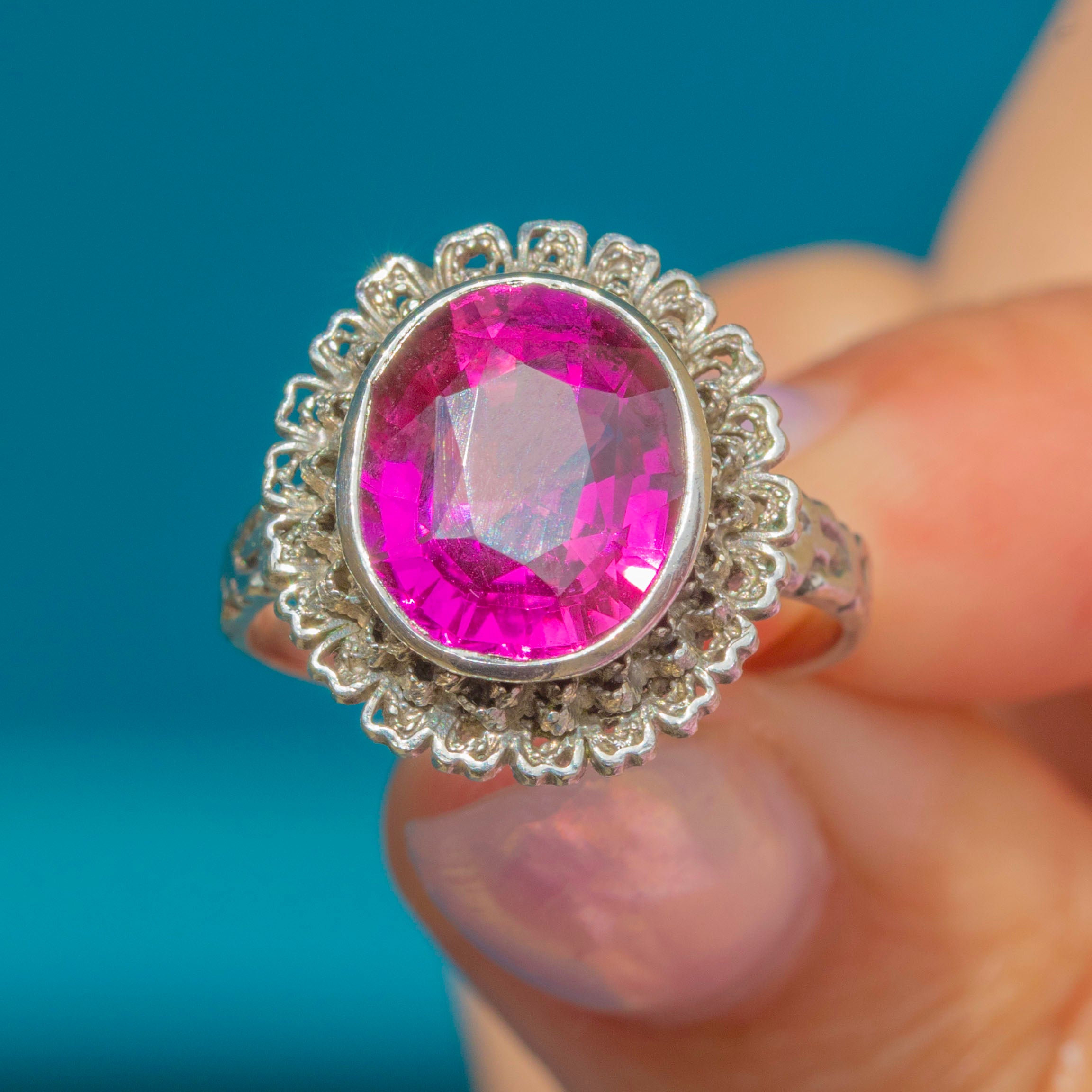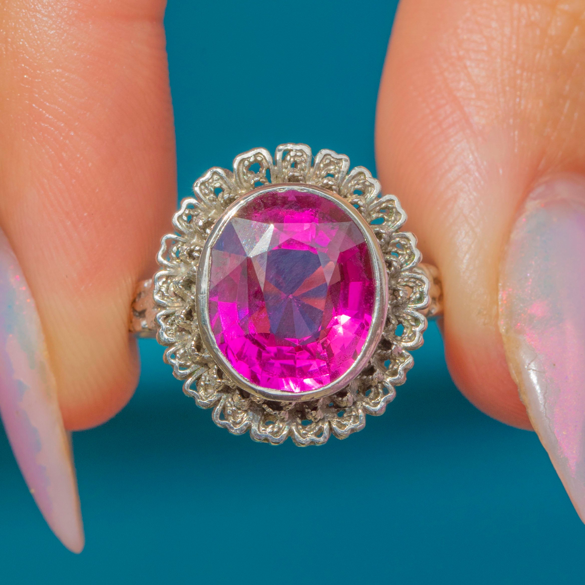 This bewitching mid-century vintage ring features stunning cannetille openwork and is inlaid with a 3.30ct hot pink Ruby!