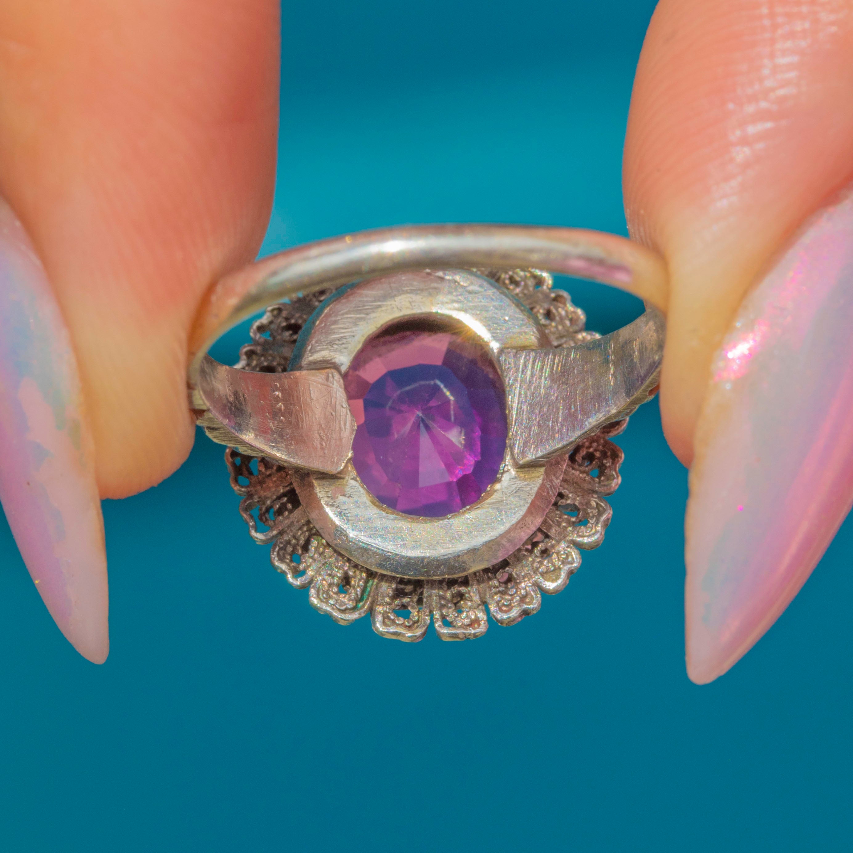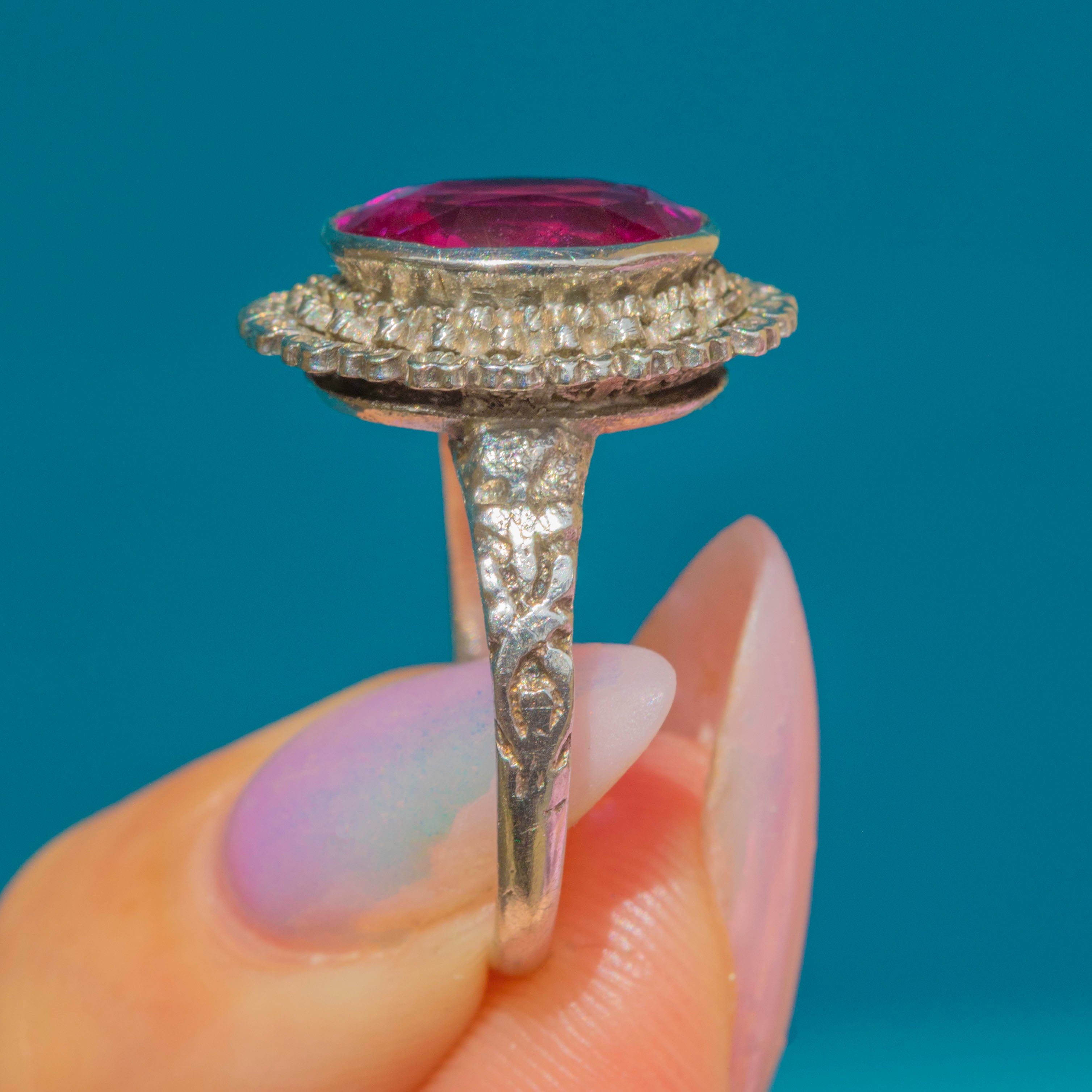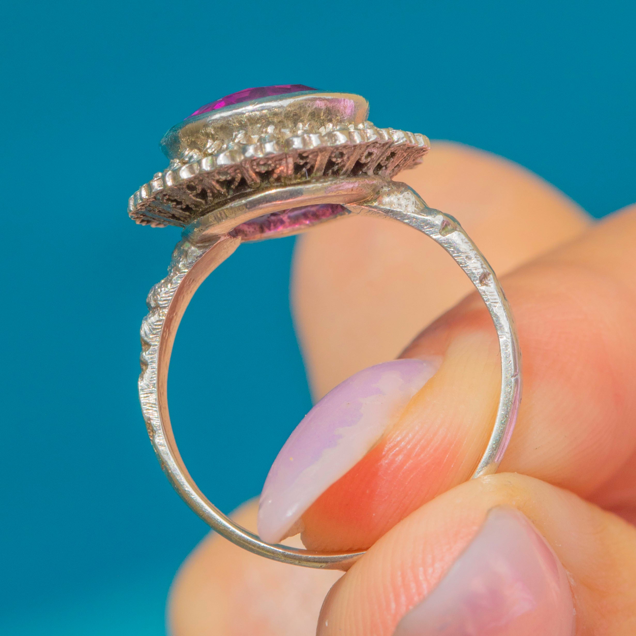 This bewitching mid-century vintage ring features stunning cannetille openwork and is inlaid with a 3.30ct hot pink Ruby!