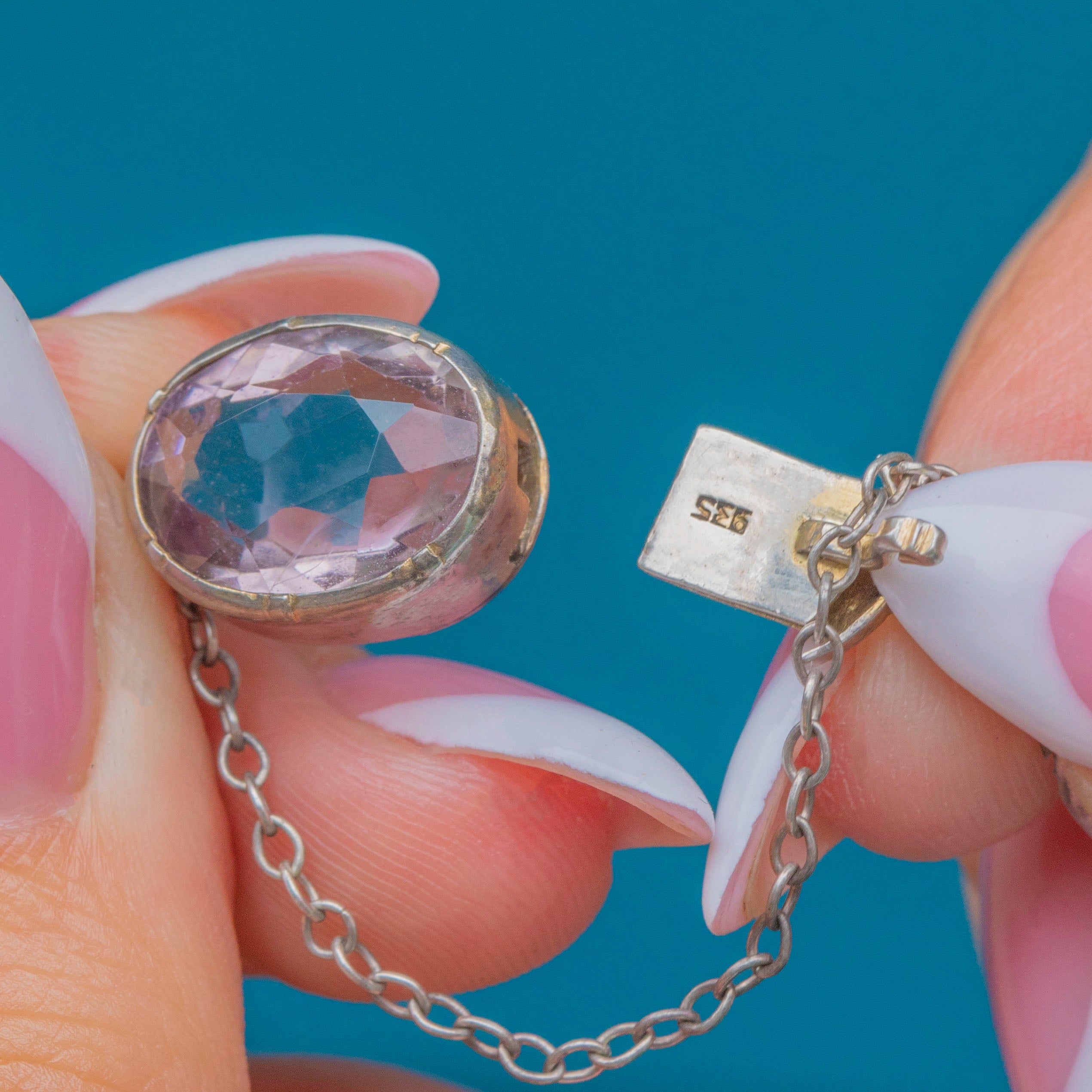 EXCELLENT: Each Amethyst is radiant and free from any notable signs of wear and set securely in its bezel. The Silver has built a nice patina with age, adding to its vintage charm. With its clasp in perfect working order and a safety chain for added security, you can wear this vintage Amethyst bracelet with confidence!