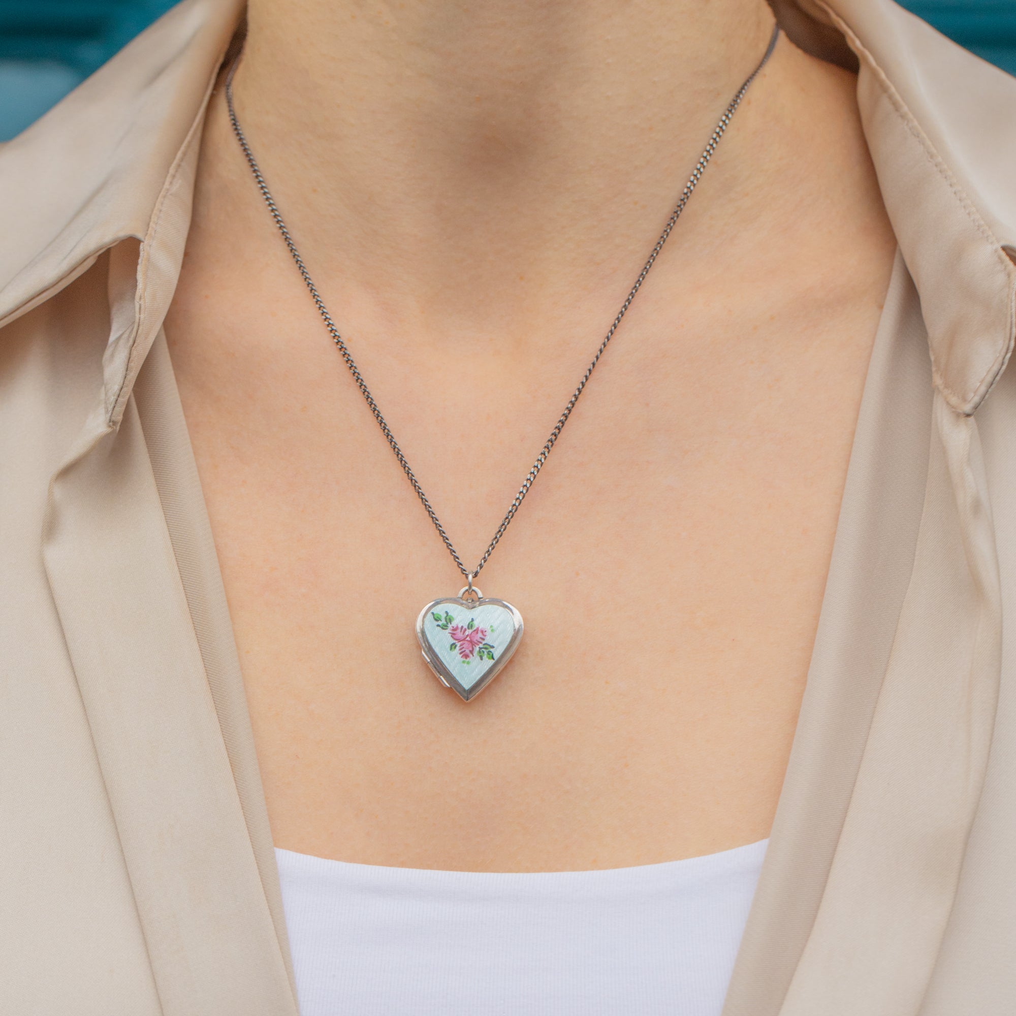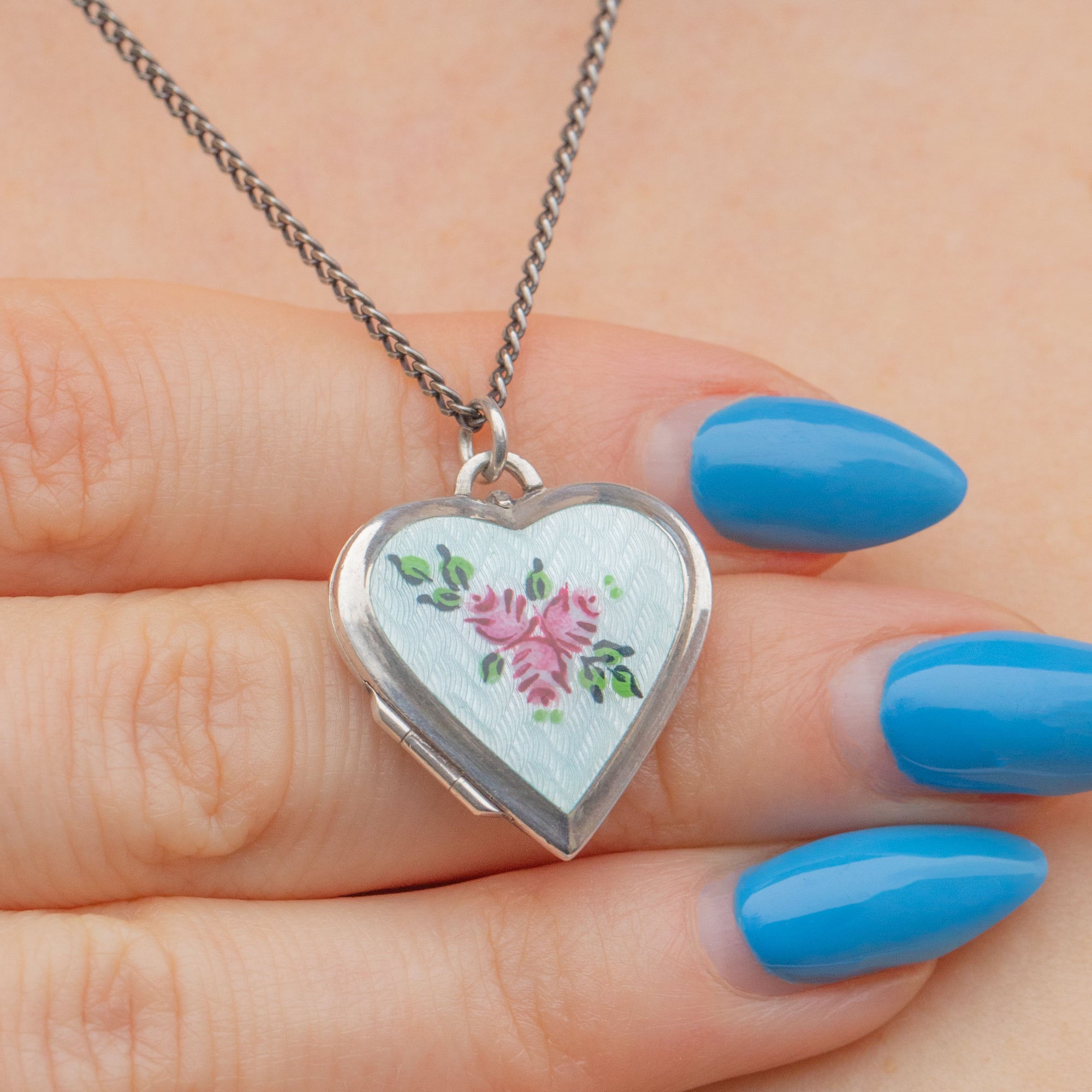 EXCELLENT. This Silver Guilloche Enamel heart locket is in excellent condition, with vibrant Enamel and well-preserved hand-painted pink roses. Her Silver shows a light patina, adding to her charm, and the hinge and clasp are secure. A beautifully maintained piece, ready to be cherished for decades more!