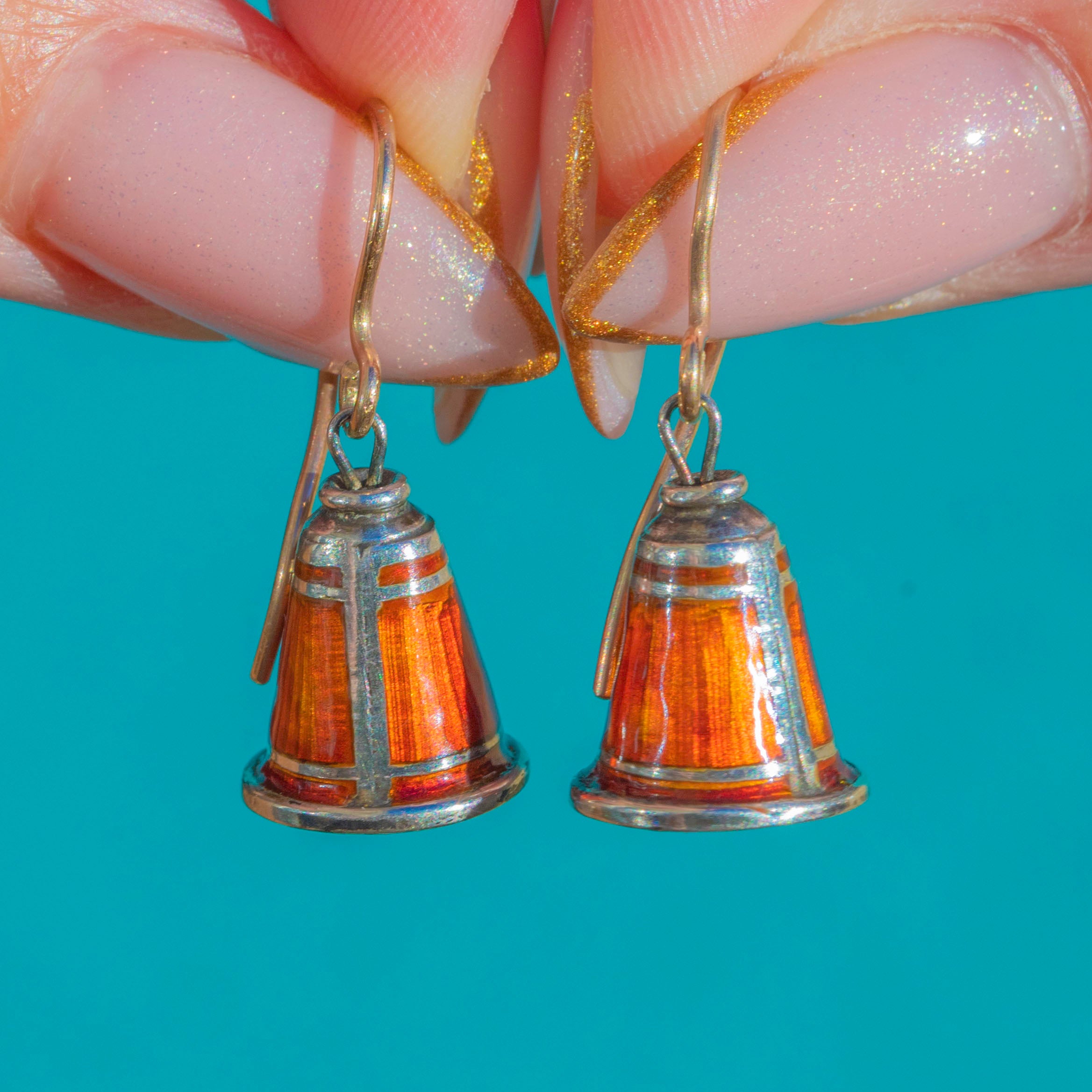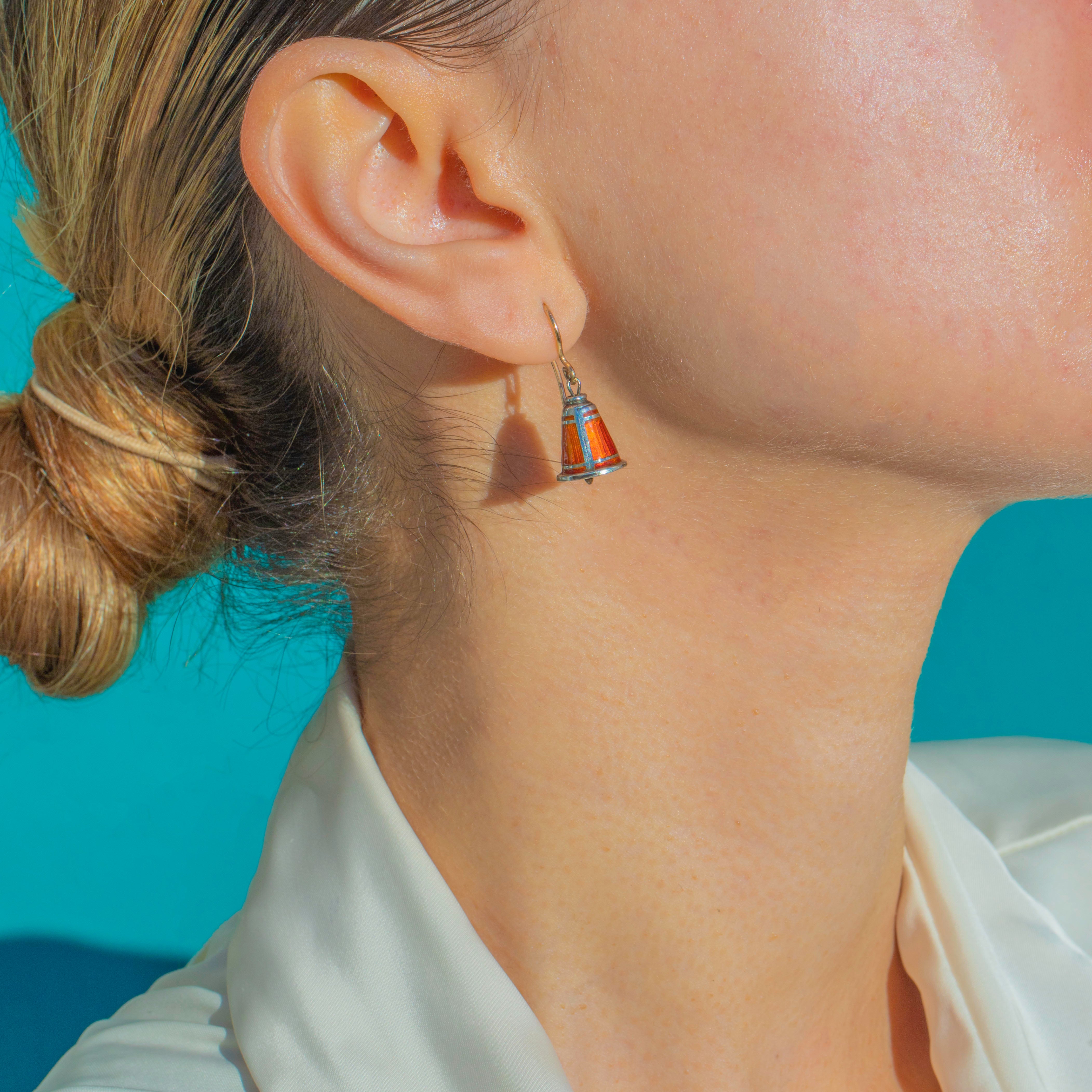 Charming and full of character, these vintage bell earrings feature vivid red Enamel panels set into polished Sterling Silver and are complete with 9ct Gold hooks. The fluted bell shape gives them beautiful movement on the ear, while the warm tone of the Enamel glows against the Silver for a playful yet elegant finish.