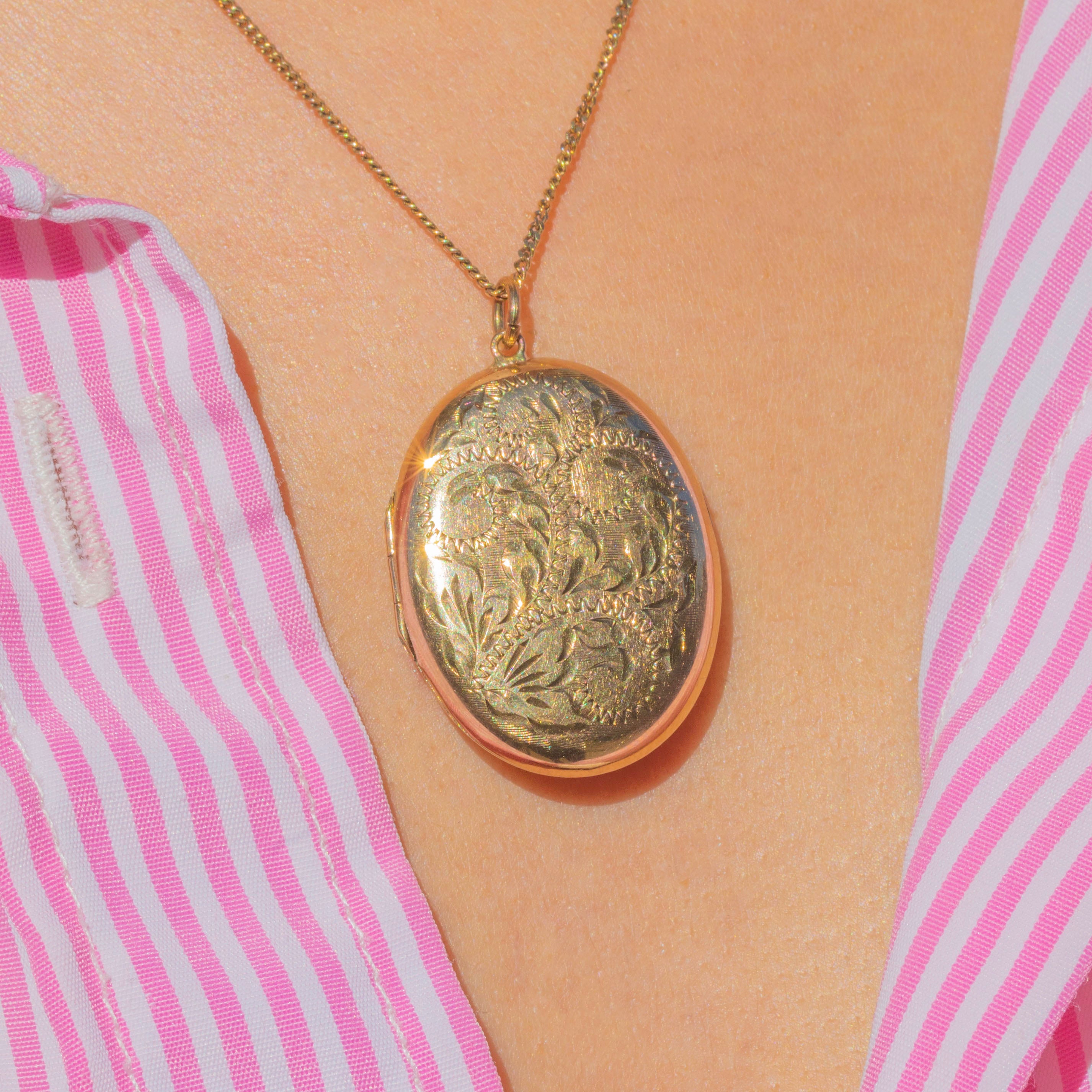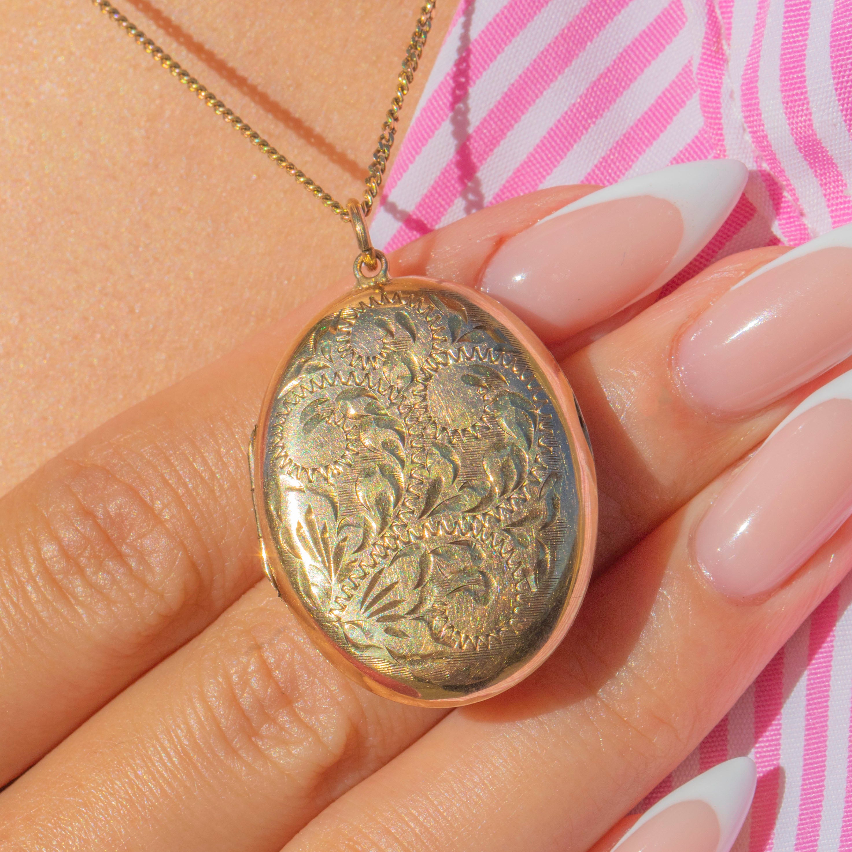 This Solid 9ct Gold oval locket is a beautifully crafted piece of Vintage jewellery, hallmarked for Birmingham 1975. Both sides are adorned with immaculate hand-engraved detail, showcasing delicate patterns that shimmer as they catch the light. The engravings are crisp and intricate, adding depth and texture to the warm glow of the Gold.