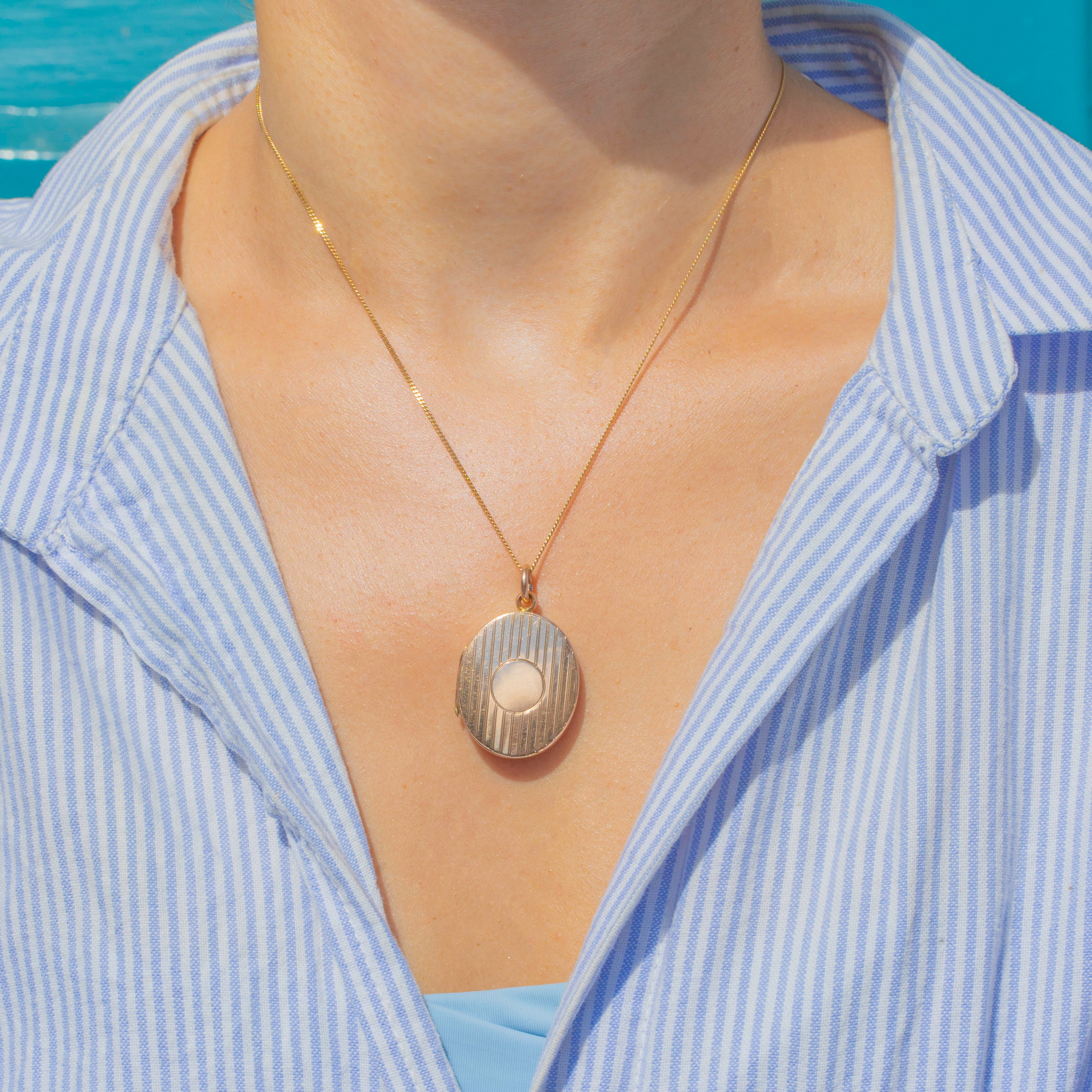 This wonderful Art Deco locket has been crafted from solid 9ct Gold and displays a striking pinstriped design that catches the light beautifully, creating an interesting visual effect.