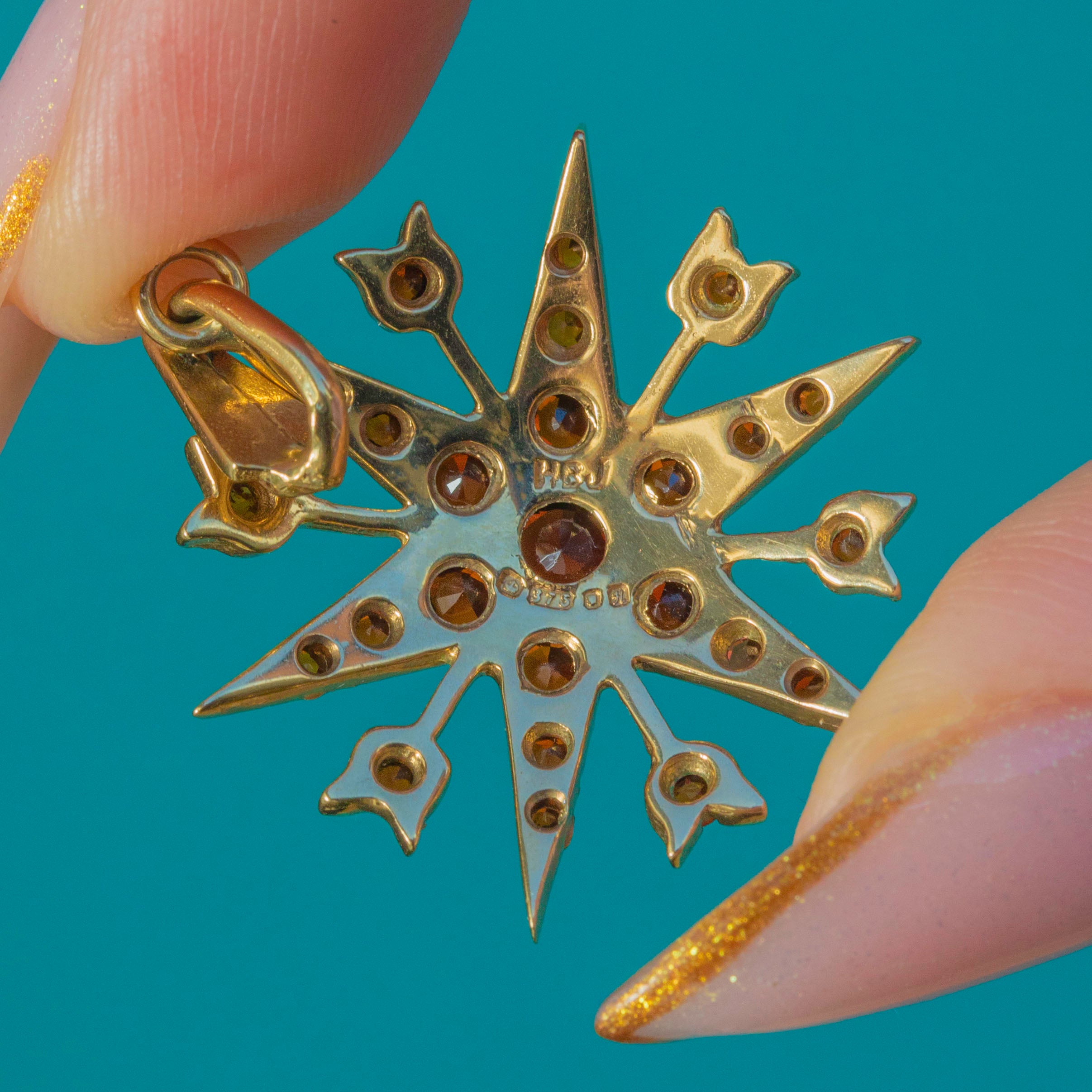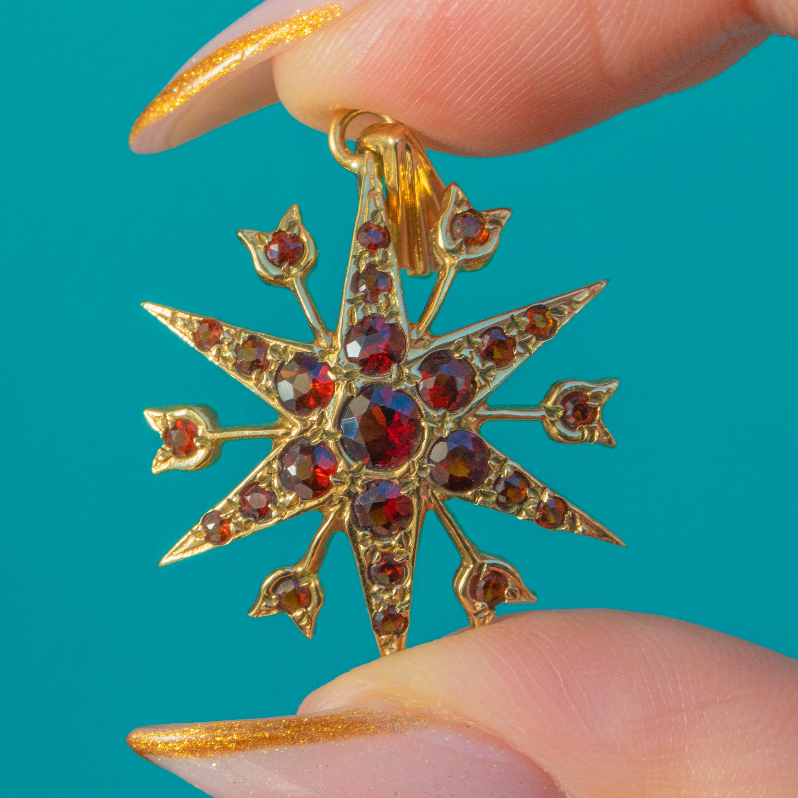 A vibrant Vintage star pendant crafted in solid 9ct Yellow Gold and set with rich, glowing red Garnets. Made in 1982 and fully hallmarked, this dramatic starburst design features layered rays and heart-shaped tips, each adorned with sparkling faceted Garnets that catch the light beautifully.