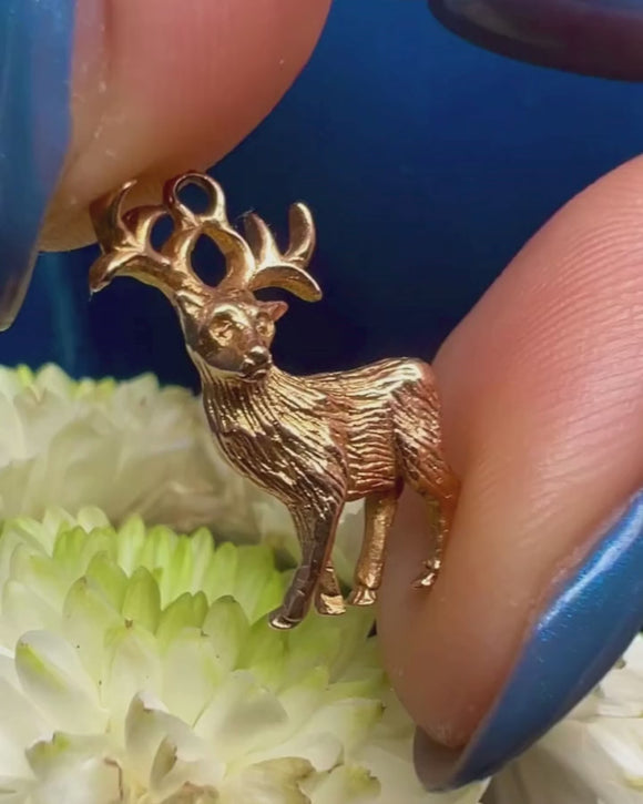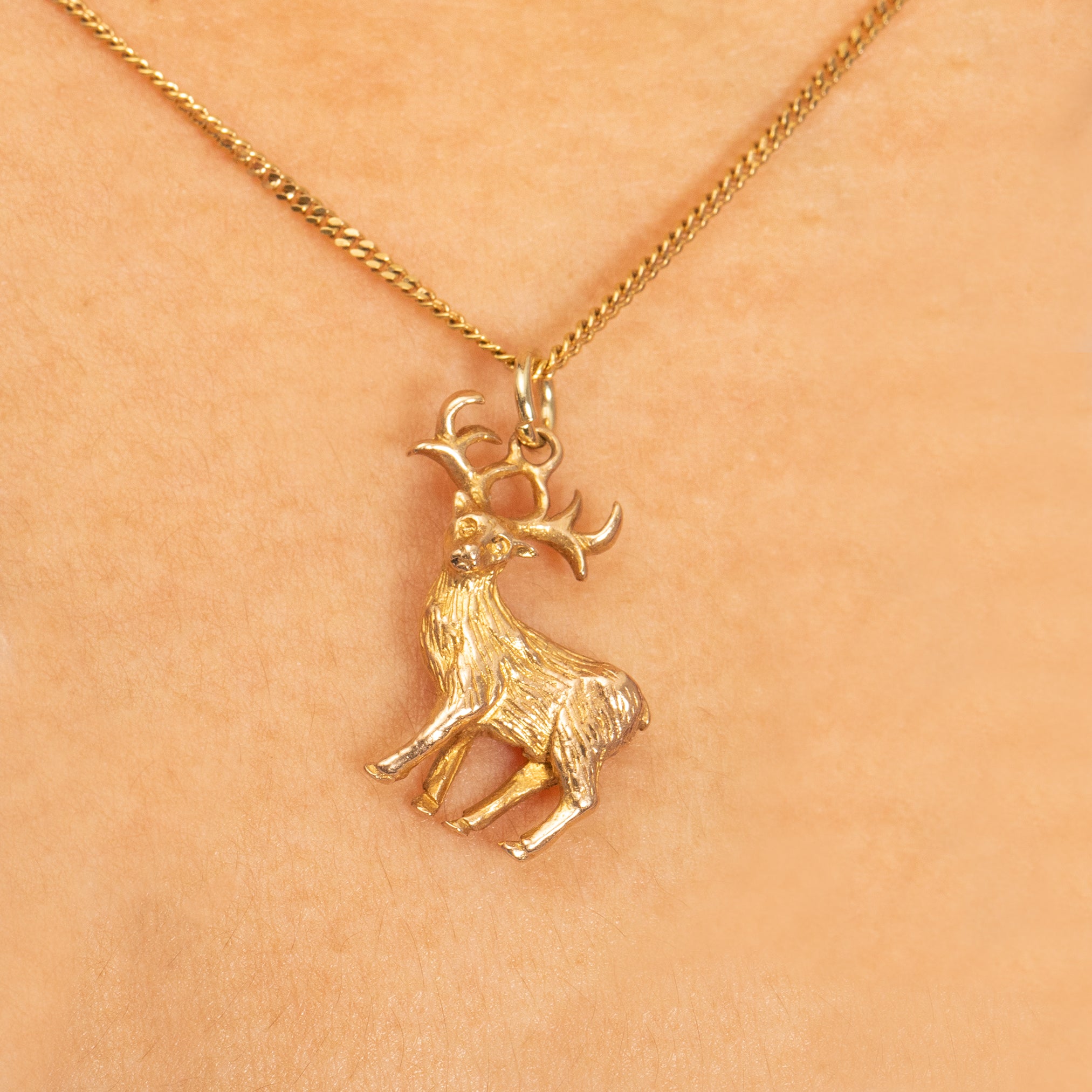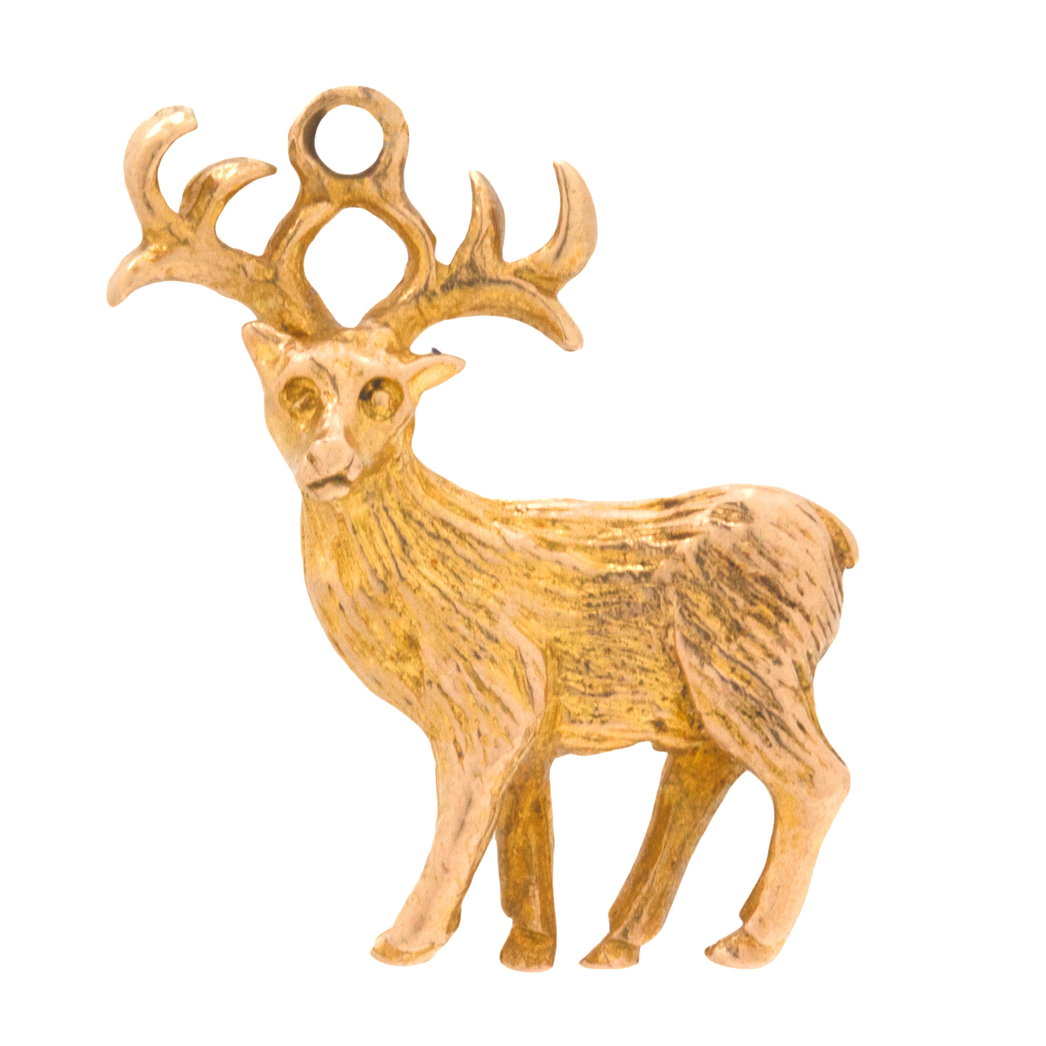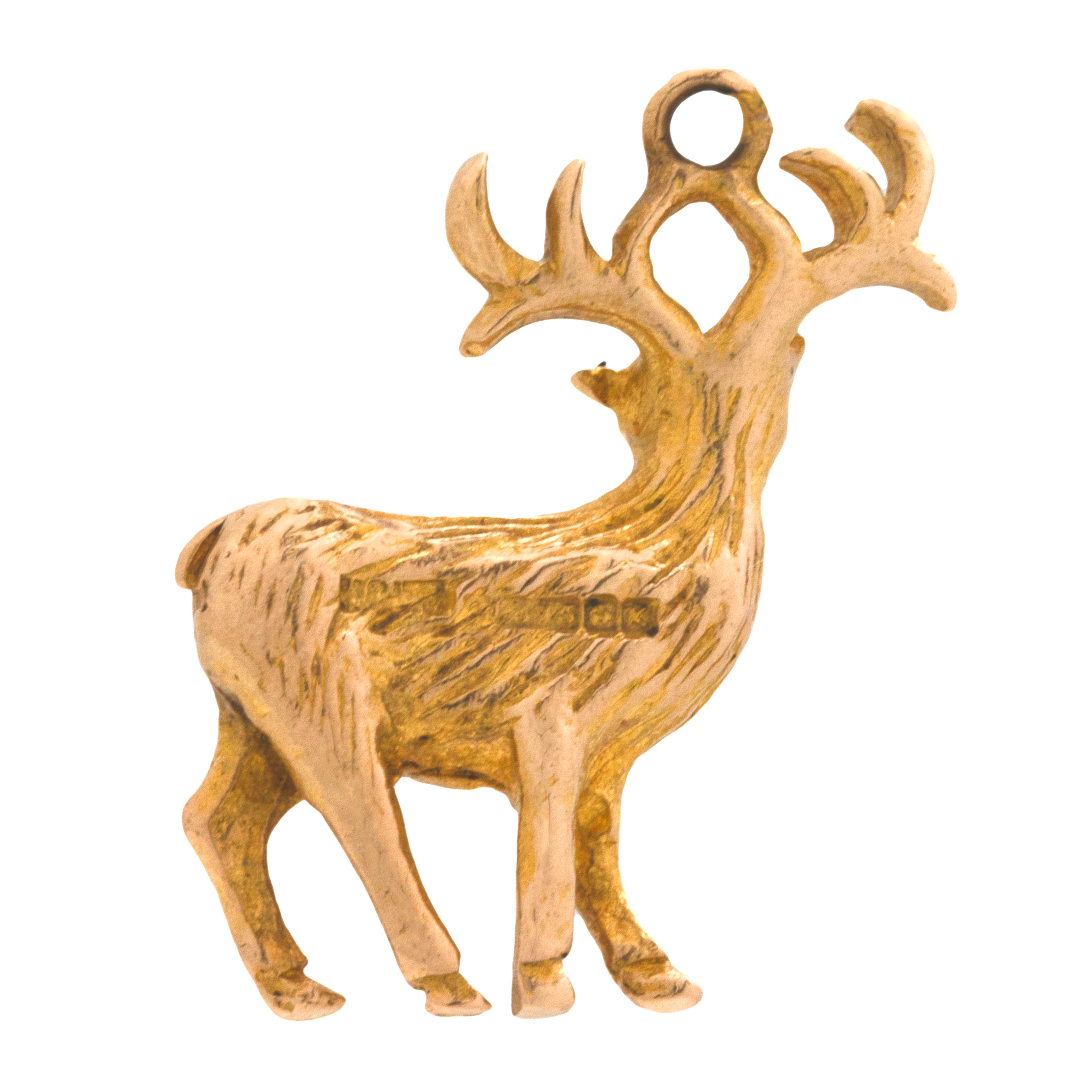 EXCELLENT. This 9ct Gold stag charm is in excellent condition. The charm is lightweight and the engraved details have all remained crisp. The 9ct Gold is buttery and the charm is free from any dings with a clear set of hallmarks on the back. This charm is ready to be suspended from a chain and worn with pride!