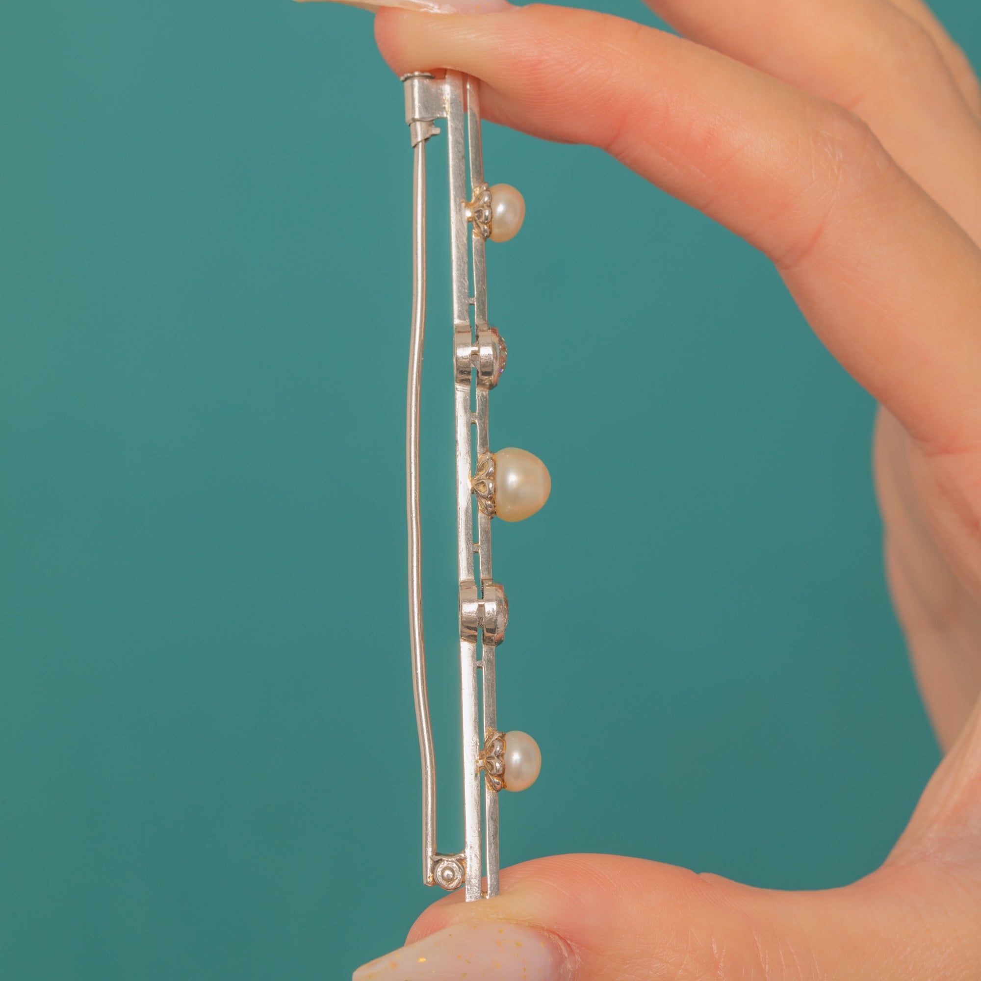 A refined Edwardian bar brooch in luminous Platinum, set with a graceful rhythm of Pearls and Old Mine Cut Diamonds. Two scintillating Diamonds, with a combined weight of approximately 1.20ct, alternate with creamy Pearls along the slender double-rail bar, while delicate milgrain edging around the collet-set Diamonds adds a whisper of texture and light.