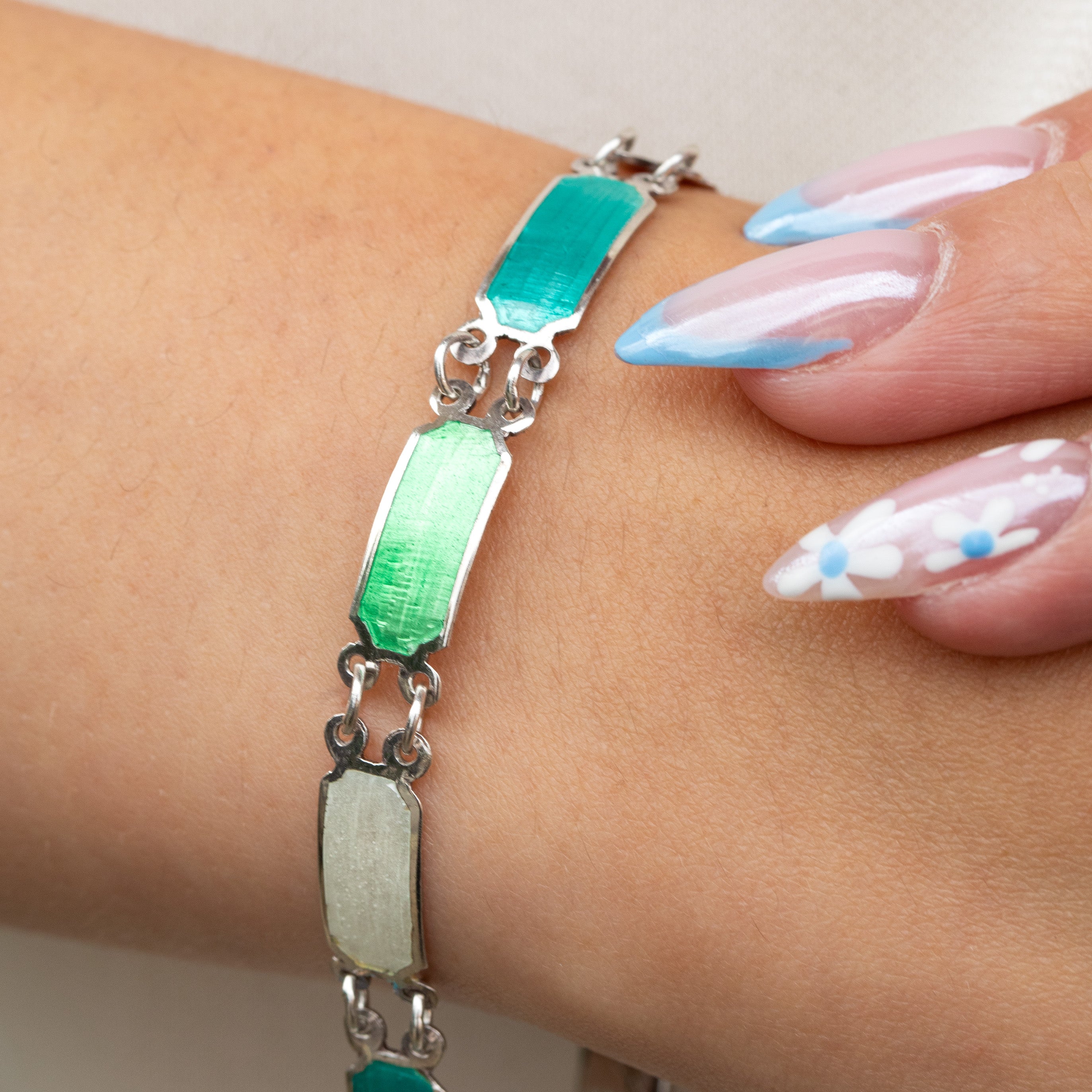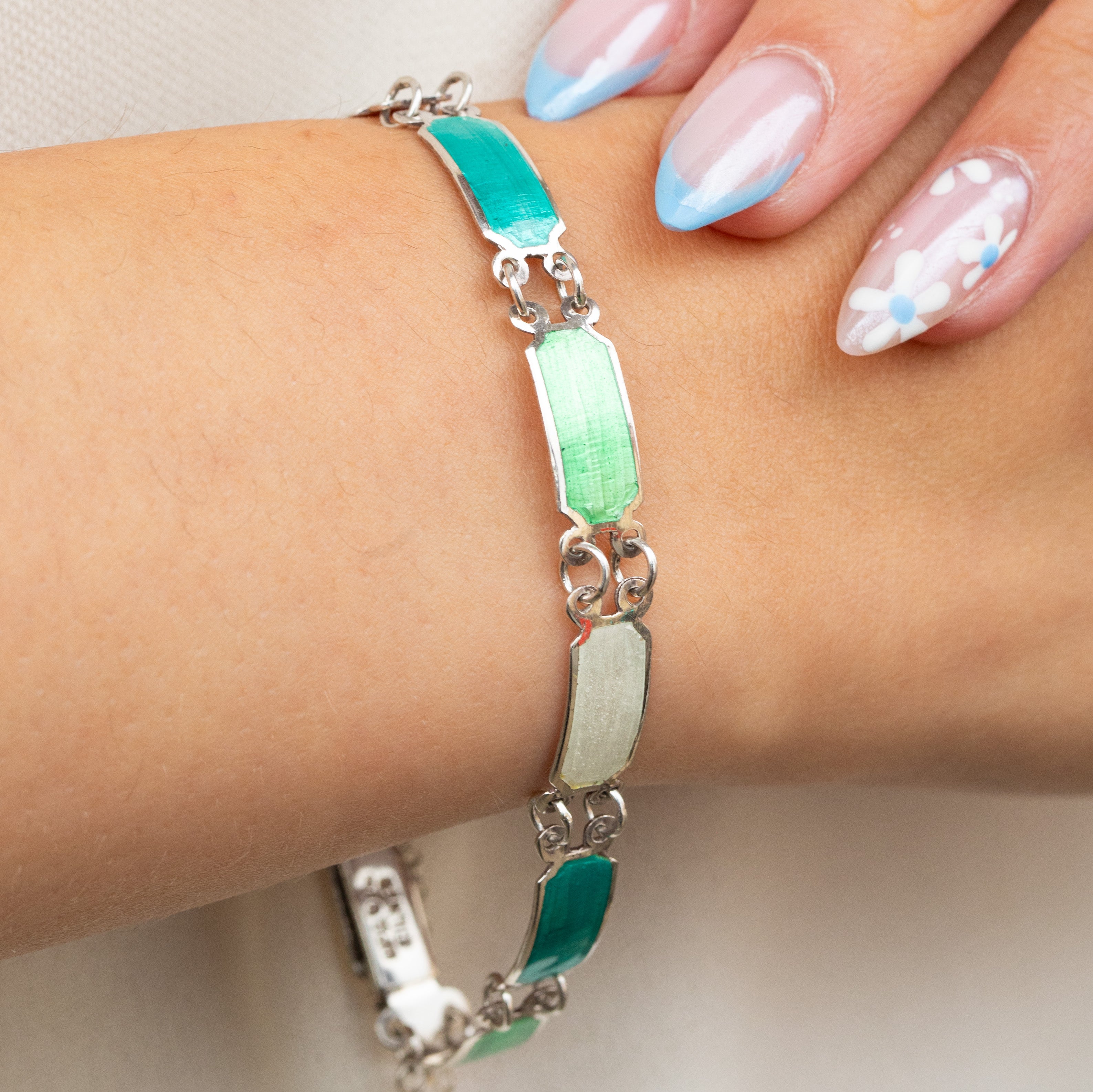 Sterling Silver Green & Powder Blue Enamel Panel Bracelet