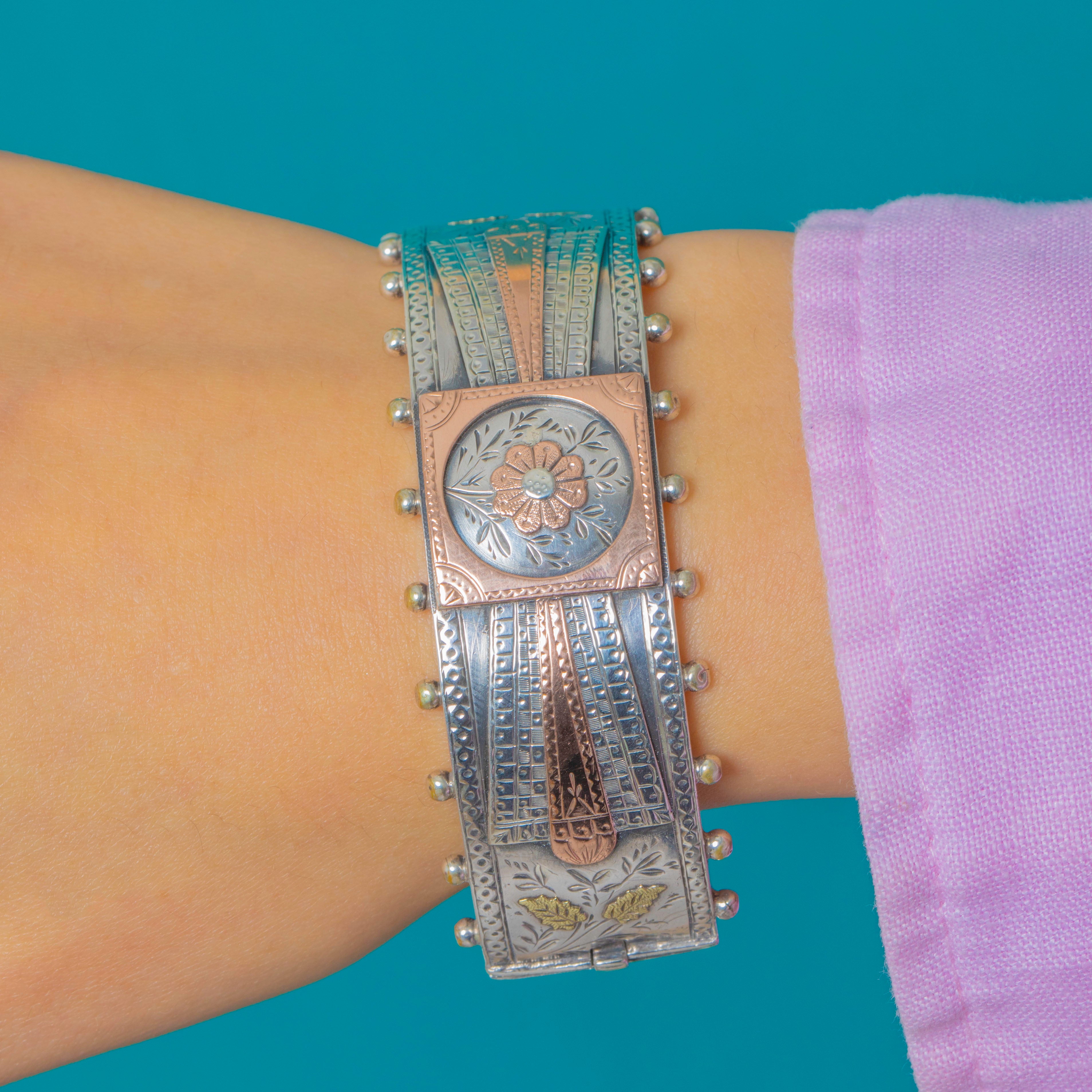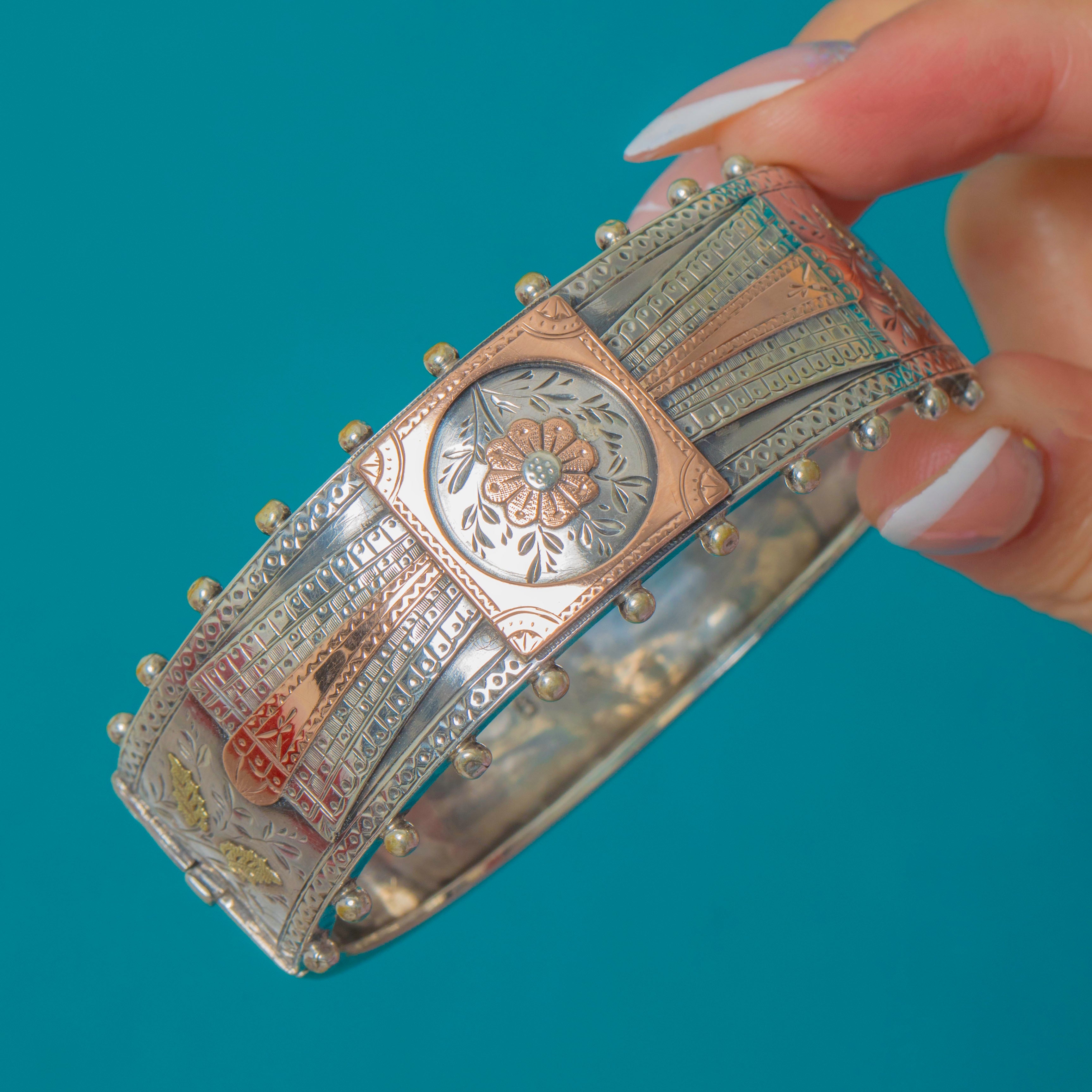 Sterling Silver Victorian Aesthetic Bangle with Rose Gold Floral Details c.1886