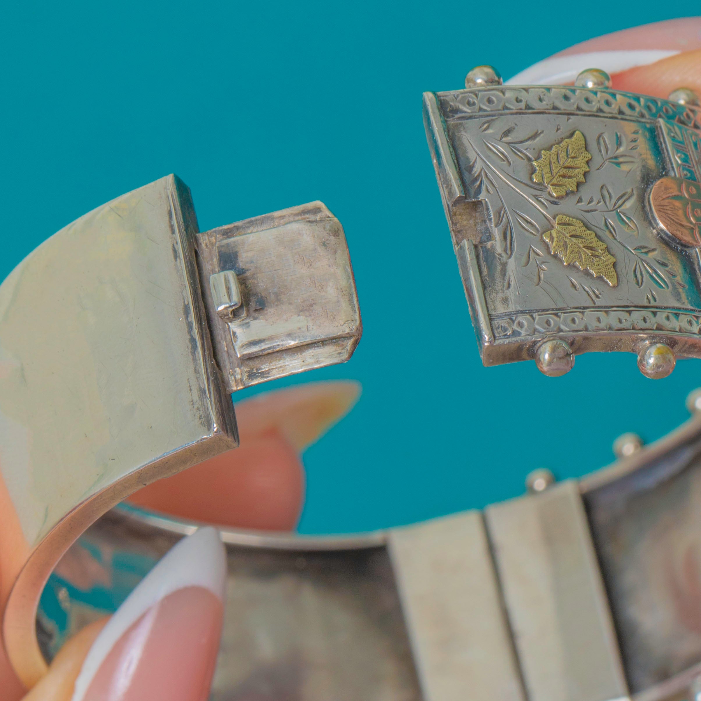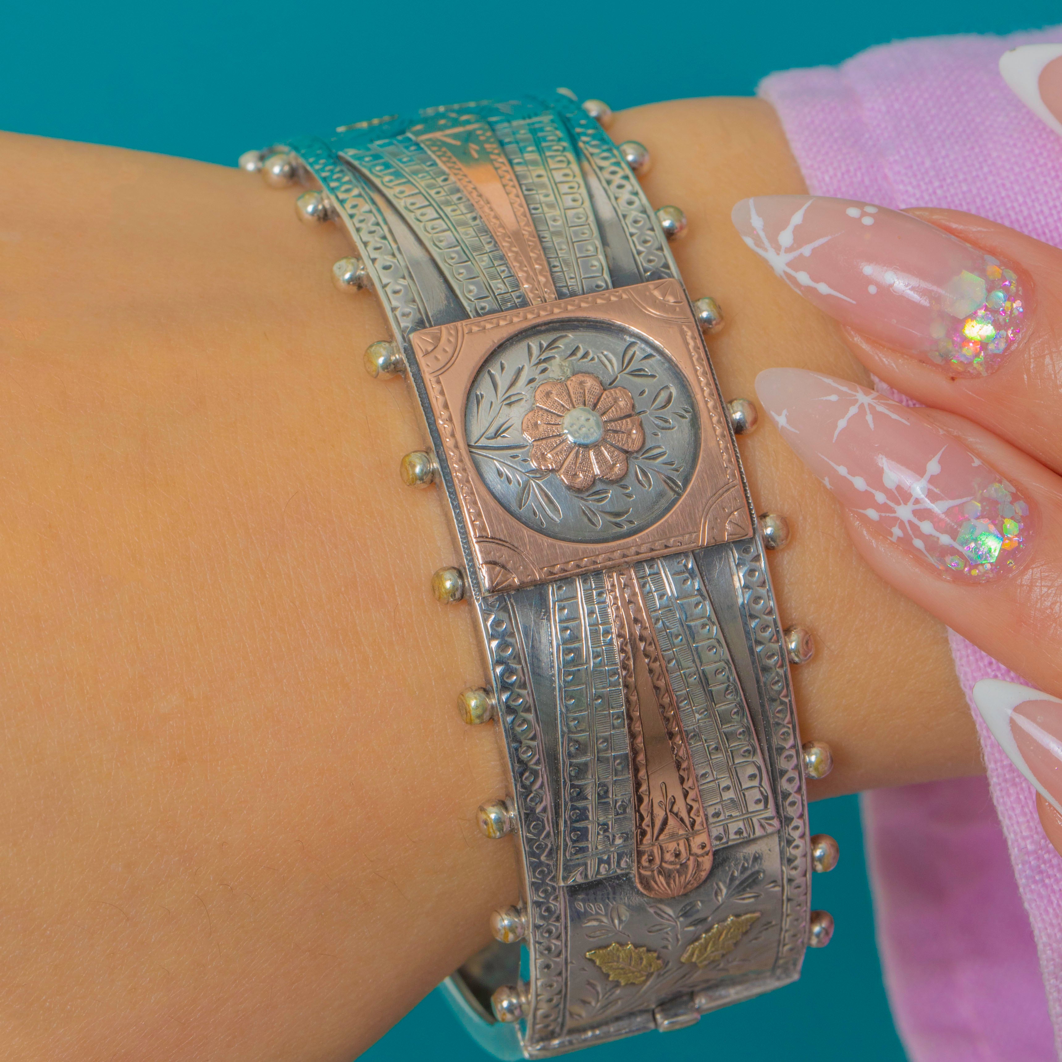 This Victorian Aesthetic bangle, dated 1886, showcases the ornate craftsmanship that defined the movement. Crafted in Sterling Silver and embellished with Rose Gold floral details and a striking beaded edge, it features beautiful contrasting textures and an expressive botanical design typical of the era.