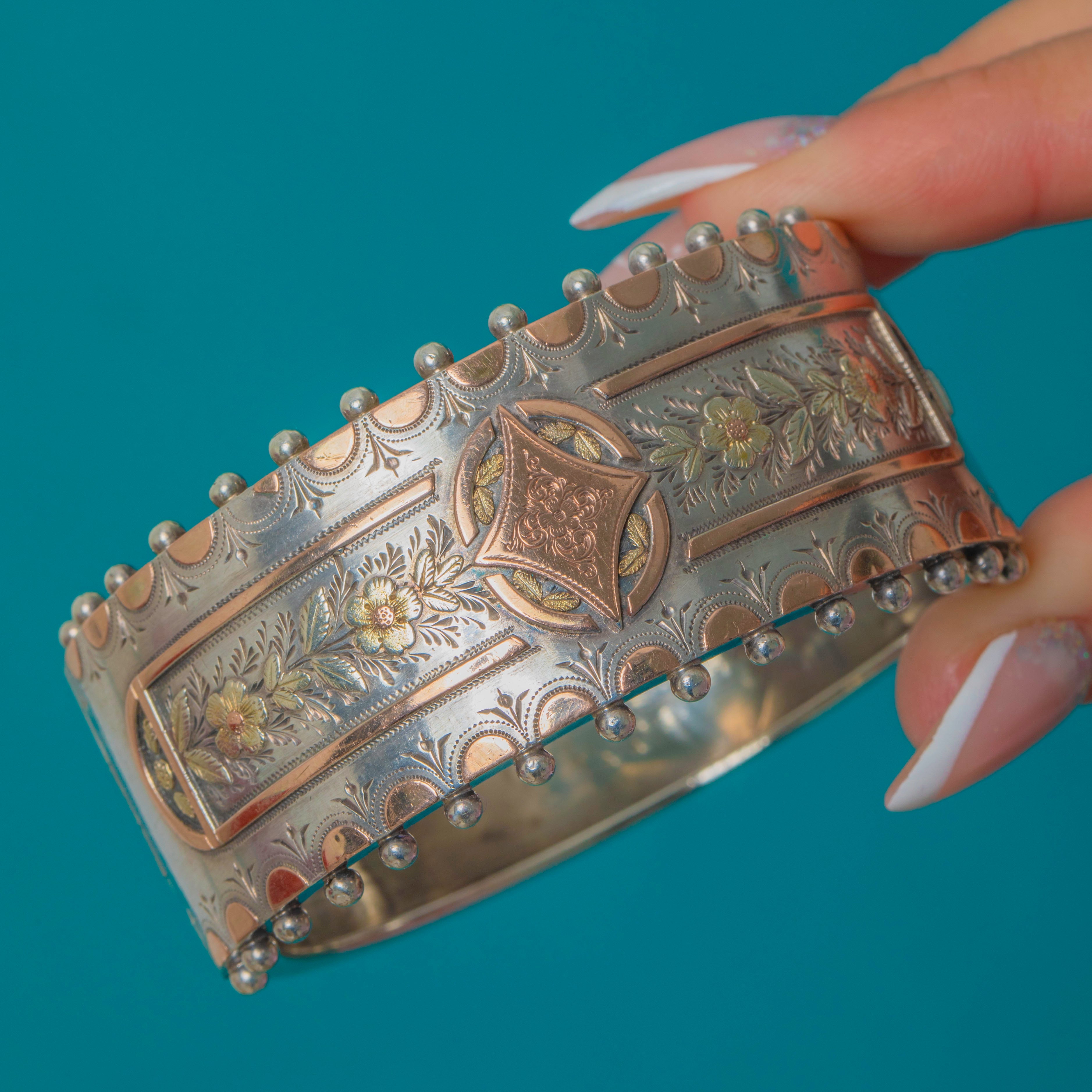 This Victorian Aesthetic bangle, dated 1885, is an exquisitely crafted piece combining Sterling Silver with warm Rose Gold geometric details. The bold, architectural design is characteristic of late-19th-century taste, with crisp engraving and contrasting precious metals creating a striking visual effect.