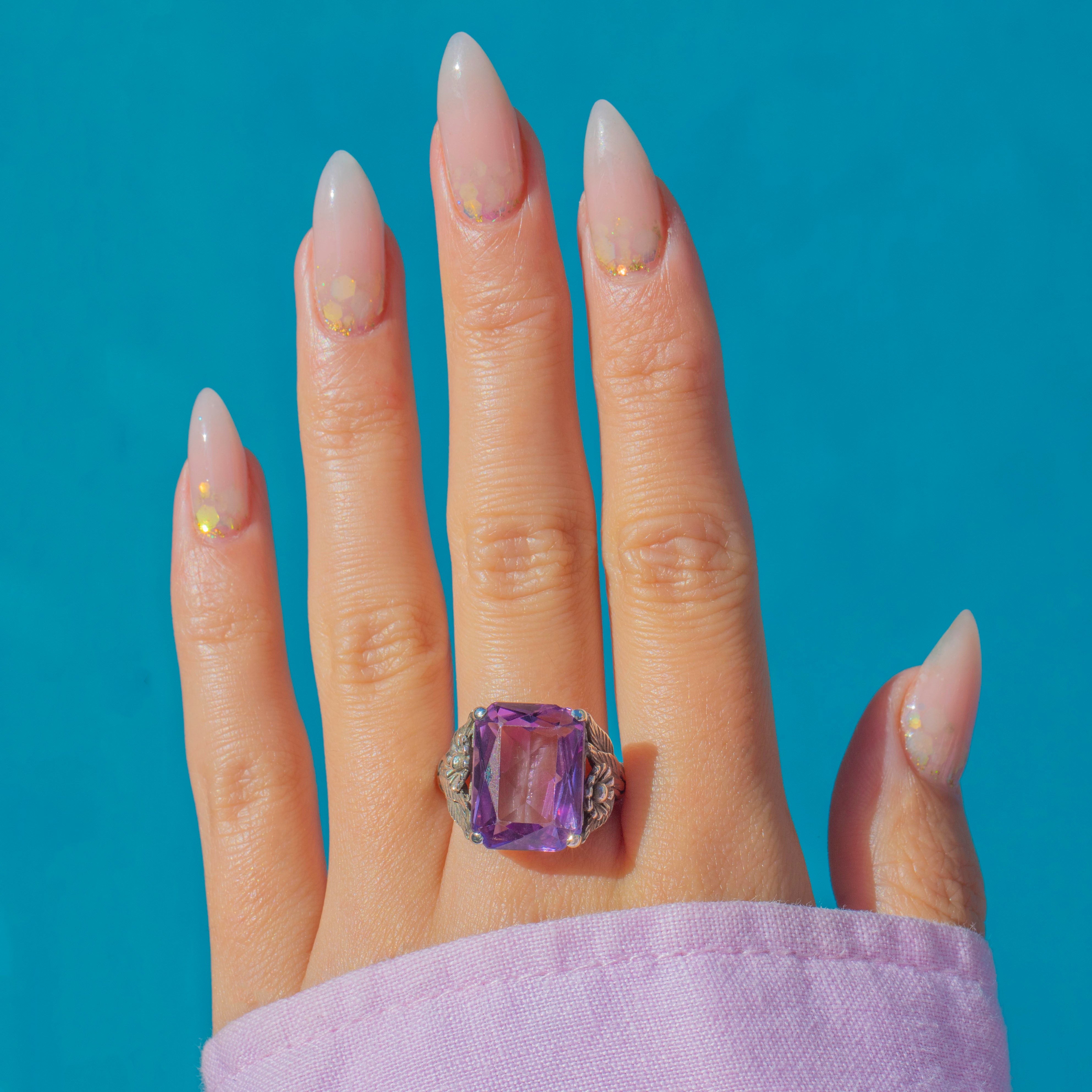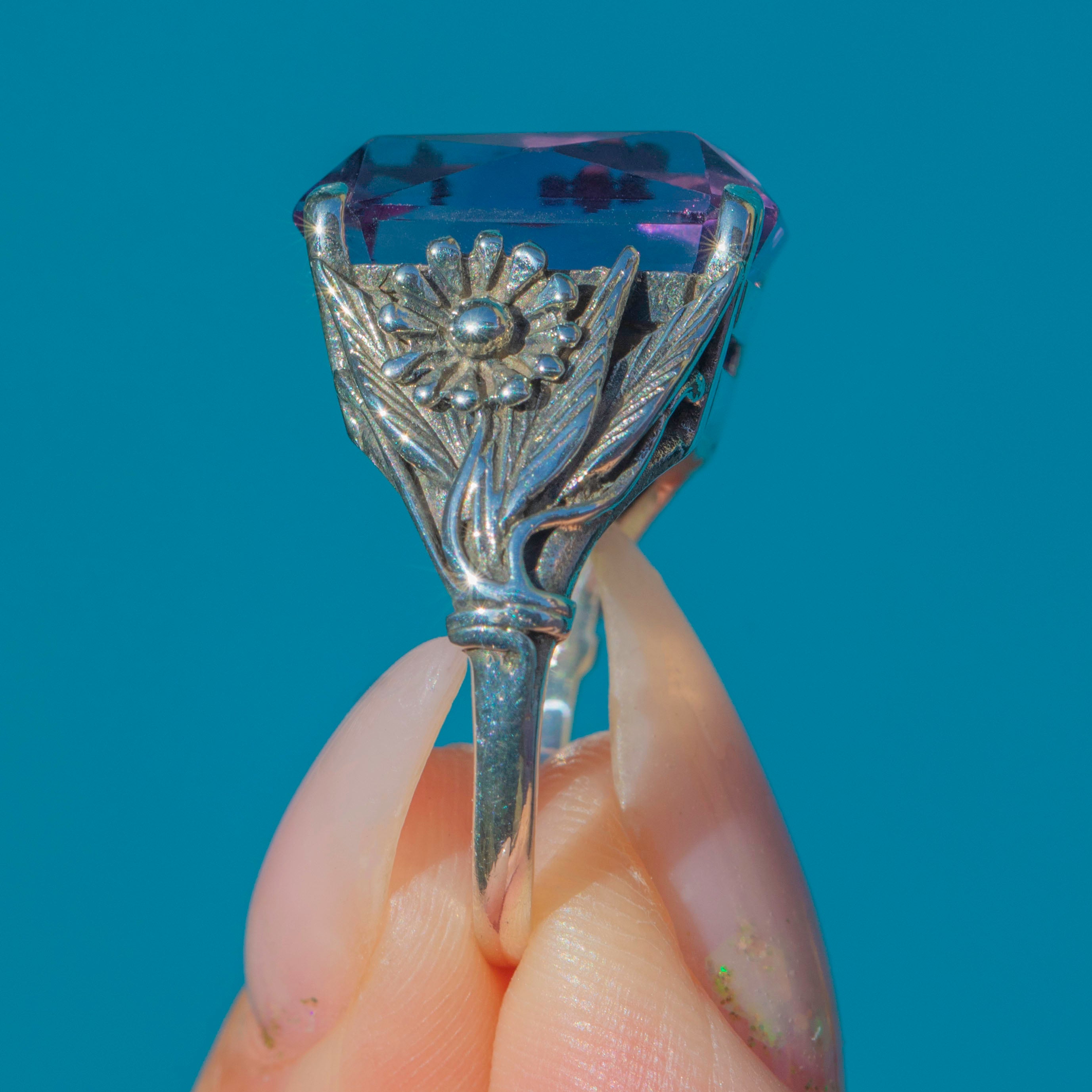 This striking Arts & Crafts ring is crafted in Sterling Silver and set with a rich purple 9.50ct Amethyst. The Amethyst has crisp facets that shimmer with deep violet tones, perfectly framed by the hand-worked Silver setting typical of the Arts & Crafts movement.