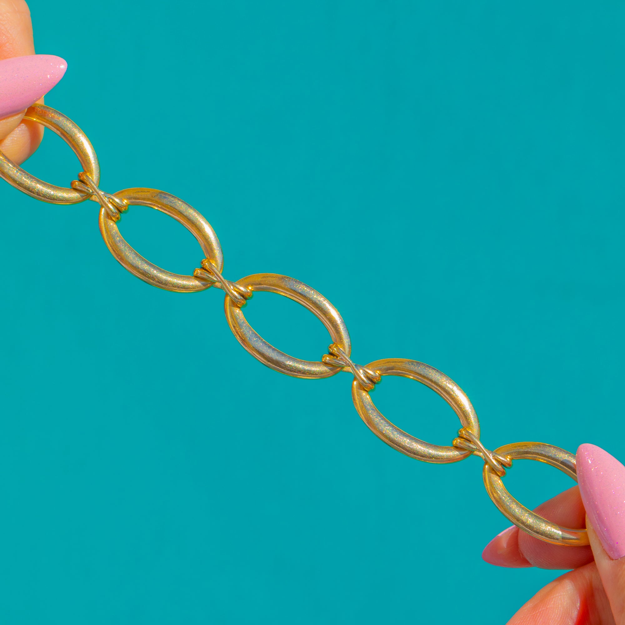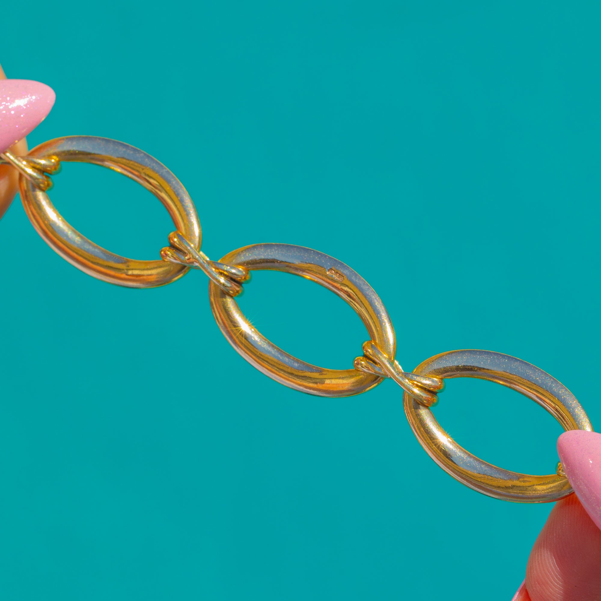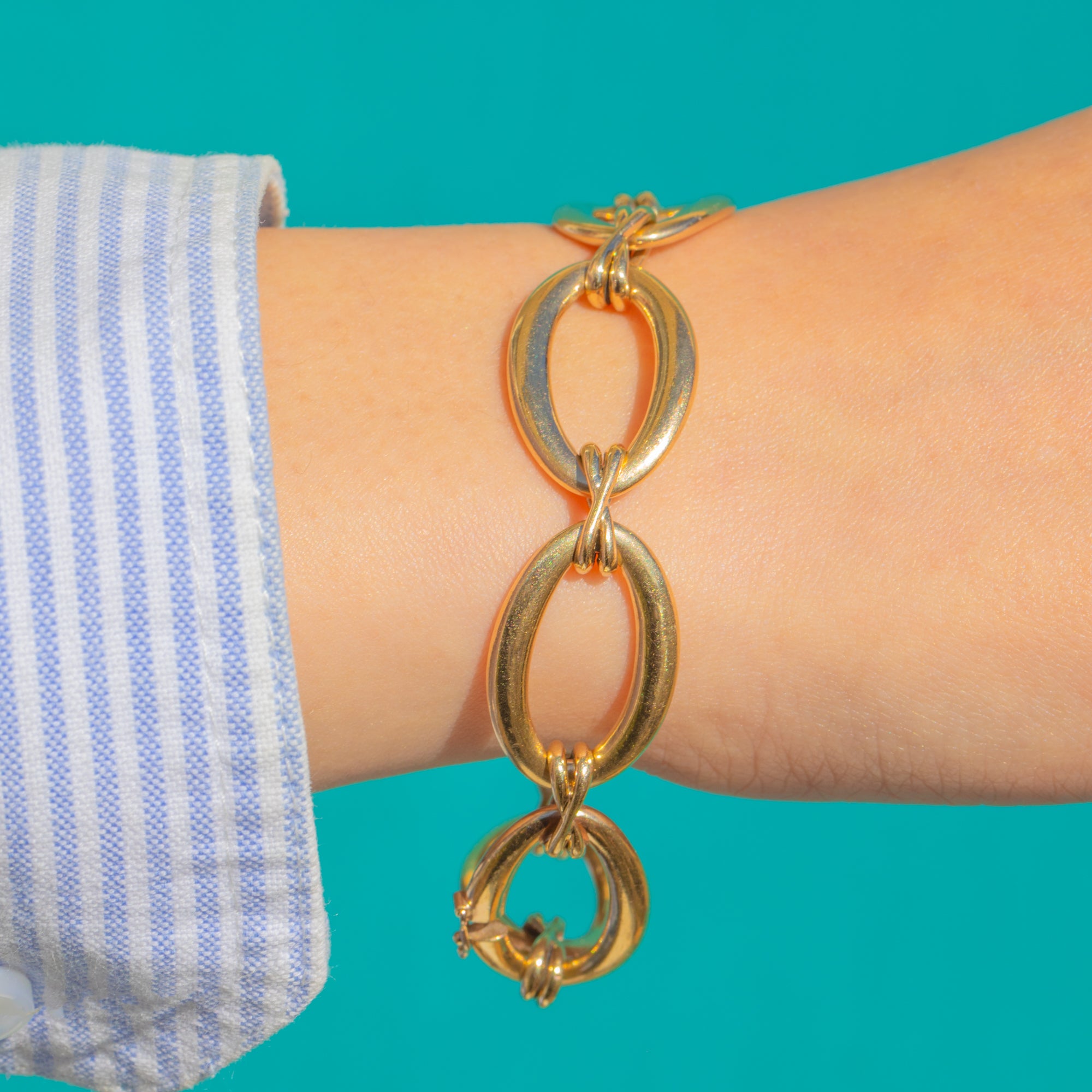 Bold and beautifully sculptural, this Vintage 9ct Gold Modernist bracelet delivers instant impact. Elongated oval links flow in a rhythmic sequence, each joined by neatly wrapped connectors for a clean, architectural look. The high-polish finish catches the light from every angle, while the generous scale creates a confident, contemporary silhouette with timeless appeal.