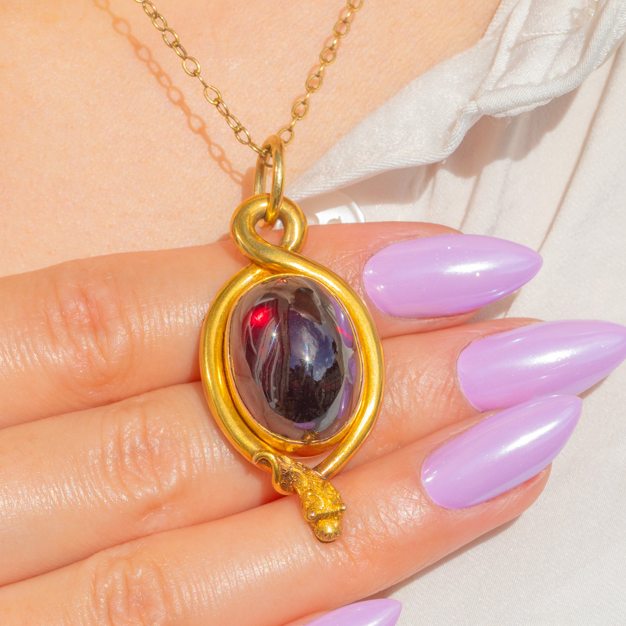 A sumptuous Victorian snake pendant in rich 18ct Gold, coiling protectively around a glowing 19.00ct Garnet cabochon. The high-domed oval Garnet moves from deep claret to near-black depending on the light, its smooth dome embraced by a continuous serpent bezel that loops seamlessly into the integrated bail. The sculpted, lifelike snake head crowns the design with exquisite detail, while the reverse reveals a locket back for that quintessential 19th-century flourish.