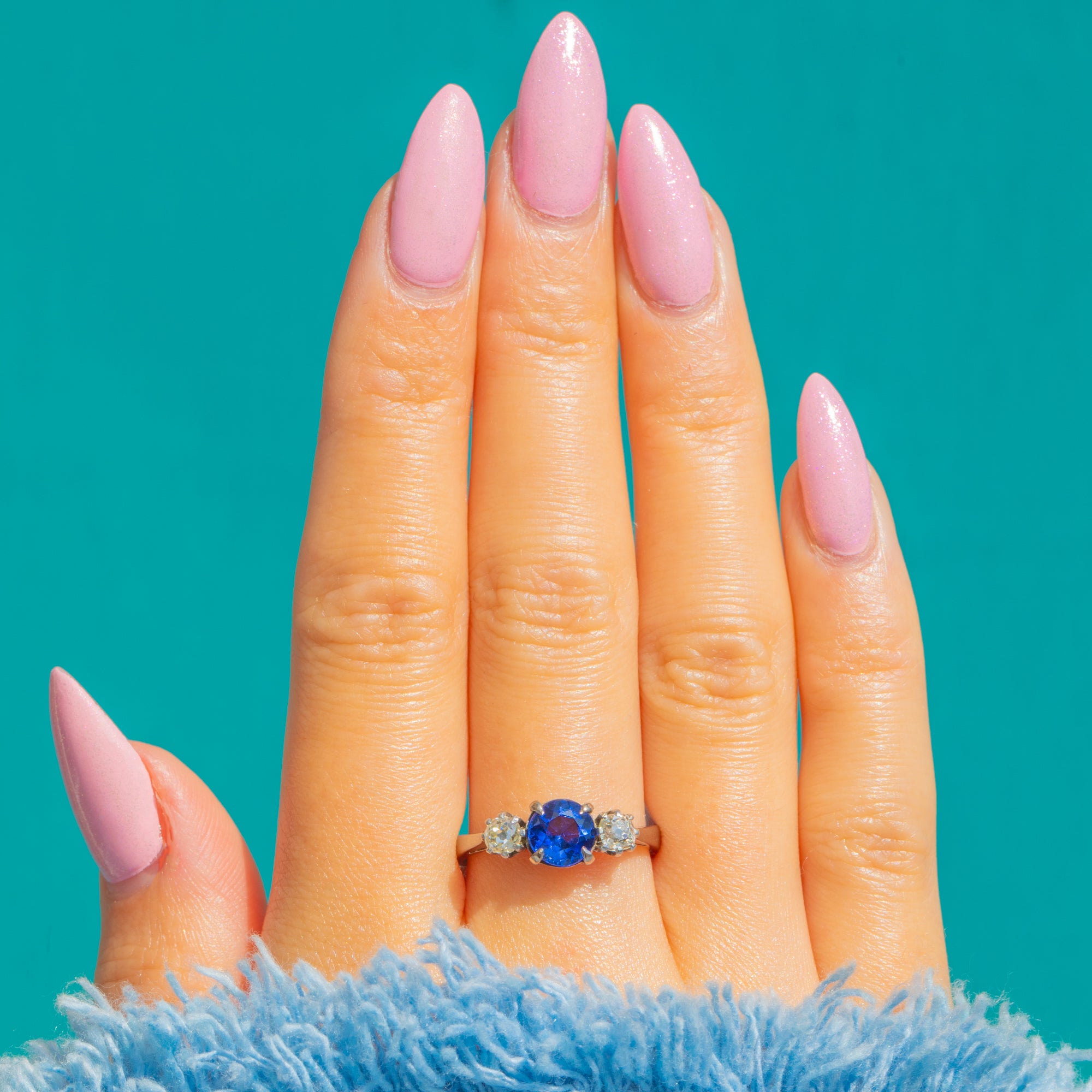 Timeless and impeccably proportioned, this classic three-stone composition offers crisp lines, luminous colour, and enduring sophistication—an Art Deco favourite that would make a superb engagement ring choice.