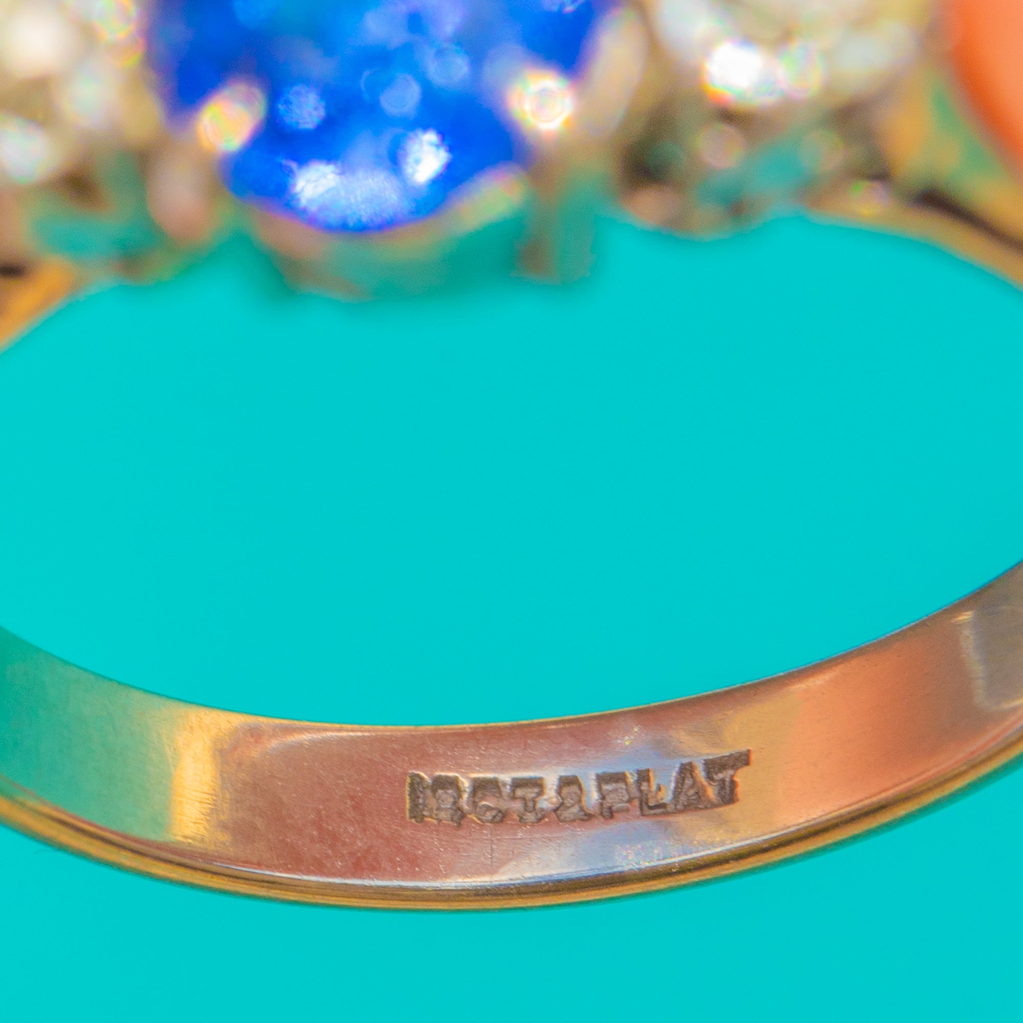 EXCELLENT: The Sapphire and Diamonds are bright and secure in their settings with no chips or visible abrasions. The Platinum settings and 18ct White Gold band show only light surface wear, consistent with careful wear, and the shank remains strong and well-shaped. No evidence of previous resizing.