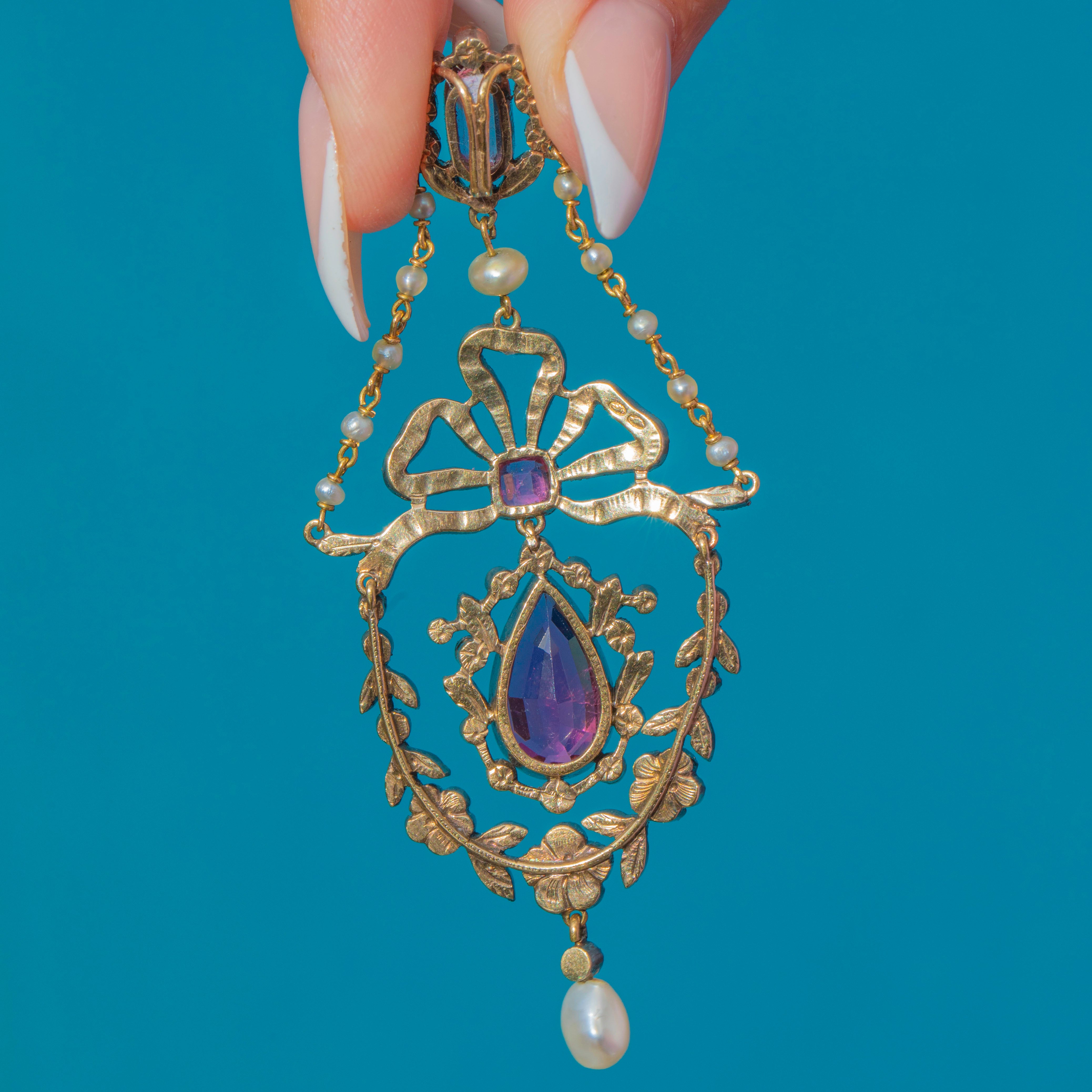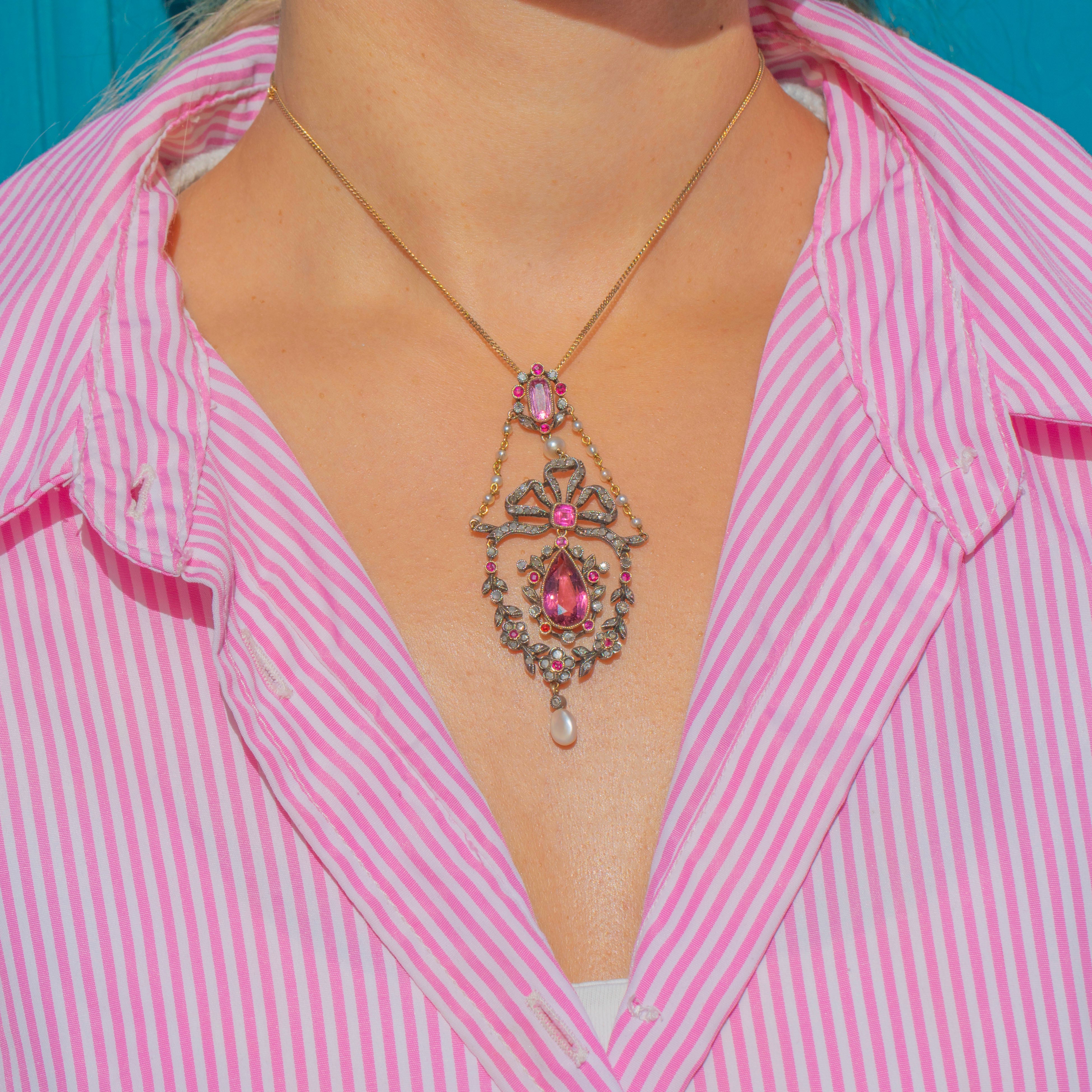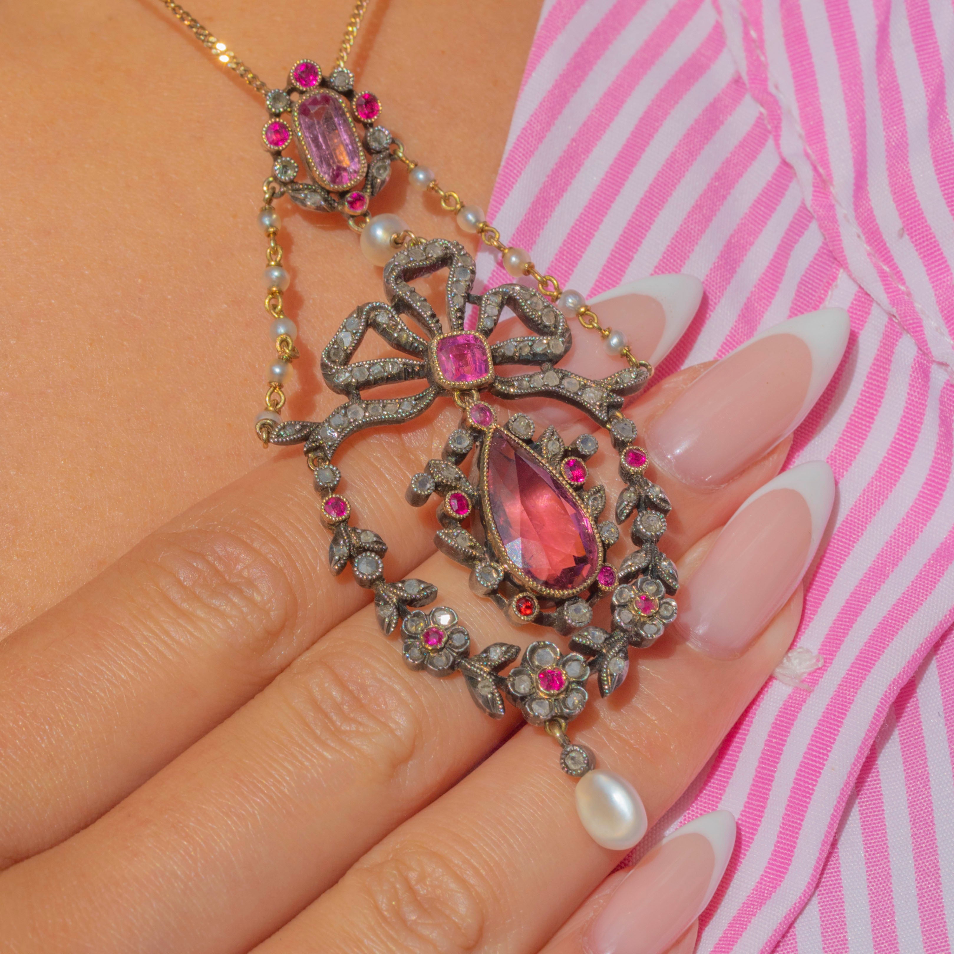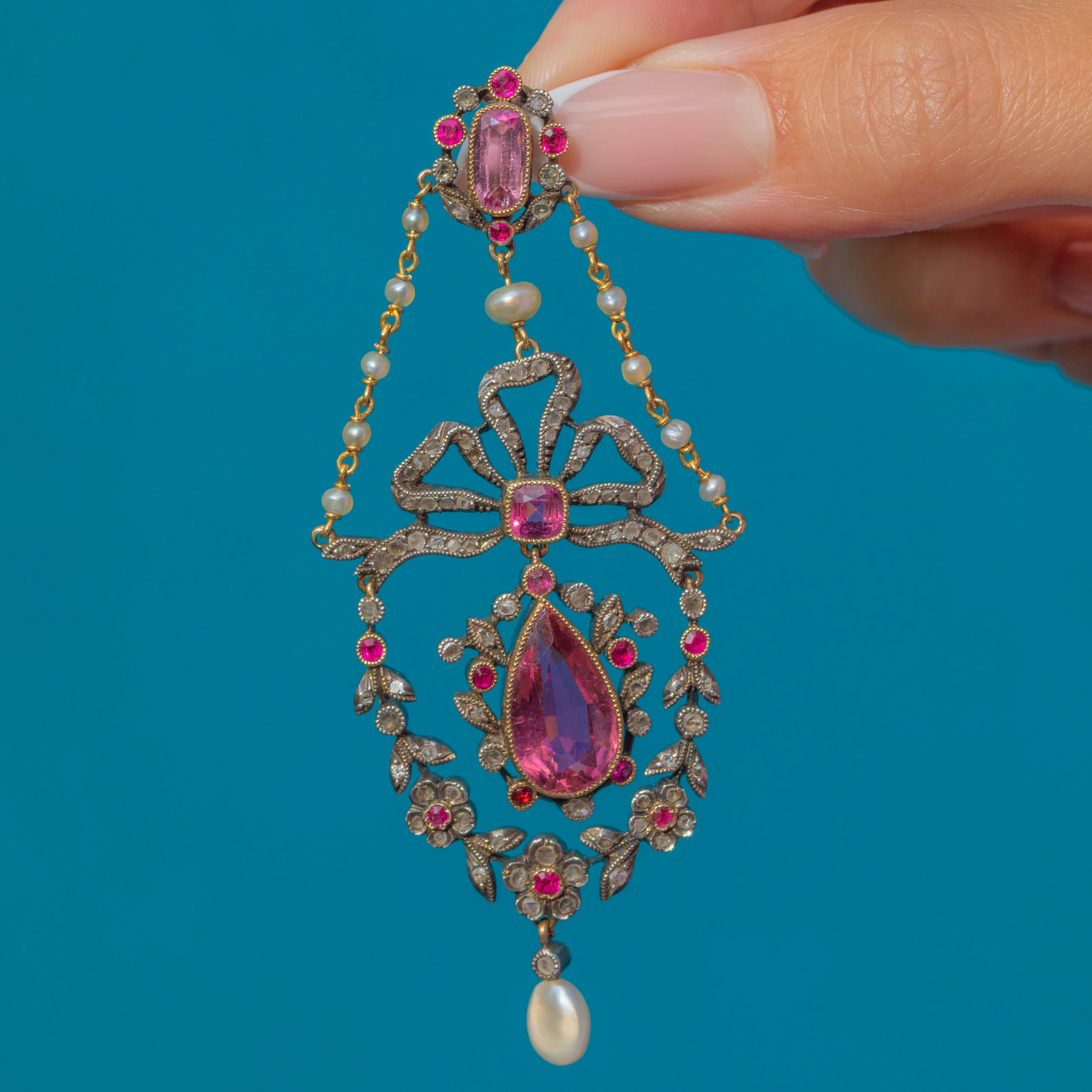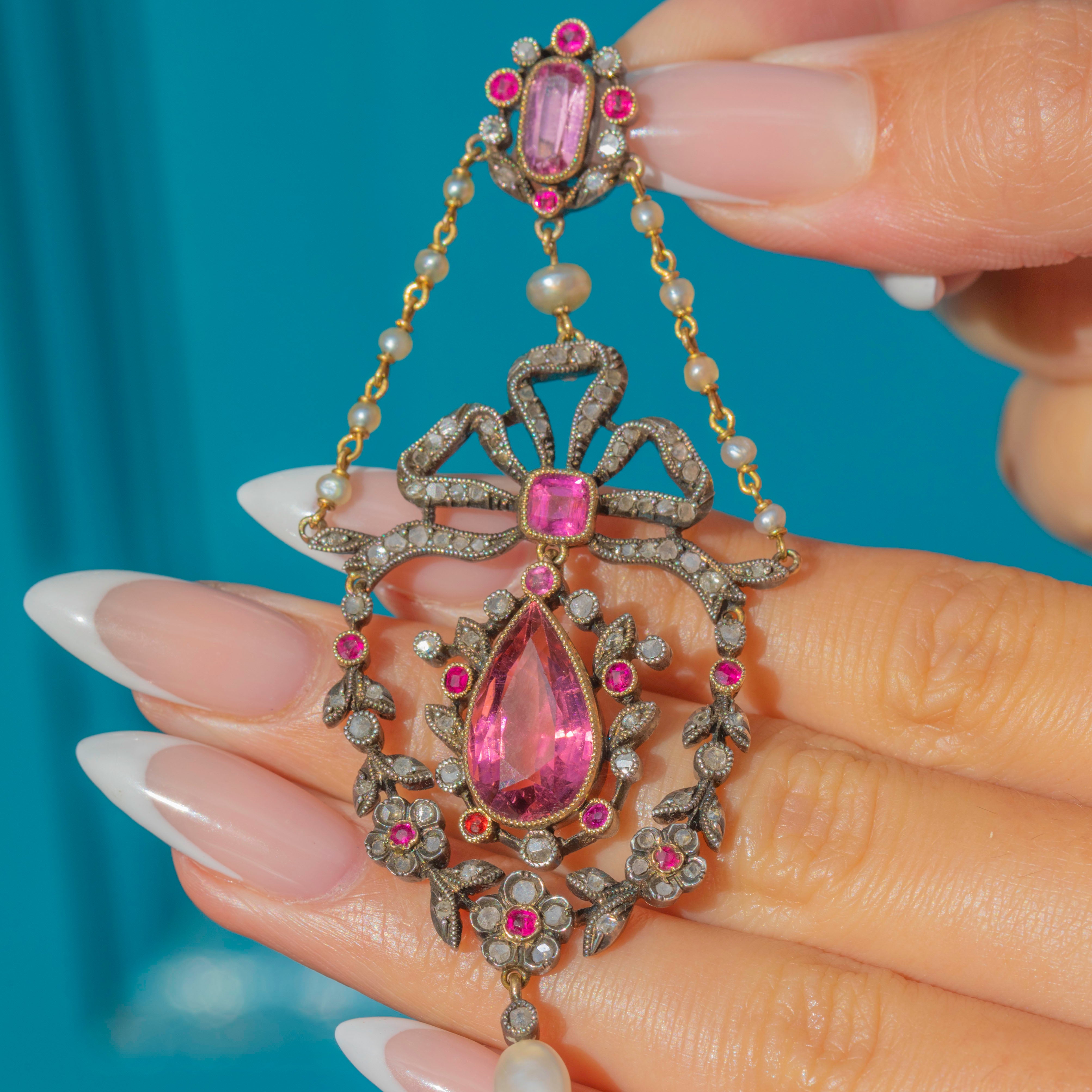 This superb French Belle Époque pendant is a true masterpiece of late 19th-century jewellery design. Crafted in 18ct Gold with Silver settings, it dazzles with vivid Pink Tourmalines, shimmering rose-cut Diamonds and luminous natural Pearls. The feminine bow and garland of flowers reflect the elegance and exquisite craftsmanship of the Belle Époque era, making this a jewel of exceptional beauty and rarity.