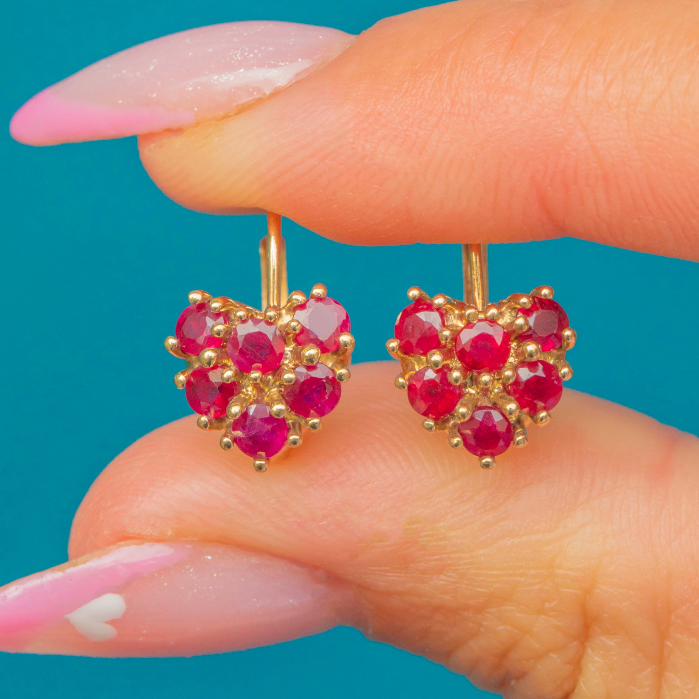 MEASUREMENTS: Earrings measure 15mm long including hooks, hearts are 9mm x 9mm, and 8.5mm wide overall. Rubies are approximately 2.5mm in diameter.