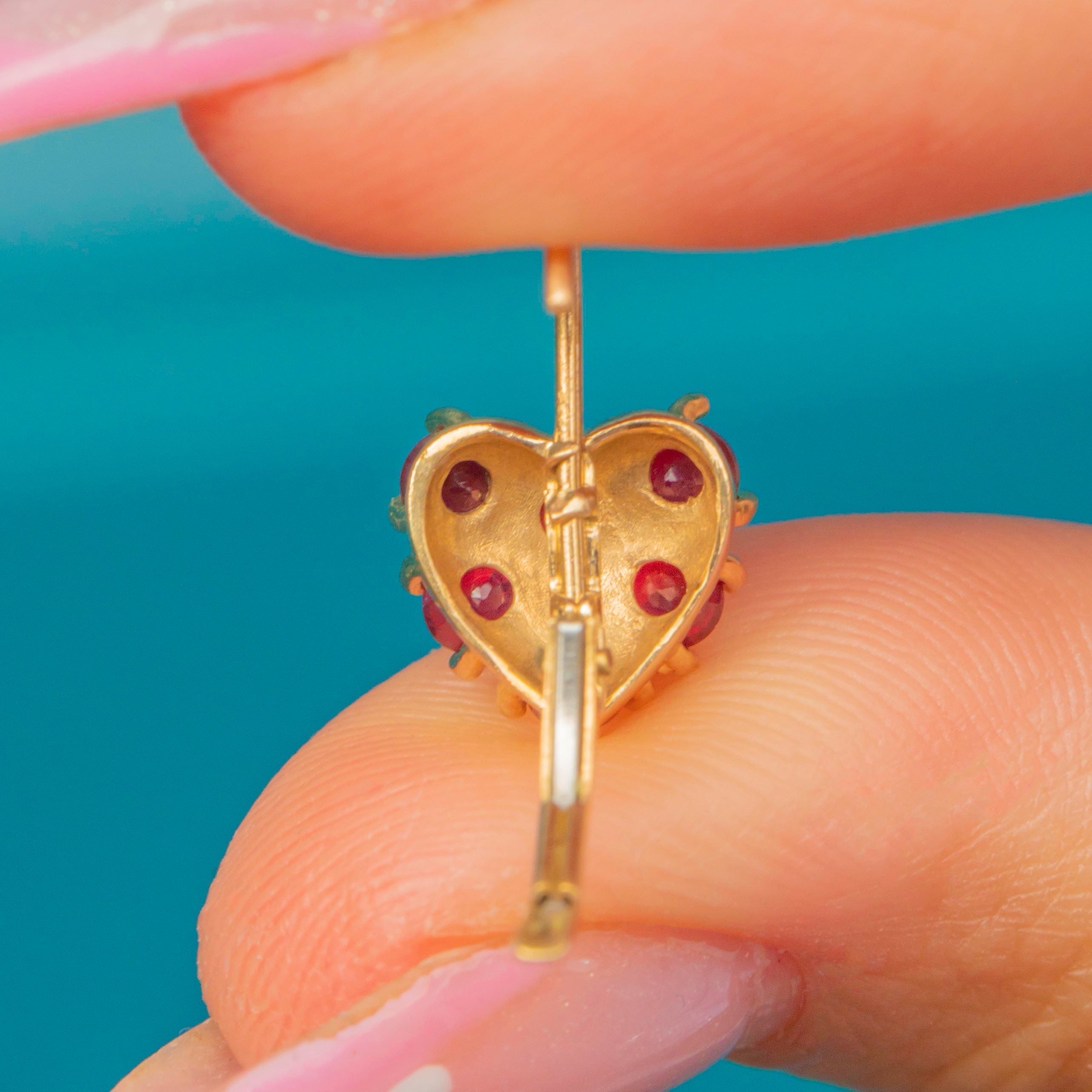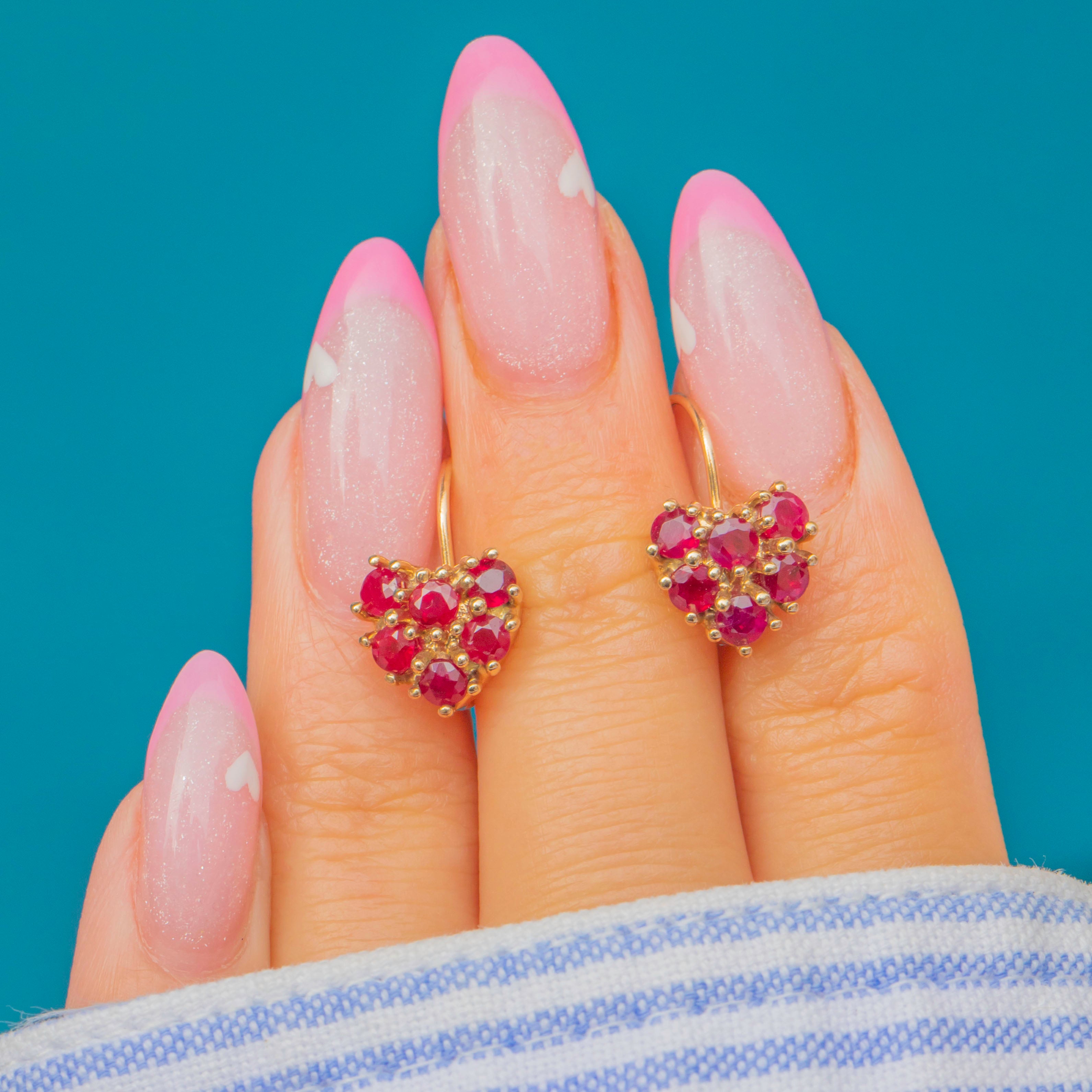 These sweet Ruby pavé heart earrings are crafted in glowing 10ct Gold and finished with secure lever-back fittings for everyday comfort. Each heart is set with a cluster of vivid pinkish-red Rubies, each approximately 2.5mm in diameter, that shimmer with lively sparkle against the warm Gold backdrop.