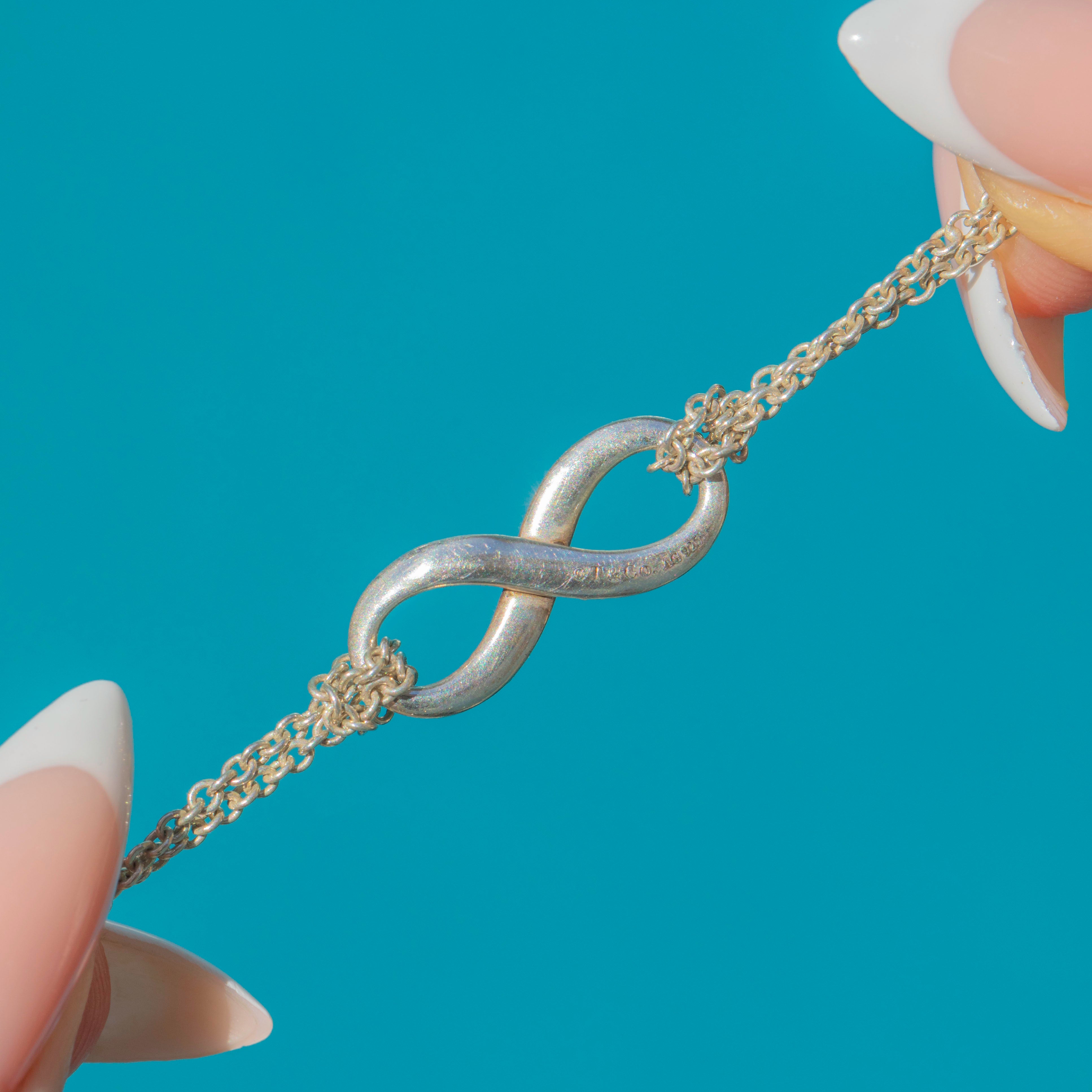 STAMPS: “AG925” on chain link near bolt-ring, “T&Co AG925” on infinity loop, “C T&Co AG925” and “SG925” on tag next to clasp