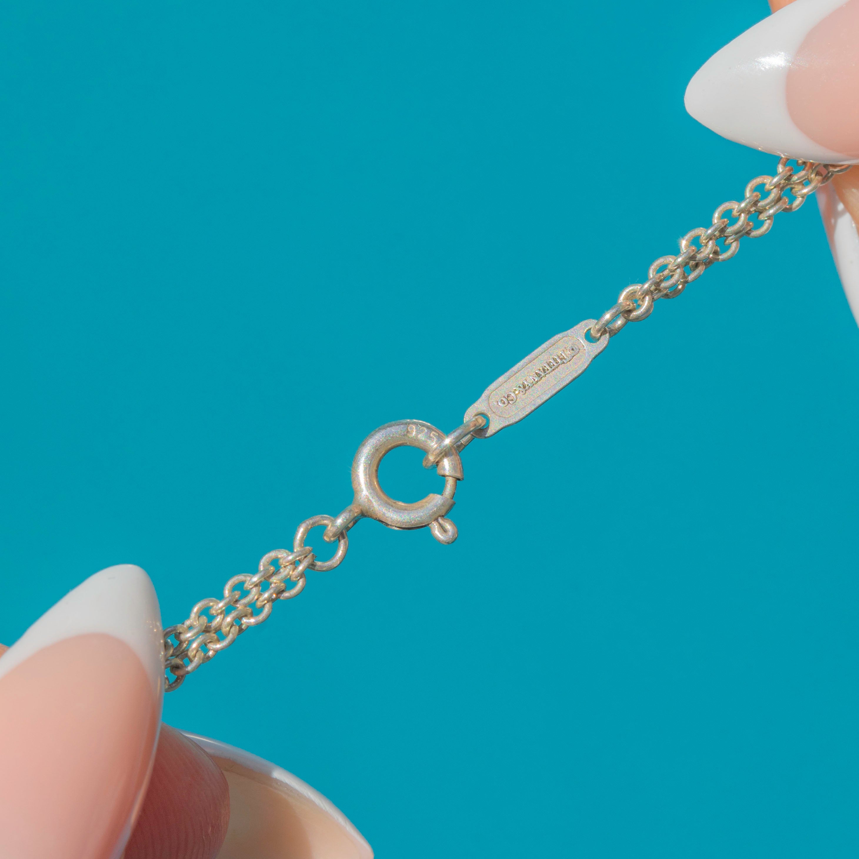 The double Silver chain adds a luxurious weight and drape, while the bright Tiffany turquoise-blue enamel ensures this piece stands out in any jewellery collection. Instantly recognisable, it carries all the hallmarks of Tiffany craftsmanship and enduring appeal.