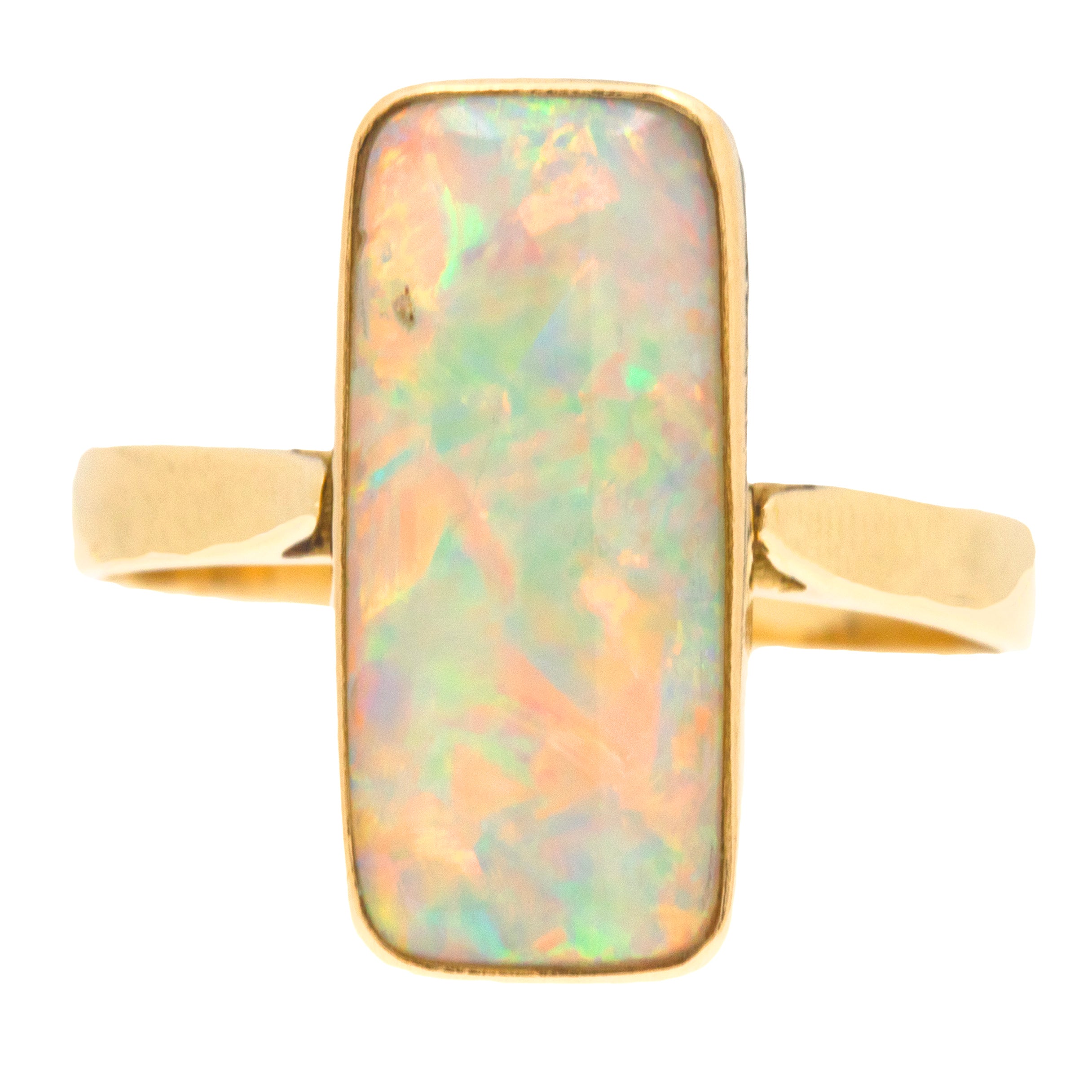 VERY GOOD. This vibrant 14ct Gold rectangular Opal panel ring is in very good condition. The Opal doublet is secure in her bezel setting and free from chips or surface wear. This ring was likely converted from something else and there is evidence of this under the setting, however, this does not affect the integrity of the piece and it cannot be seen while the ring is worn. The Gold is buttery and smooth throughout and the robust band will allow you to wear this striking vintage Opal ring comfortably!