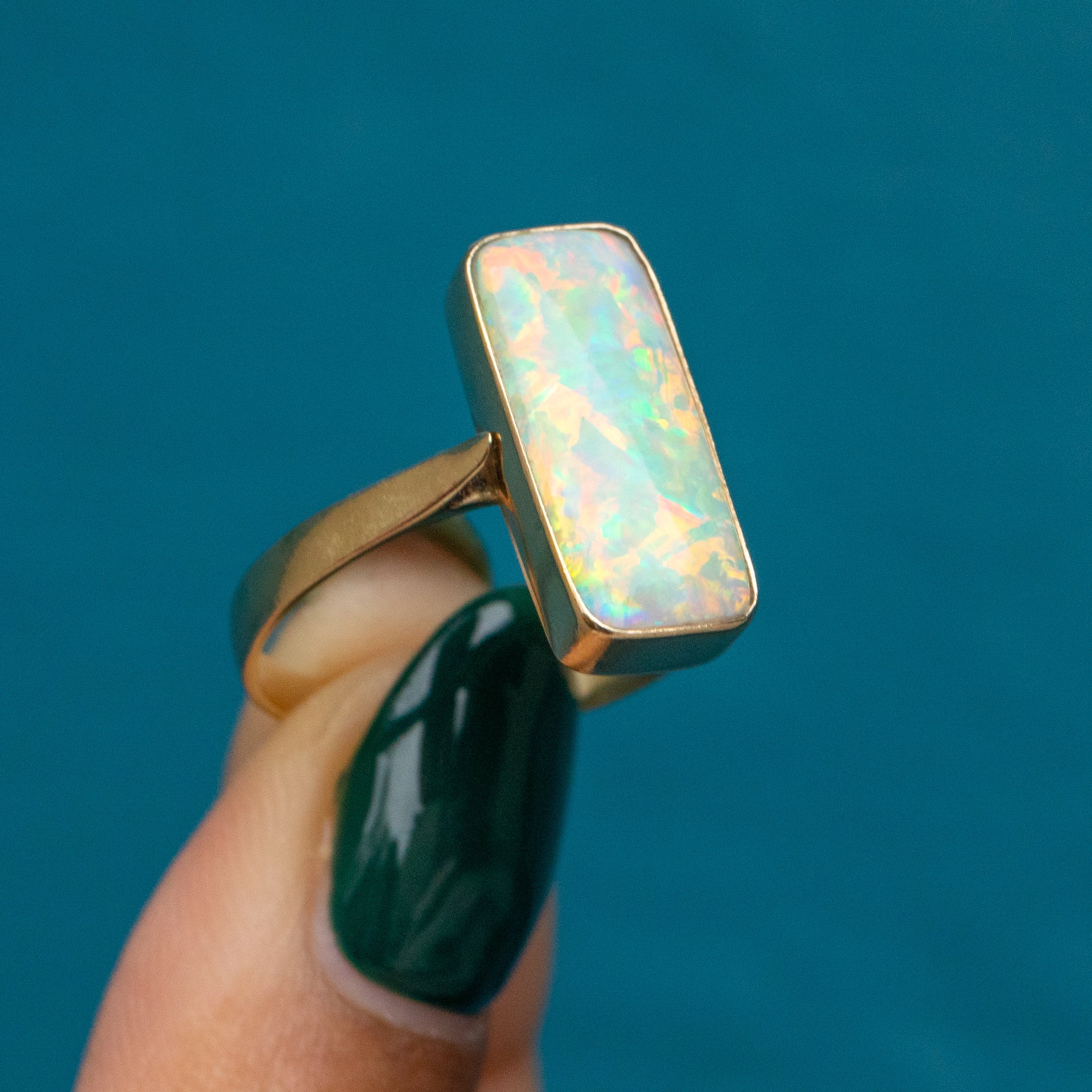 This stunning vibrant 14ct Gold rectangular Opal panel ring, boasting 6.02ct, will turn heads from afar! The elongated design allows a firework display of neon pinks, shimmering oranges, and flashes of greens to shimmer across your finger as the Opal catches the light.