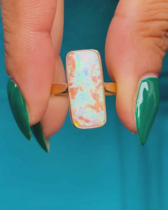 Vibrant 14ct Gold Rectangular Opal Panel Ring, 6.02ct Opal Doublet