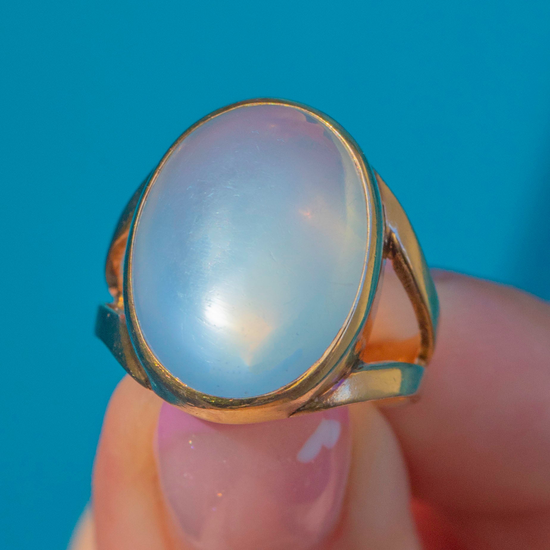 VERY GOOD: The Moonstone is securely set with gorgeous adularescence and a soft blue hue. Minor surface wear consistent with age. The Gold mount is strong and well-made with no evidence of previous resizing.