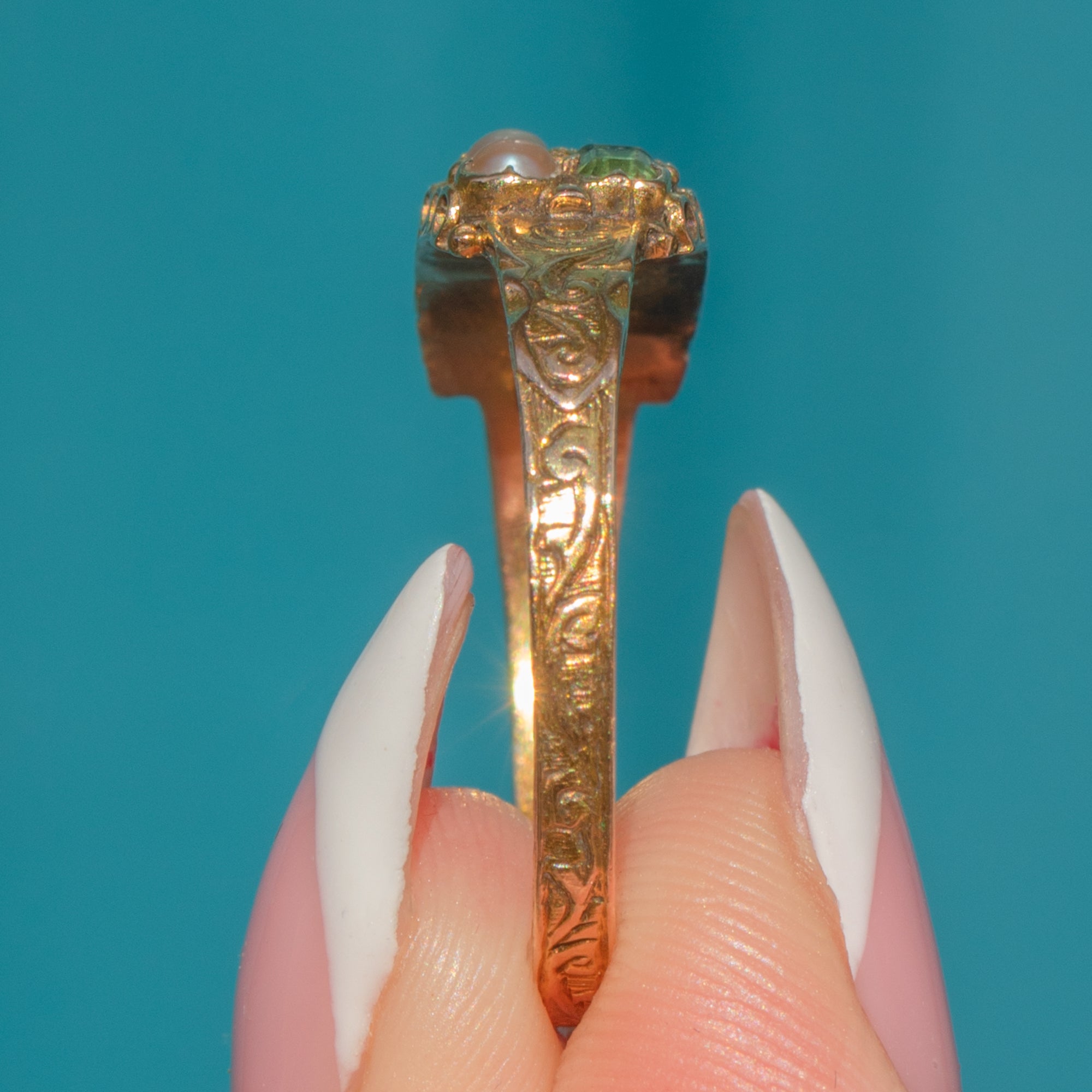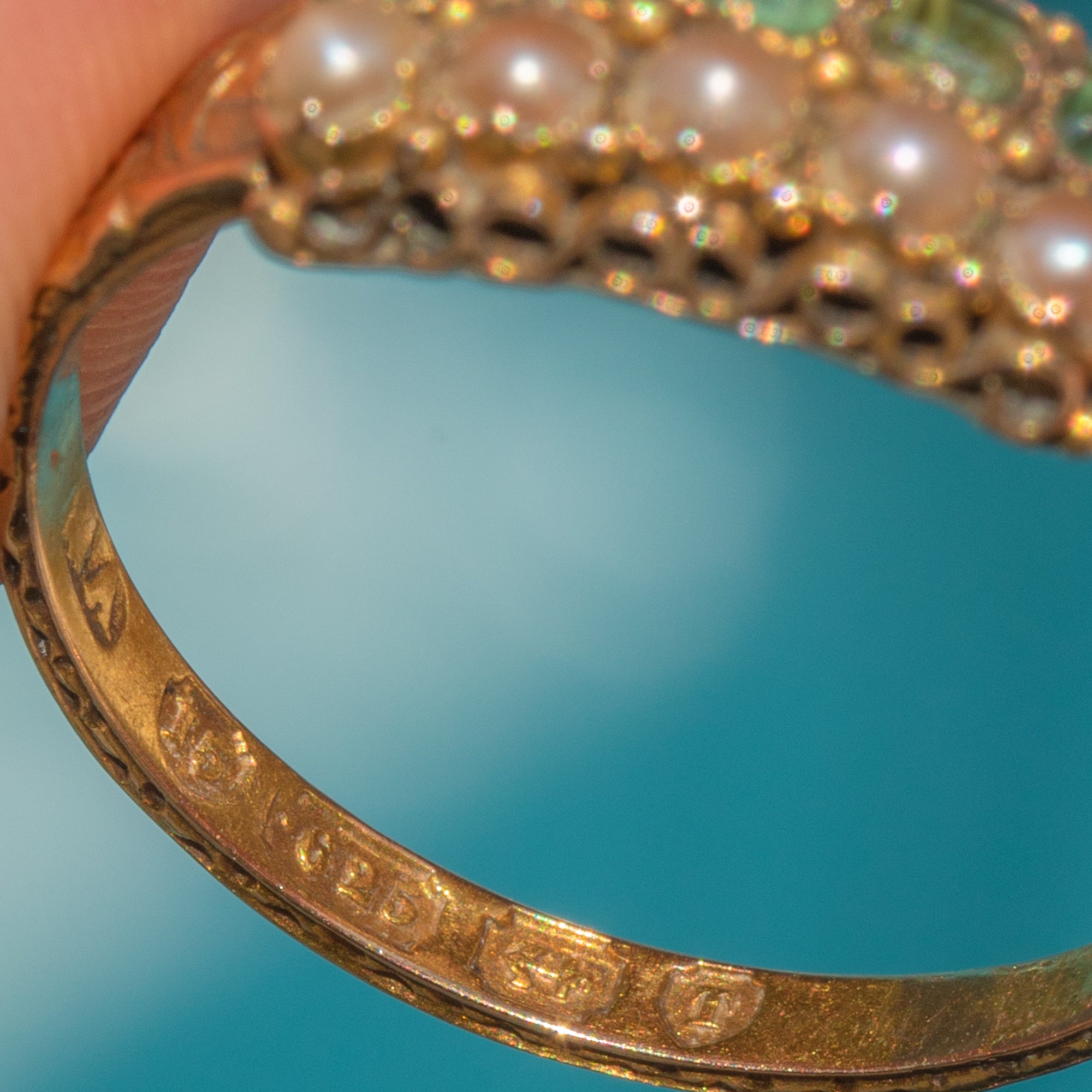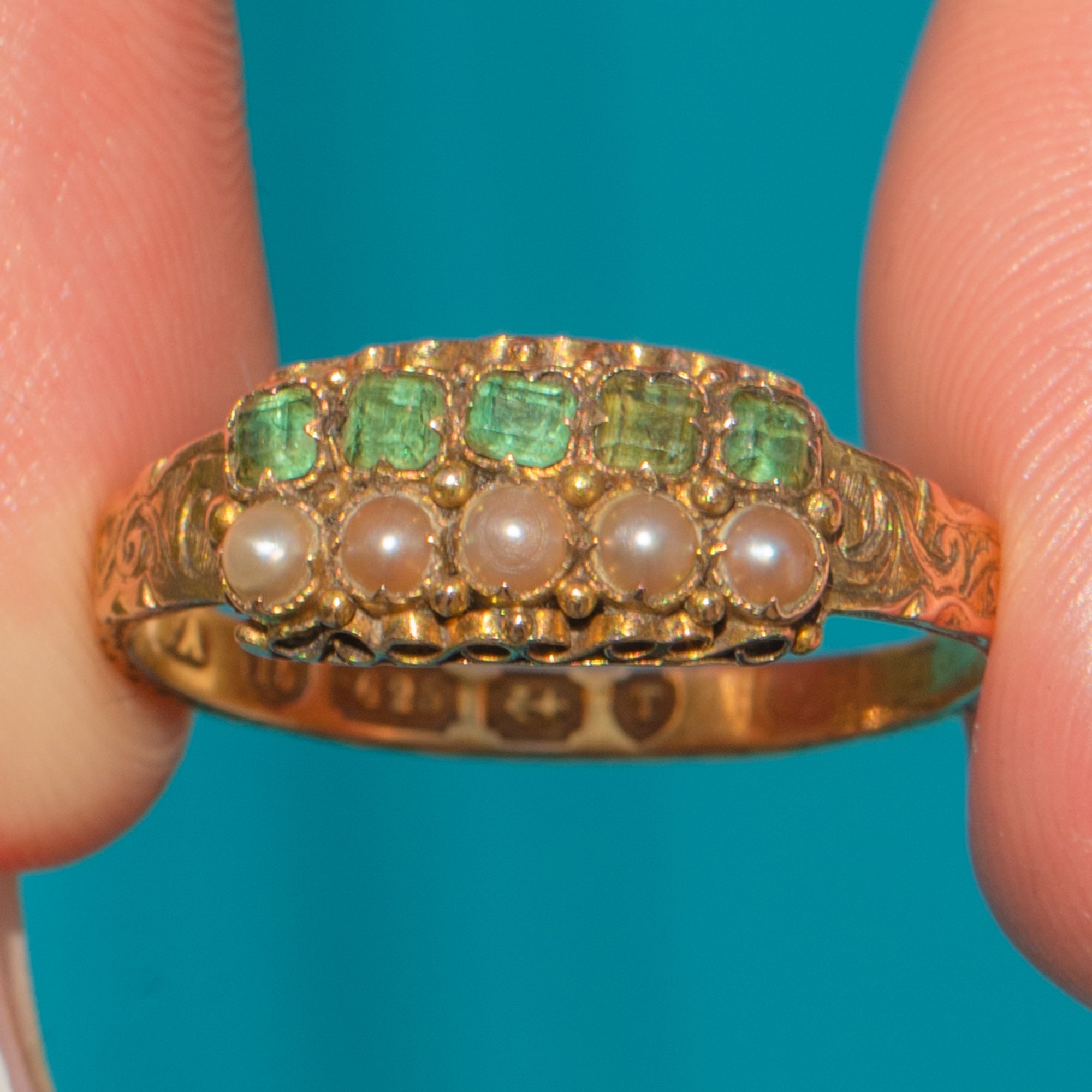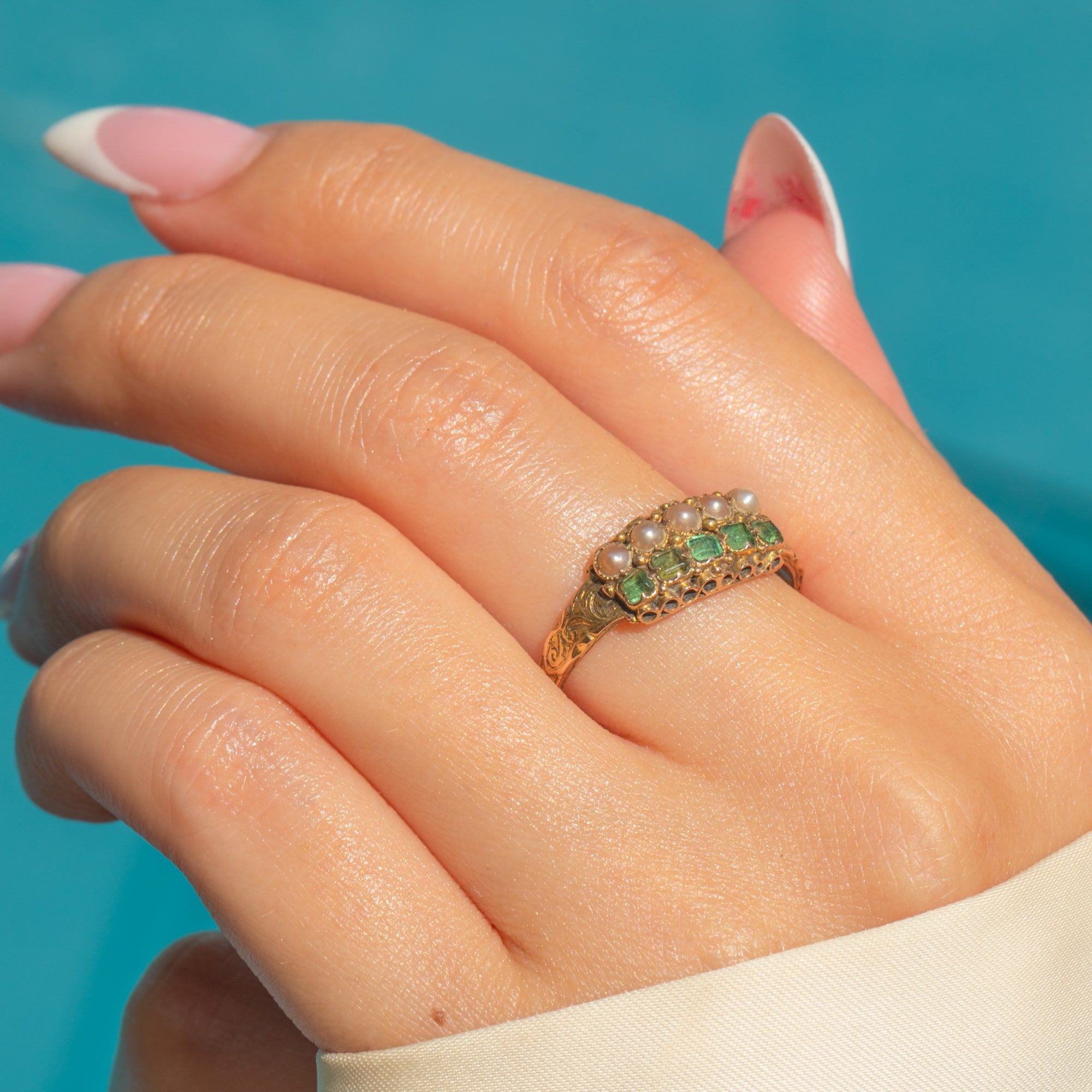 This ornate Victorian ring, hallmarked 15ct Gold and dated 1868, features a beautiful arrangement of vibrant Emeralds and lustrous Pearls.