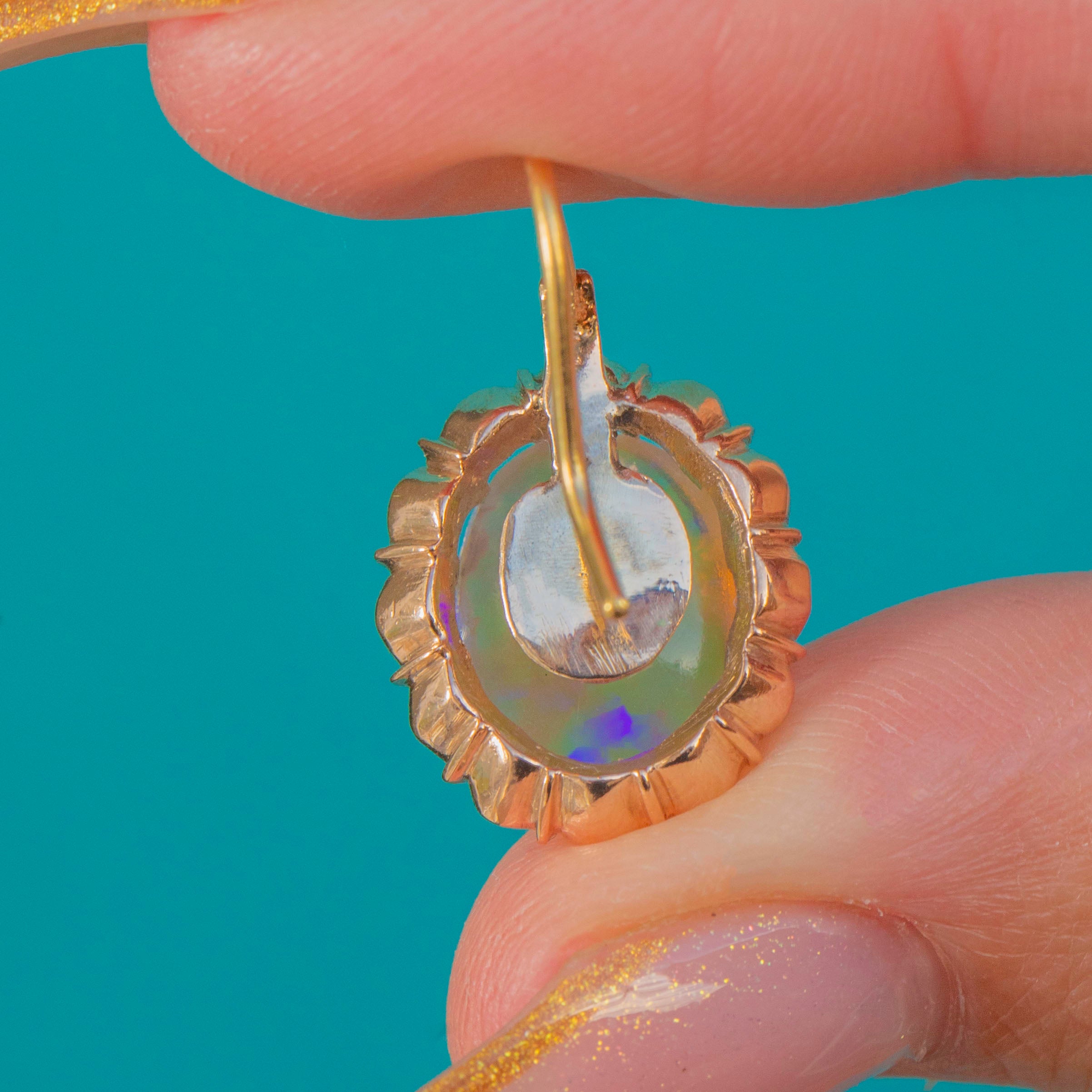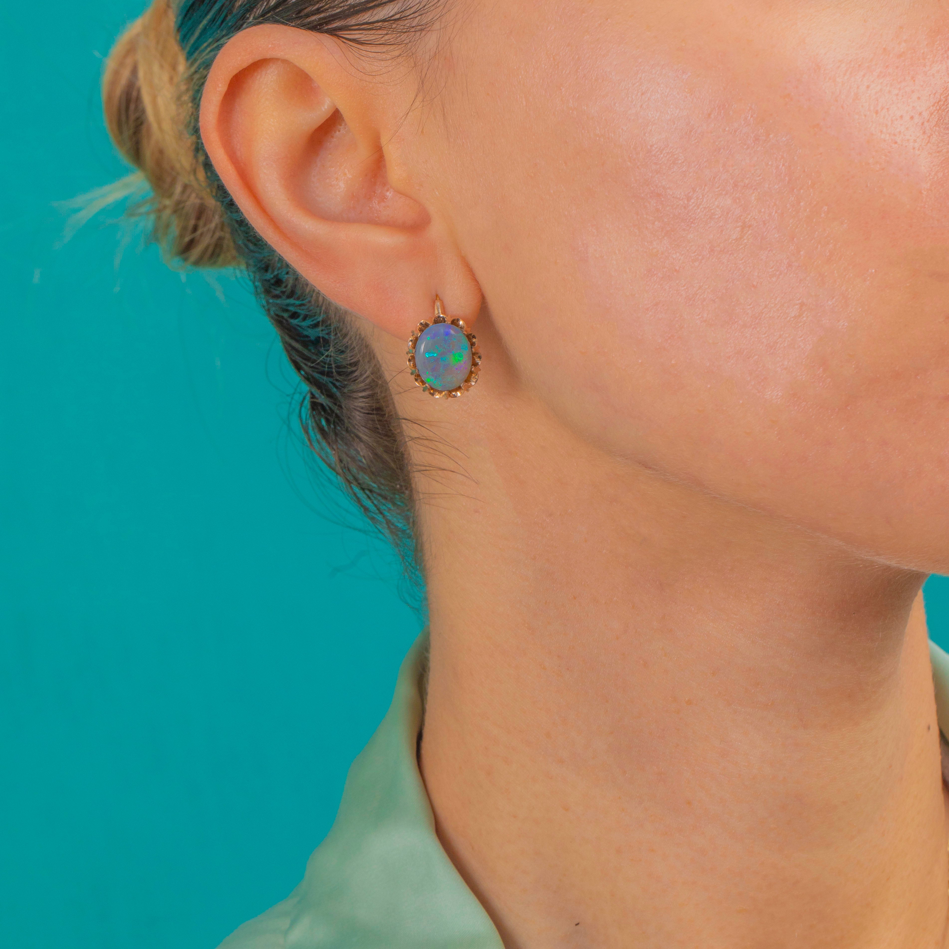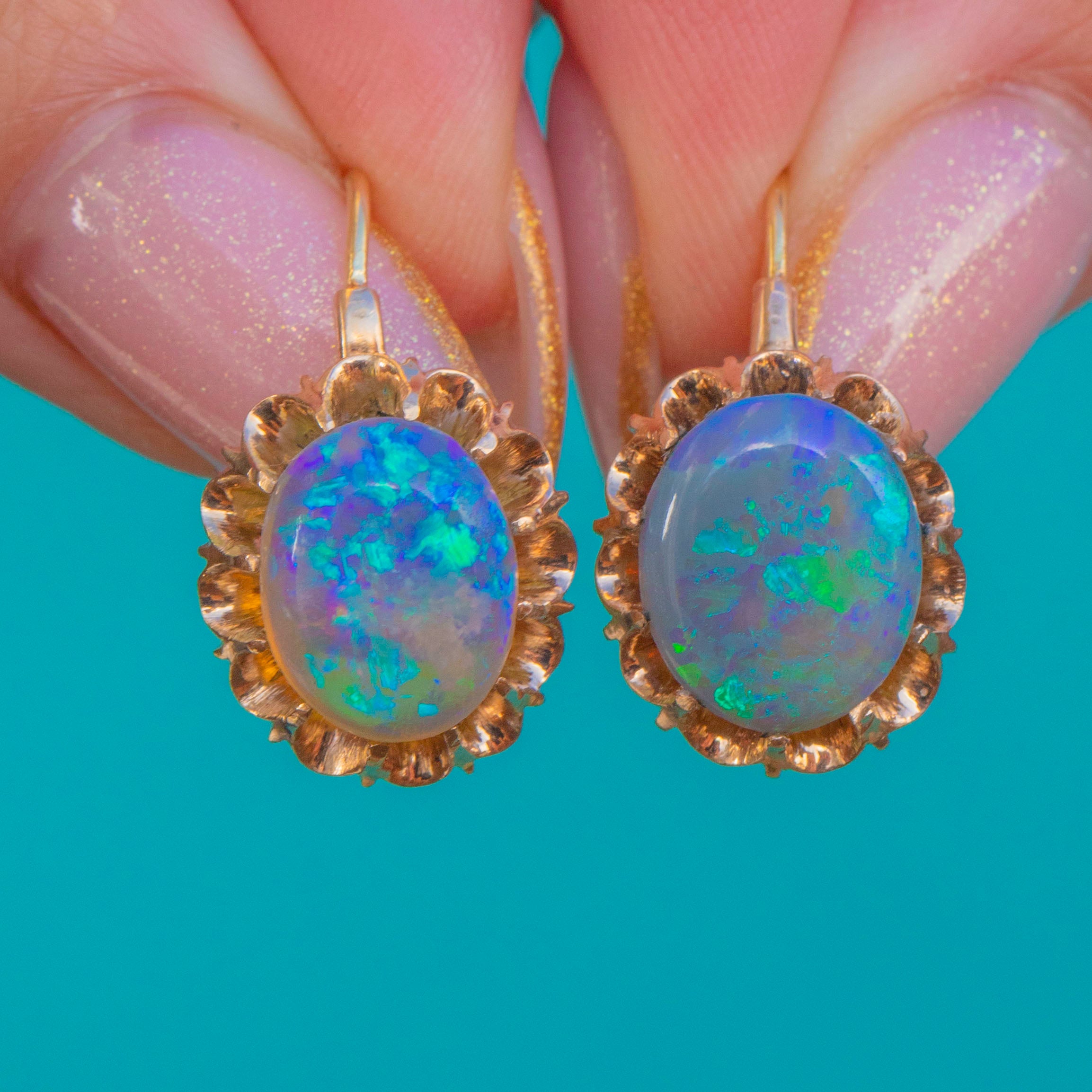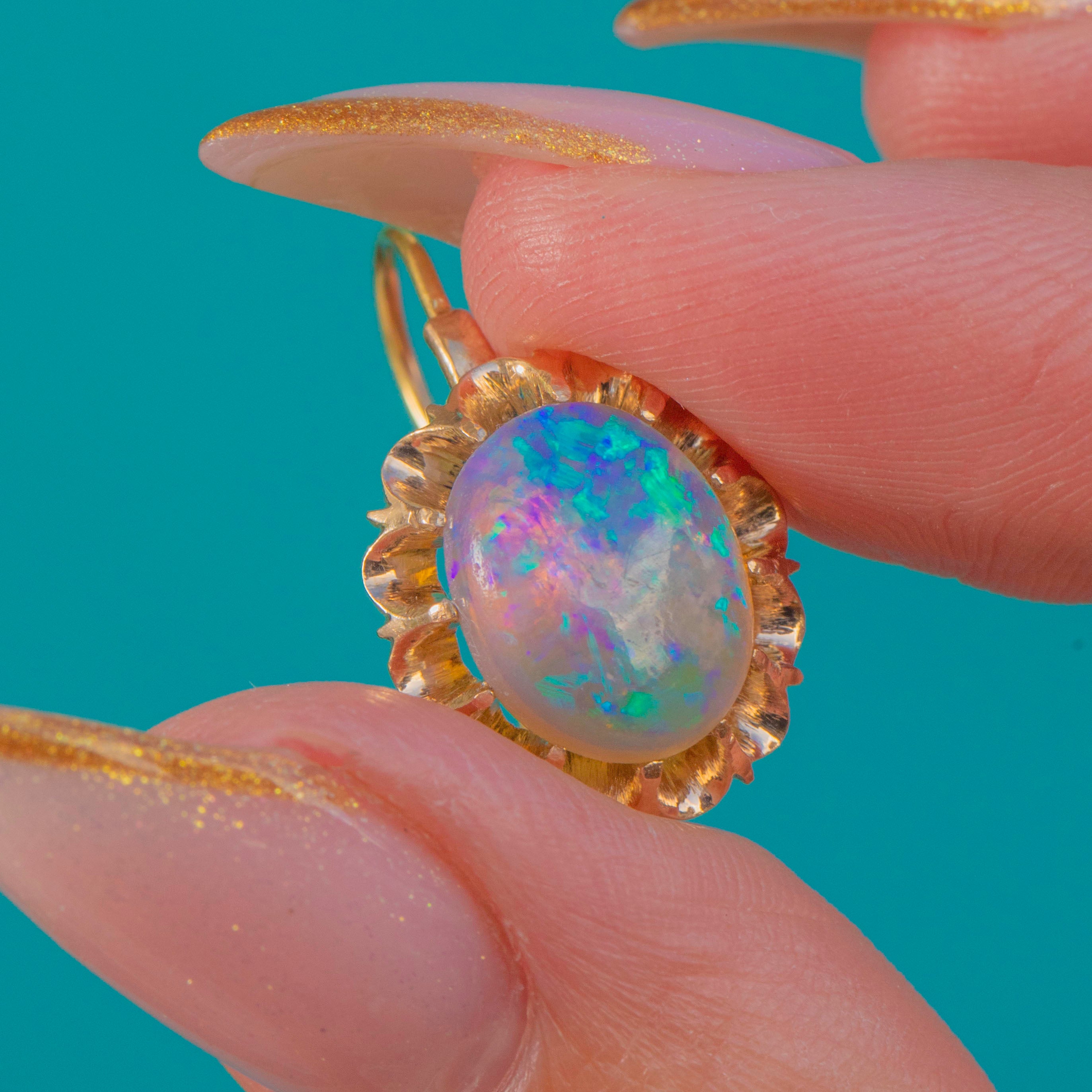 EXCELLENT: The Opals are secure and show no chips, cracks or crazing, with vibrant play-of-colour throughout. The Gold settings are crisp and well-preserved with only minimal wear commensurate with age, making these earrings wonderfully wearable.
