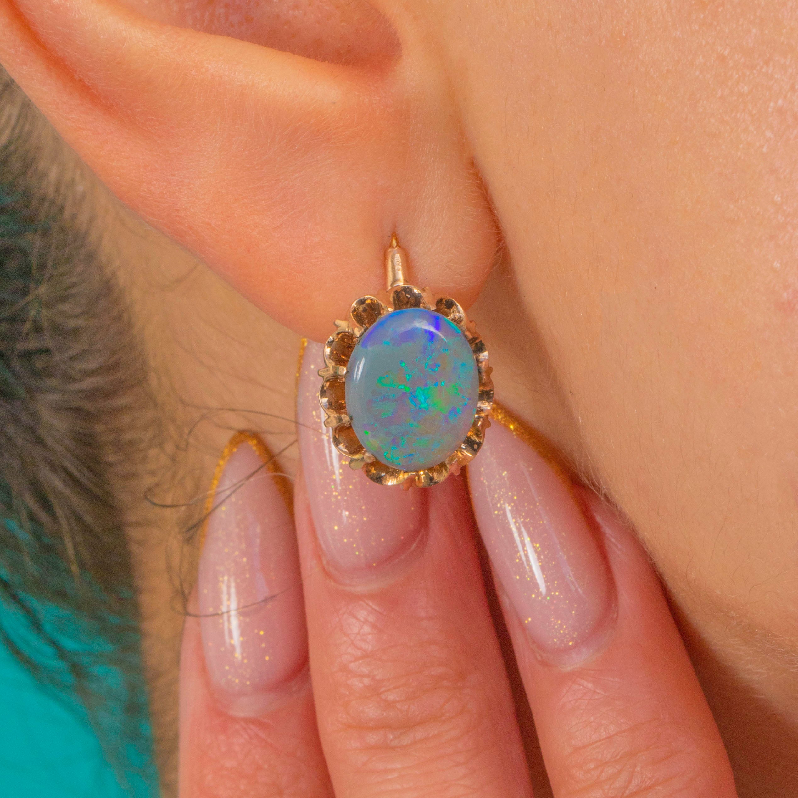 Each Opal is framed in a classic Gold buttercup setting that lets the gemstones take centre stage, creating a luxurious yet wearable pair of antique earrings with real presence on the ear. Substantial and glowing with colour, they are a fabulous choice for collectors and Opal lovers alike.