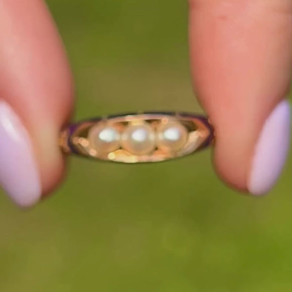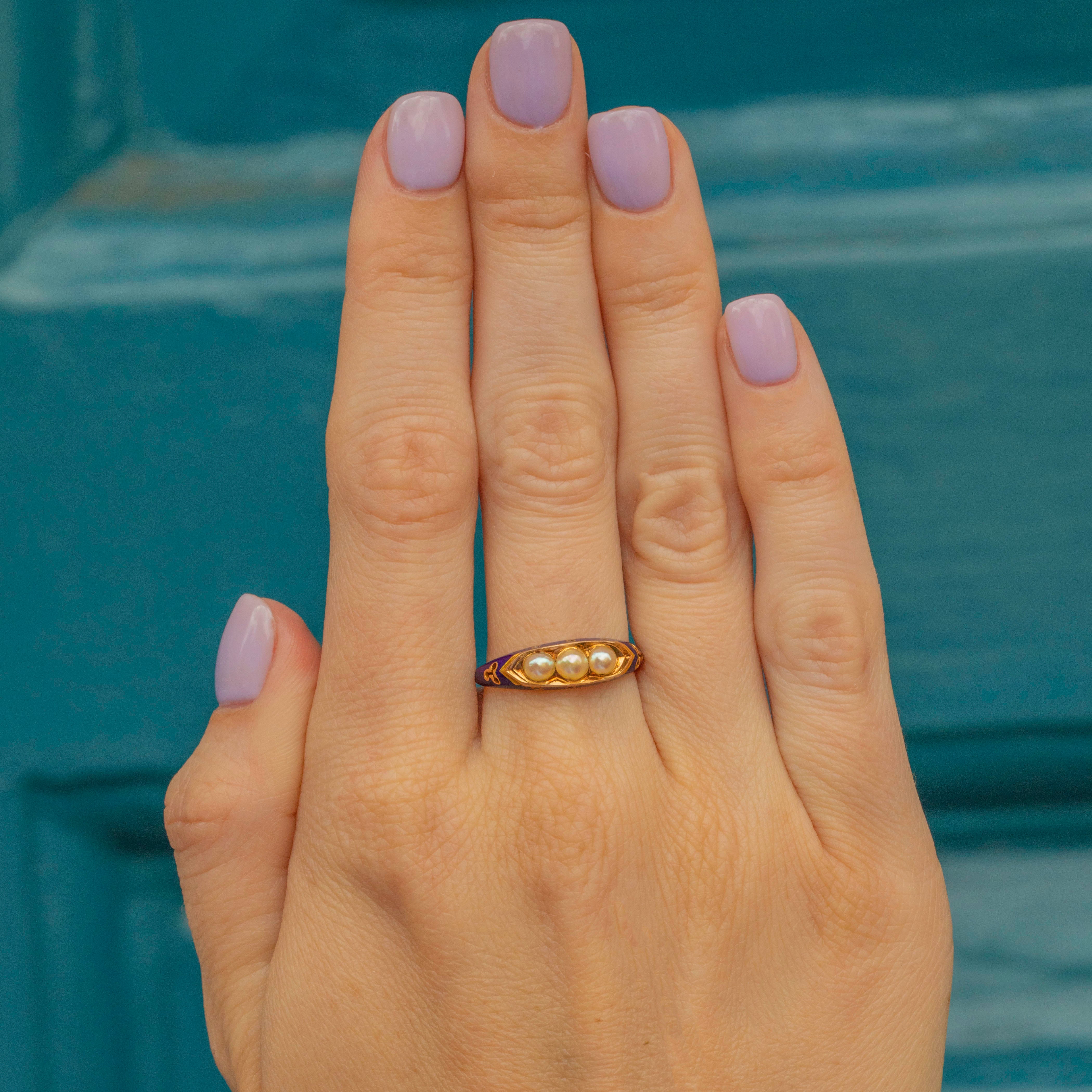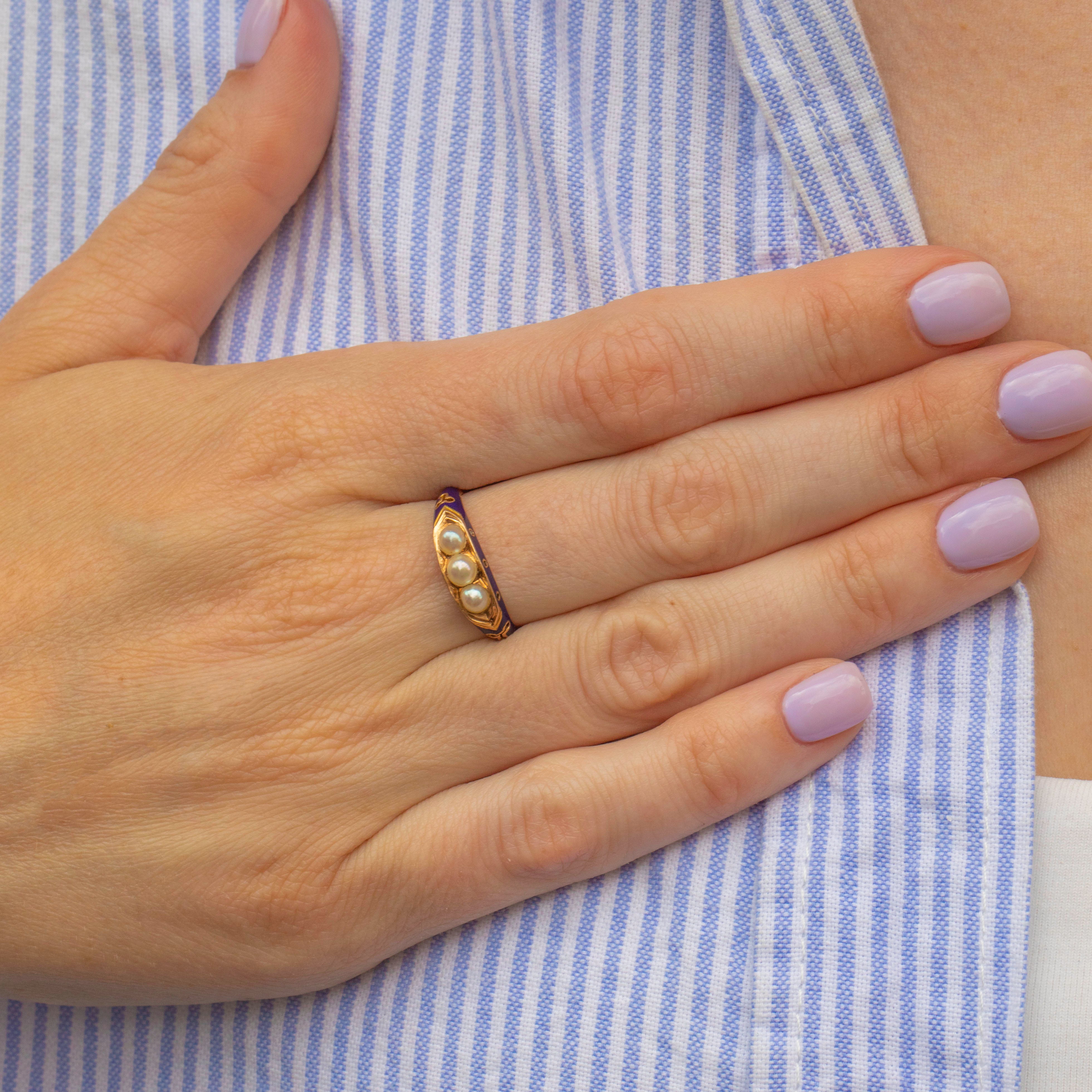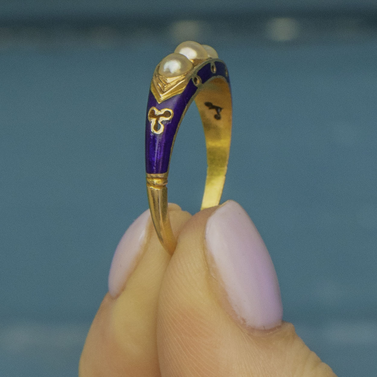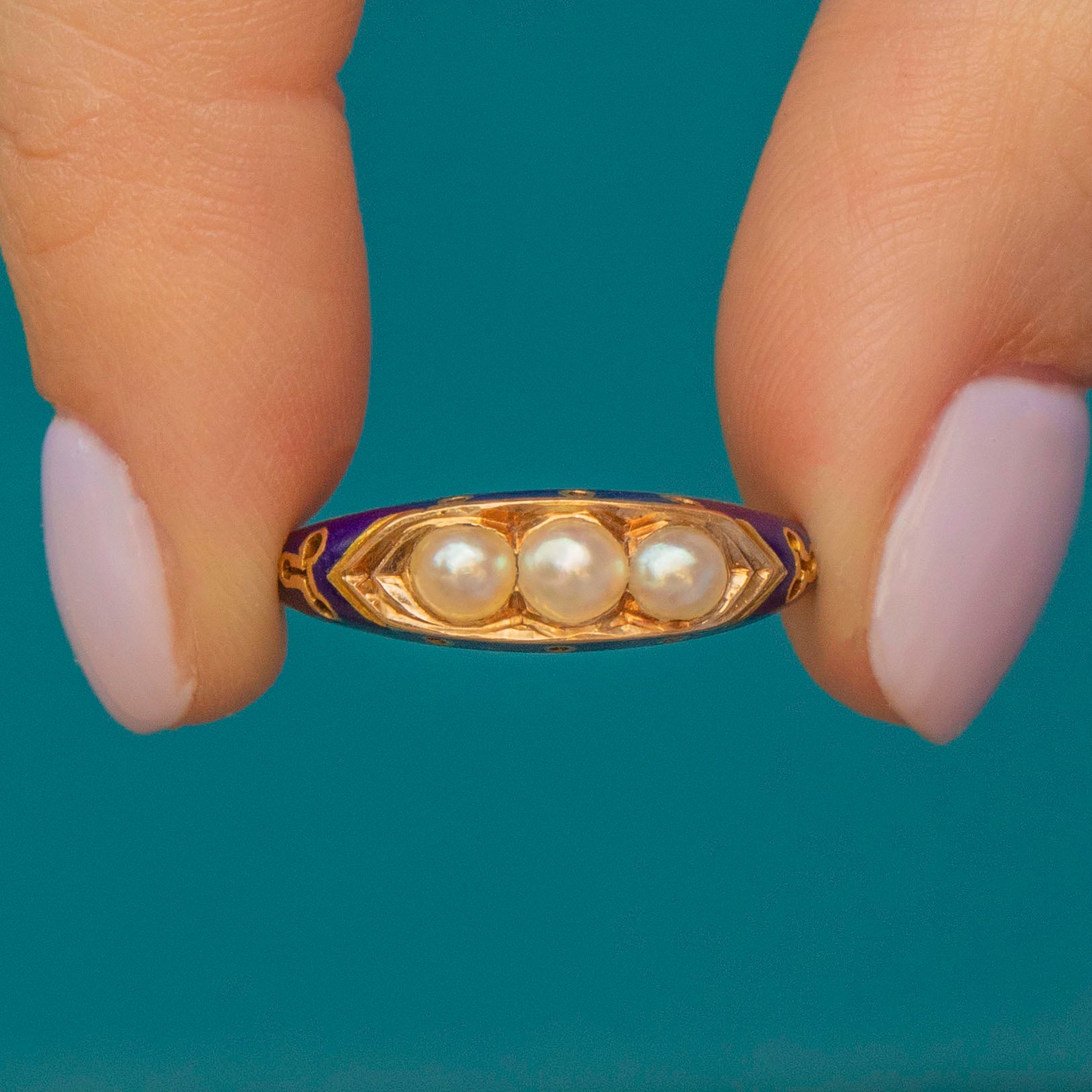 EXCELLENT. This Victorian 15ct Gold blue Enamel Pearl ring is in excellent condition. The Enamel is pristine with a lovely rich colour, and has remained beautiful all over. There is only minimal wear to the band, commensurate with age, but has remained robust and comfortable to wear. The Pearls are plump and securely set too!