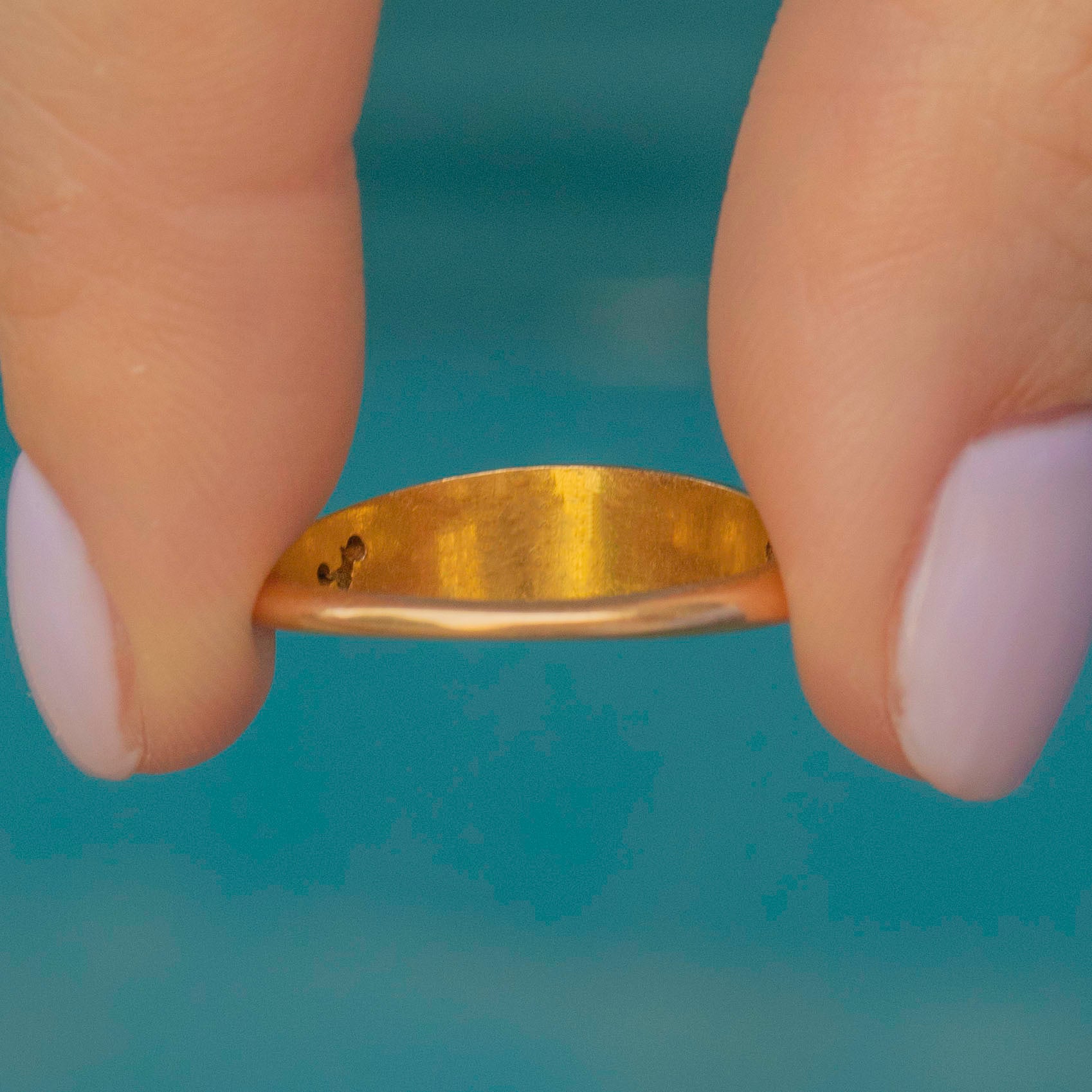 This striking 15ct Gold ring looks gorgeous on the hand, and we adore how the Pearl Enamel front spans the width of the finger providing great coverage!
