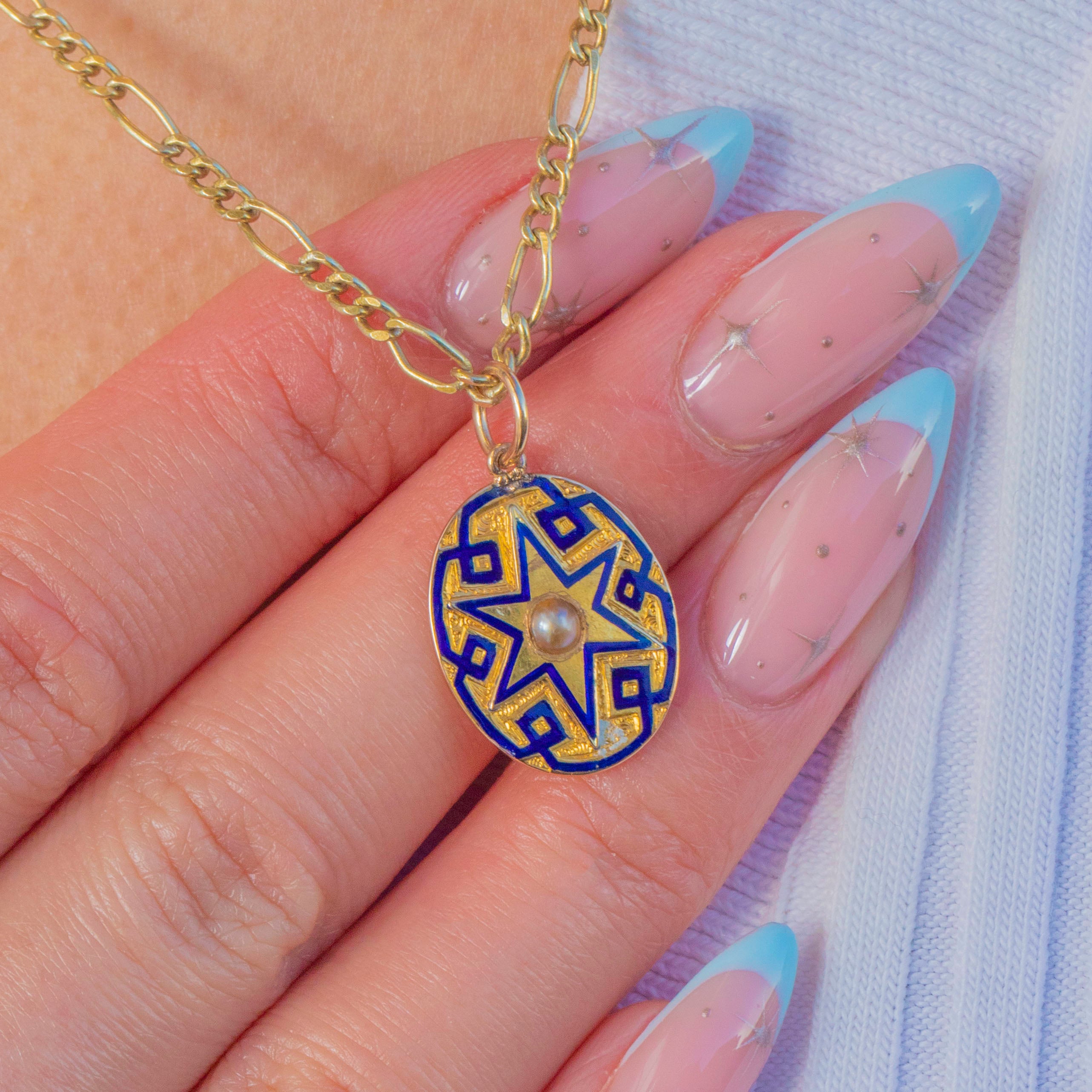 A captivating Victorian 15ct Gold charm, its oval plaque framed in deep cobalt‑blue Enamel with a refined Greek key border. At the centre glows an eight‑pointed North Star, crowned by a plump pink Pearl that pops beautifully against the glossy Enamel and rich yellow Gold.