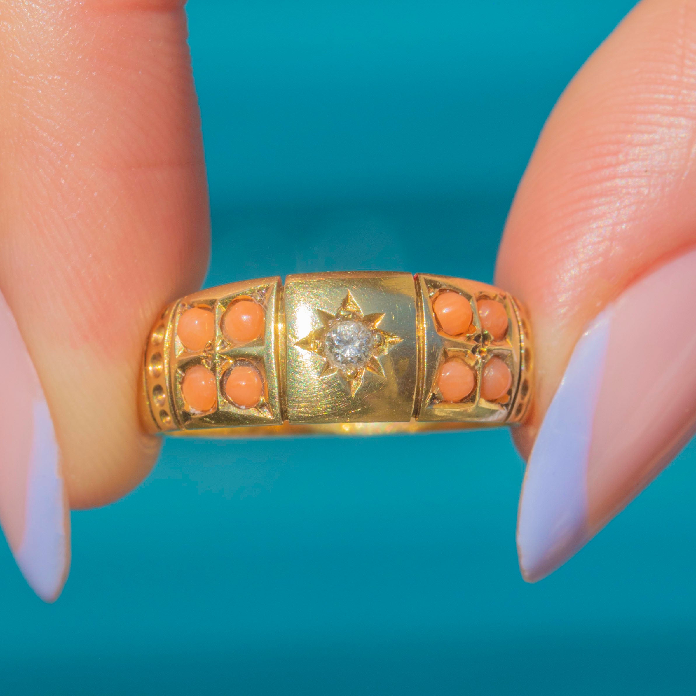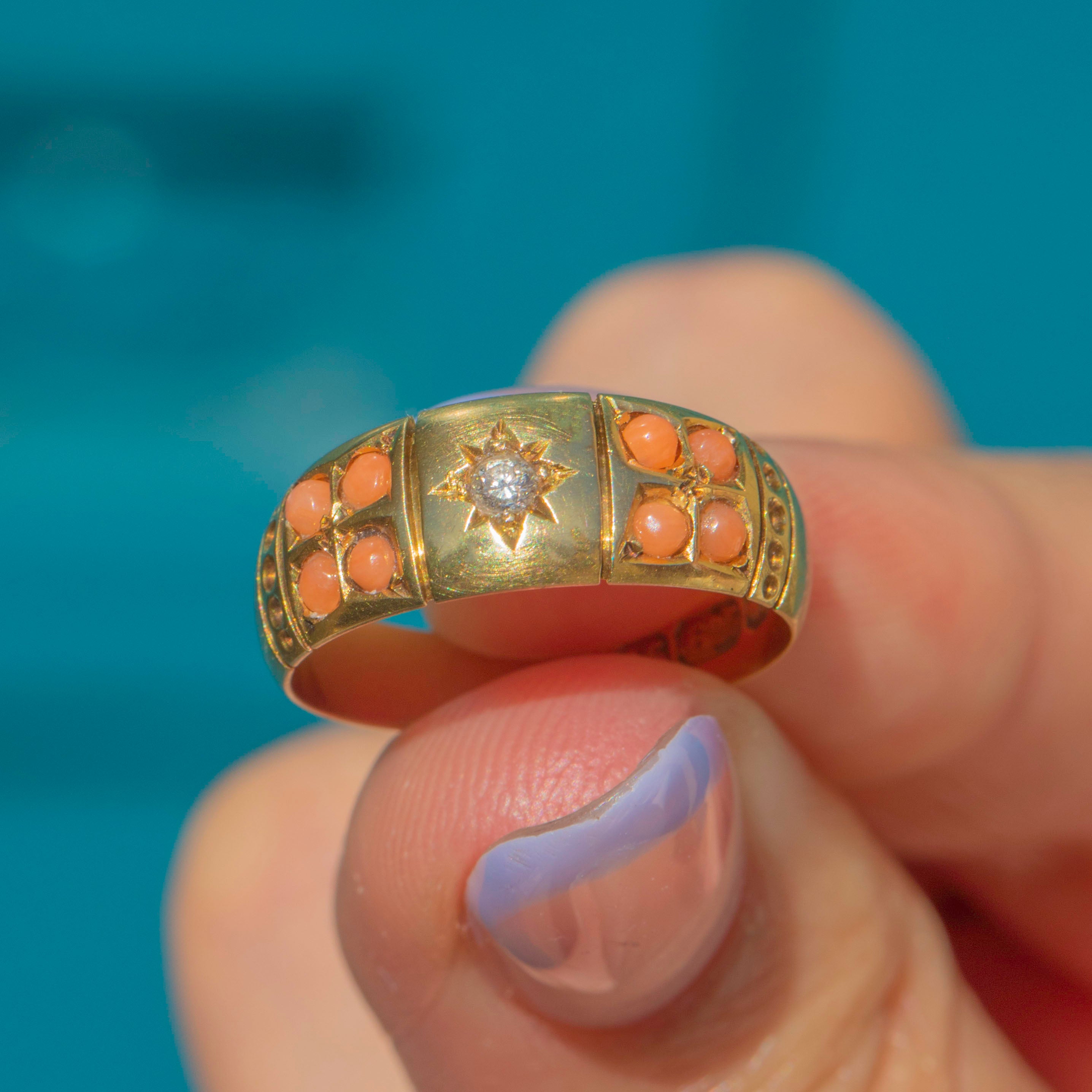 EXCELLENT: This Victorian 15ct Gold Coral Diamond gypsy ring is presented in excellent condition. The Coral and Diamond are secure within their settings, complementing each other perfectly, with crisply engraved details on the shoulders. The Gold is bright and buttery, with no visible wear, and the hallmarks are crisp and fully legible allowing us to accurately date tit to 1876!