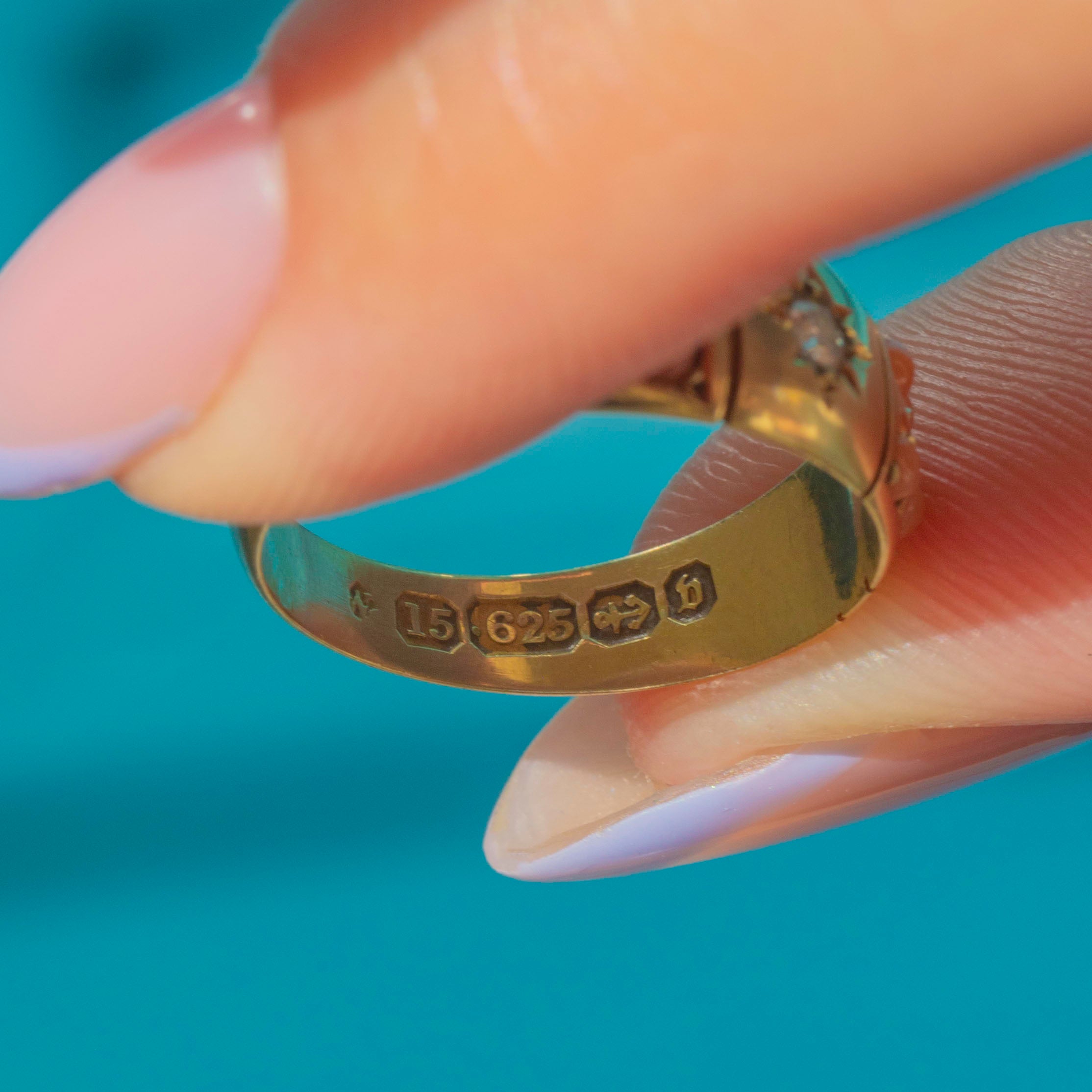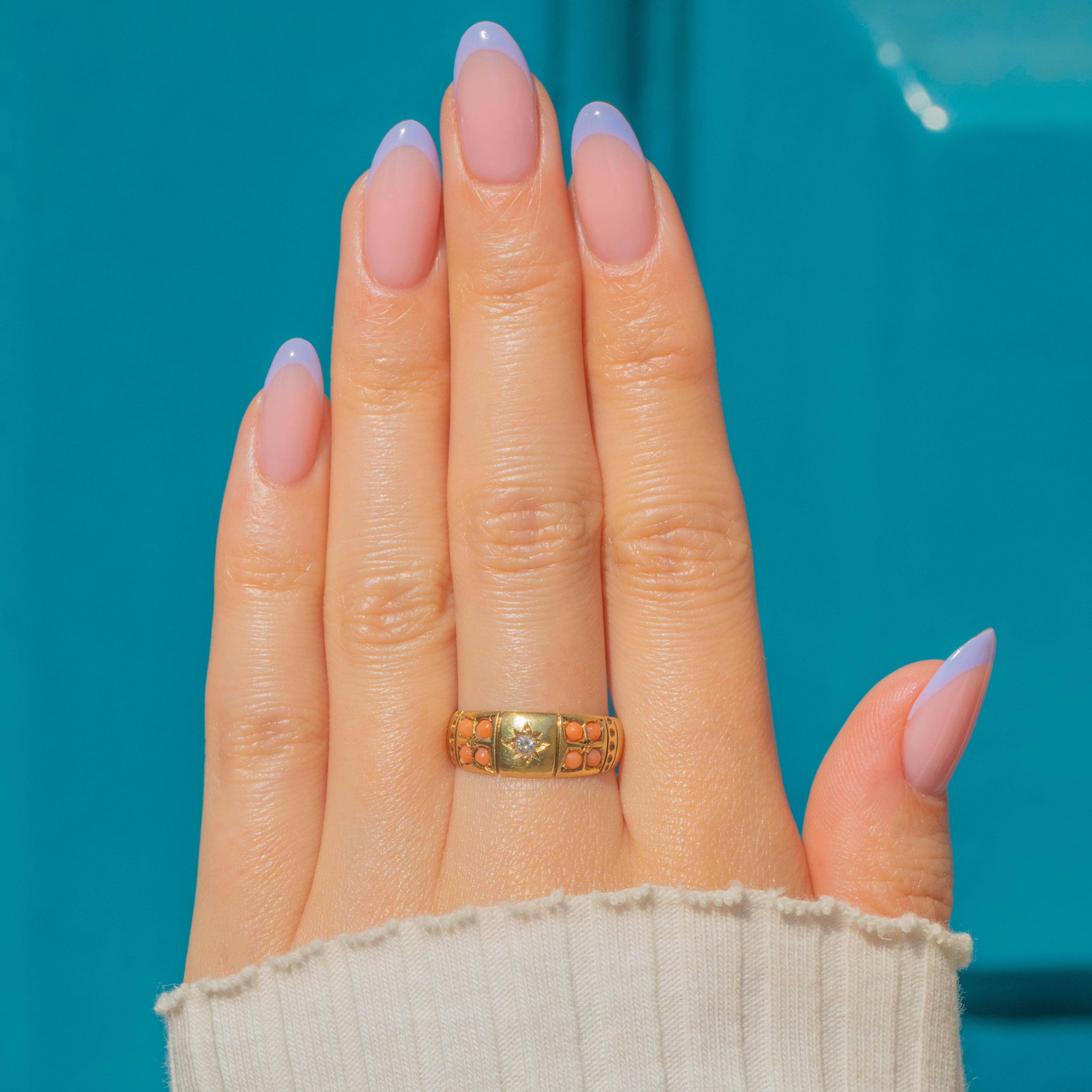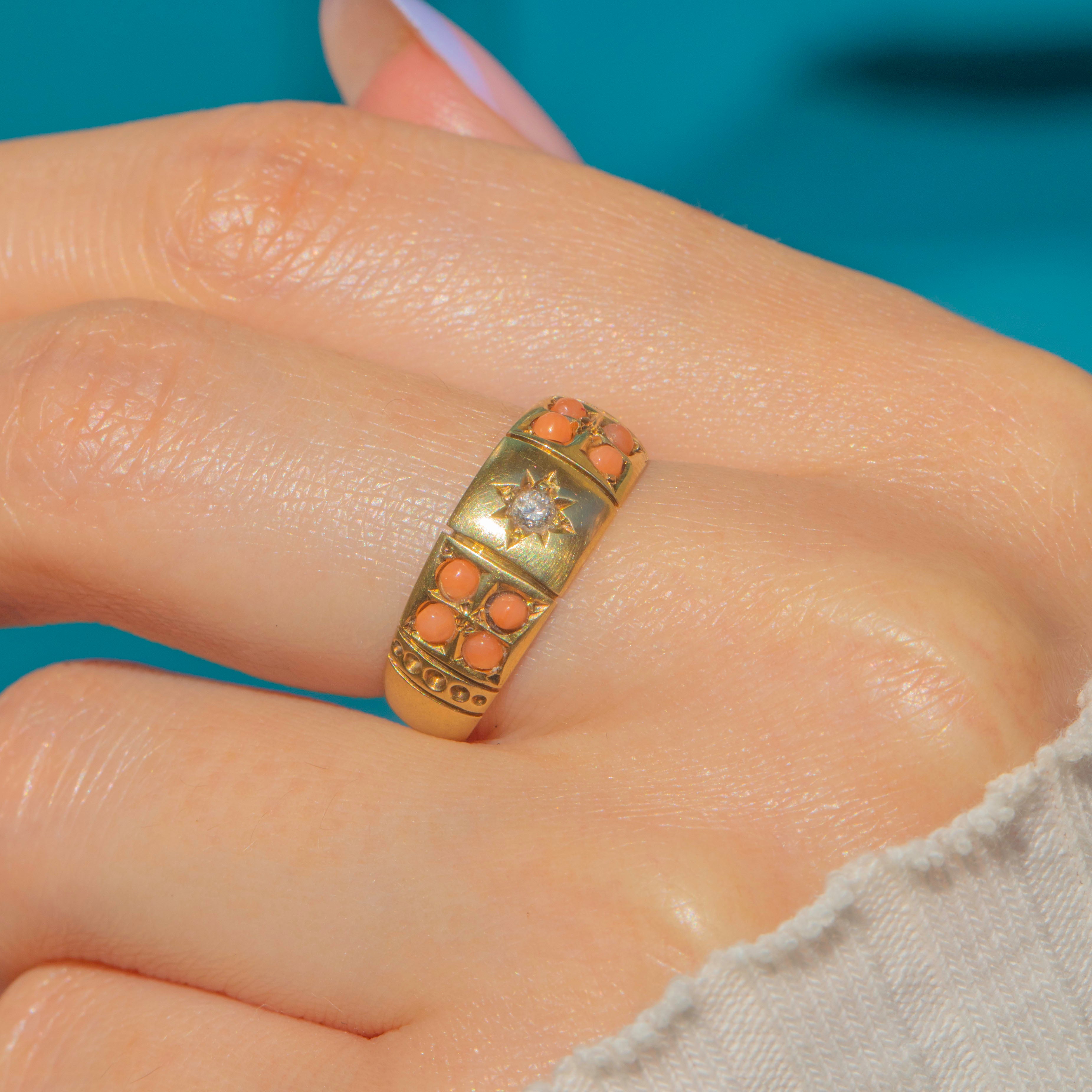 This Victorian ring features a single-star set Diamond adding a sparkly accent, framed by rows of dainty Coral cabochons set into the chubby Gold band. With a full set of hallmarks, we can date this Coral Diamond ring back to 1876, how outstanding is that!