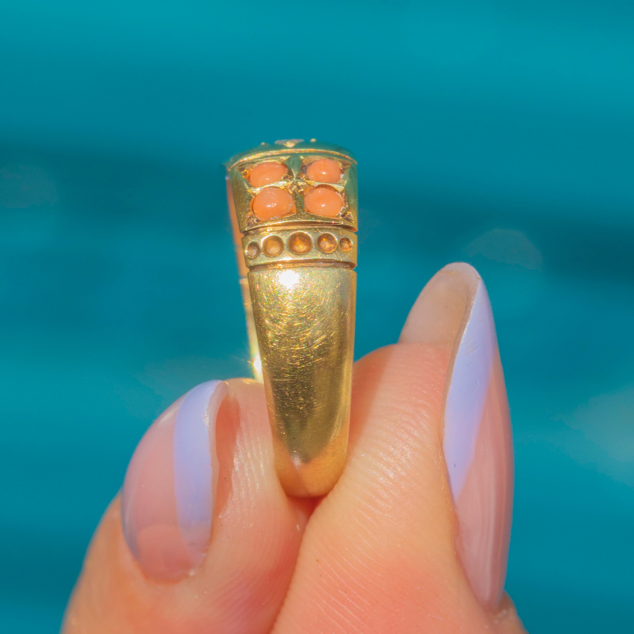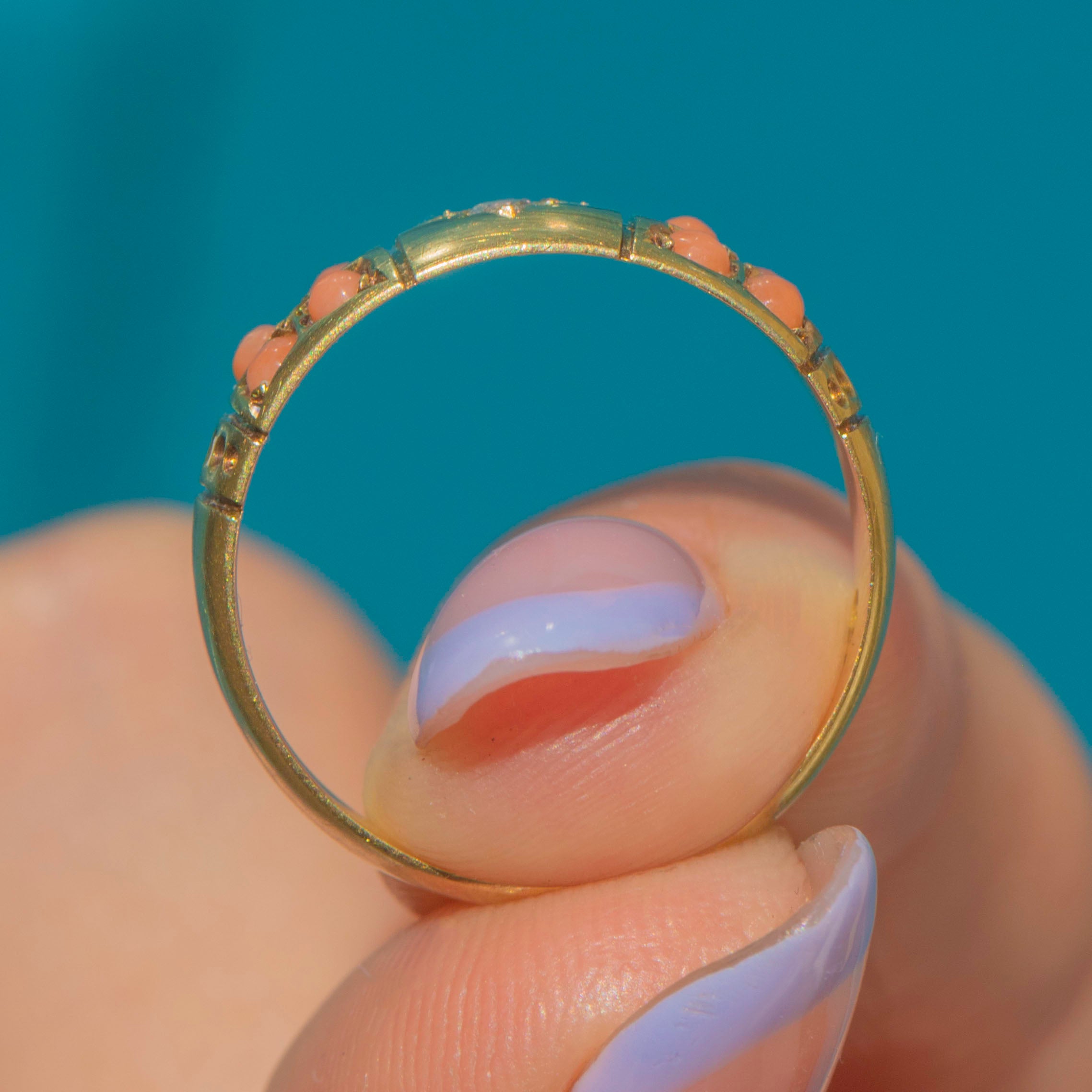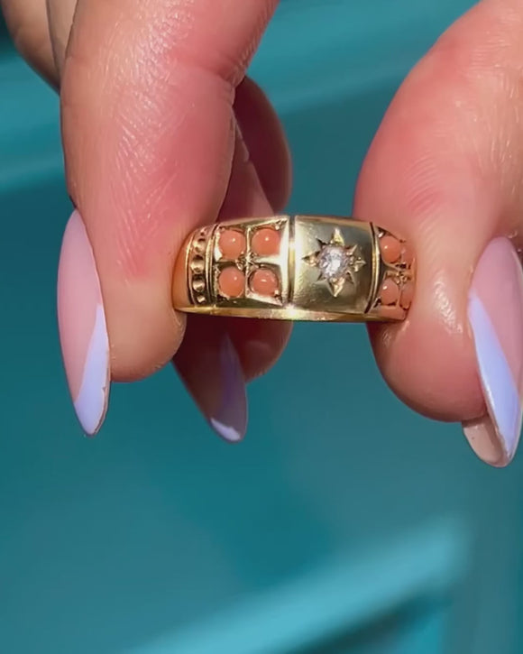 Victorian 15ct Gold Coral Diamond Gypsy Ring c.1876
