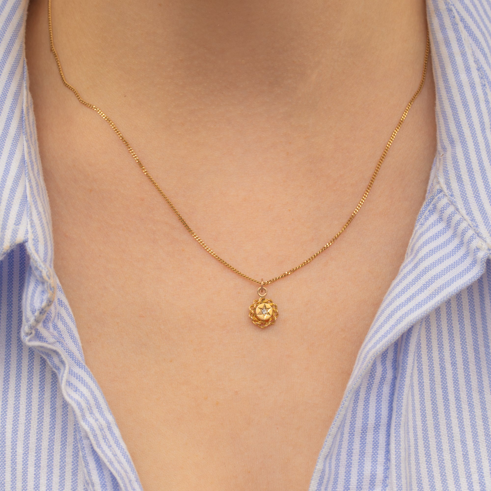 Nestled at the centre of this Victorian Gold charm is a dainty Diamond, adding a sparkling accent to the sumptuous Gold. Her dainty size makes her an easy everyday pendant option; she is bound to become your new go-to piece!