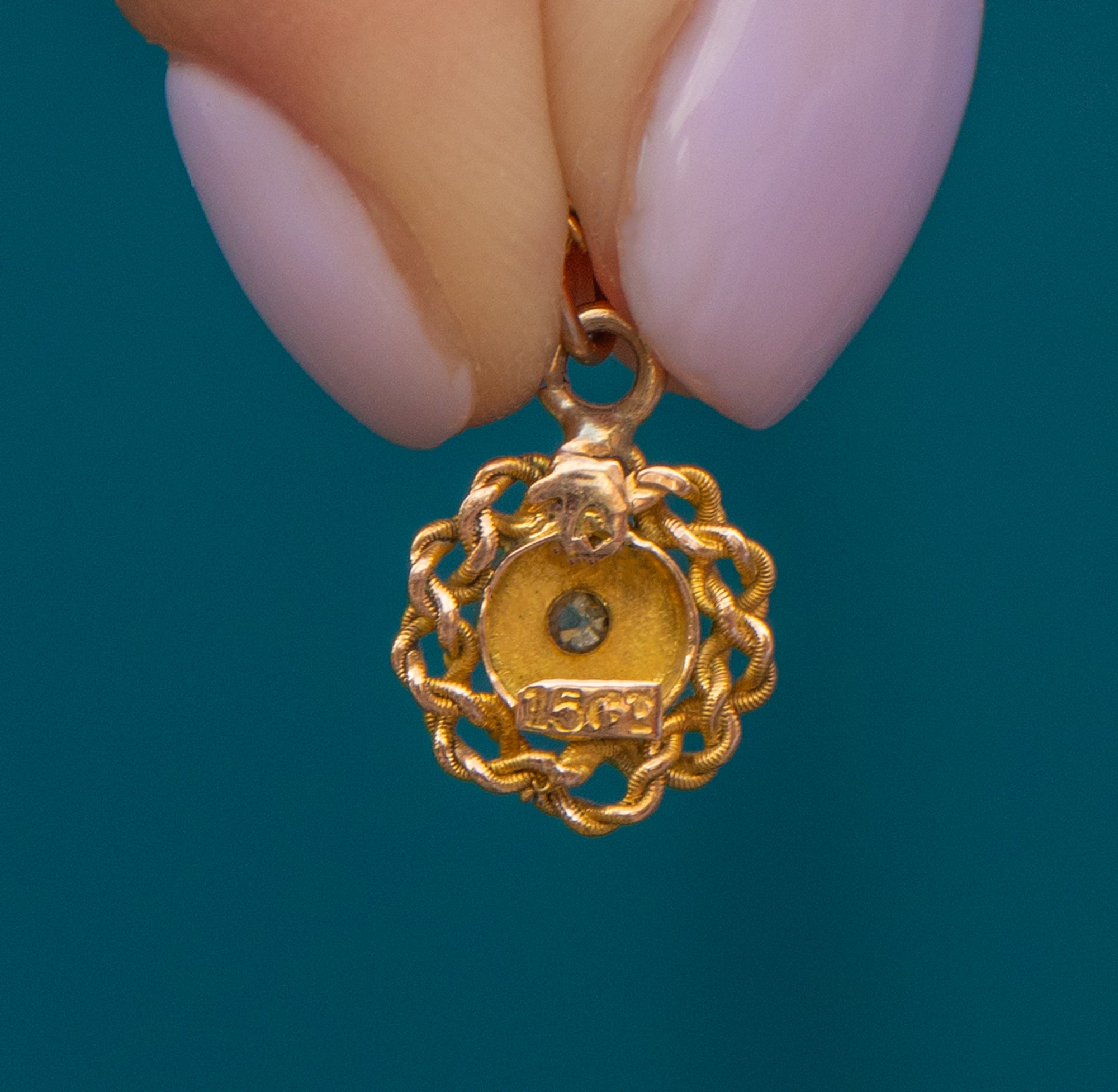 VERY GOOD. This antique 15ct Gold Etruscan round Diamond charm is in very good condition. The Diamond is secure within its setting with no damage to note. The rope details are in impeccable condition and the 15ct Gold has a richly saturated hue throughout. There is some wear on the back of the pendant from her stick pin conversion, however her fineness stamp has remained crisp. With a soldered jump-ring, you can wear it with the utmost confidence!
