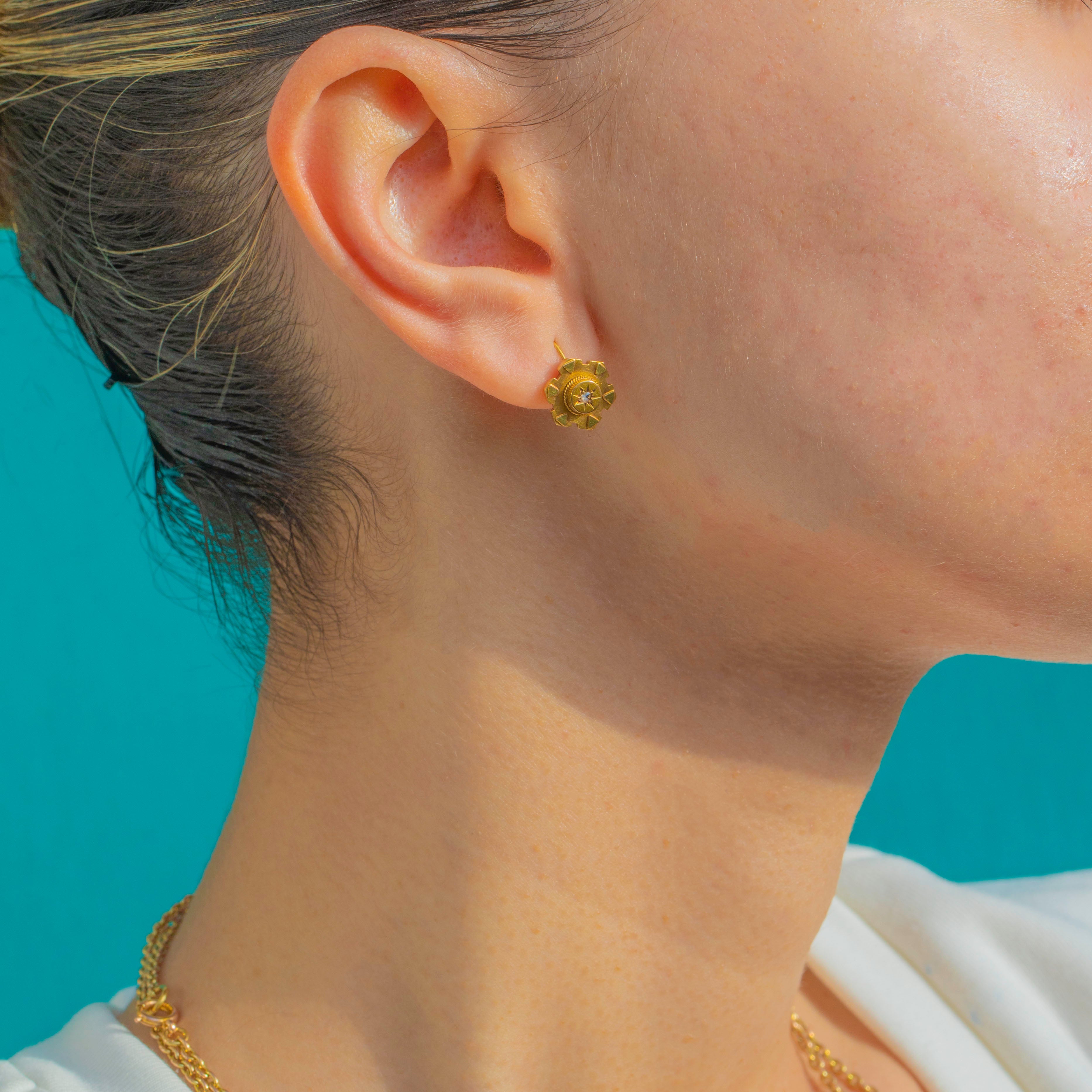 Petite yet exquisitely detailed, these Victorian 15ct Gold Diamond earrings are a beautiful nod to the era’s Etruscan Revival style. Each drop is adorned with a star-set Diamond at the centre, framed by fine rope and punched detailing that creates a delicate rosette silhouette.