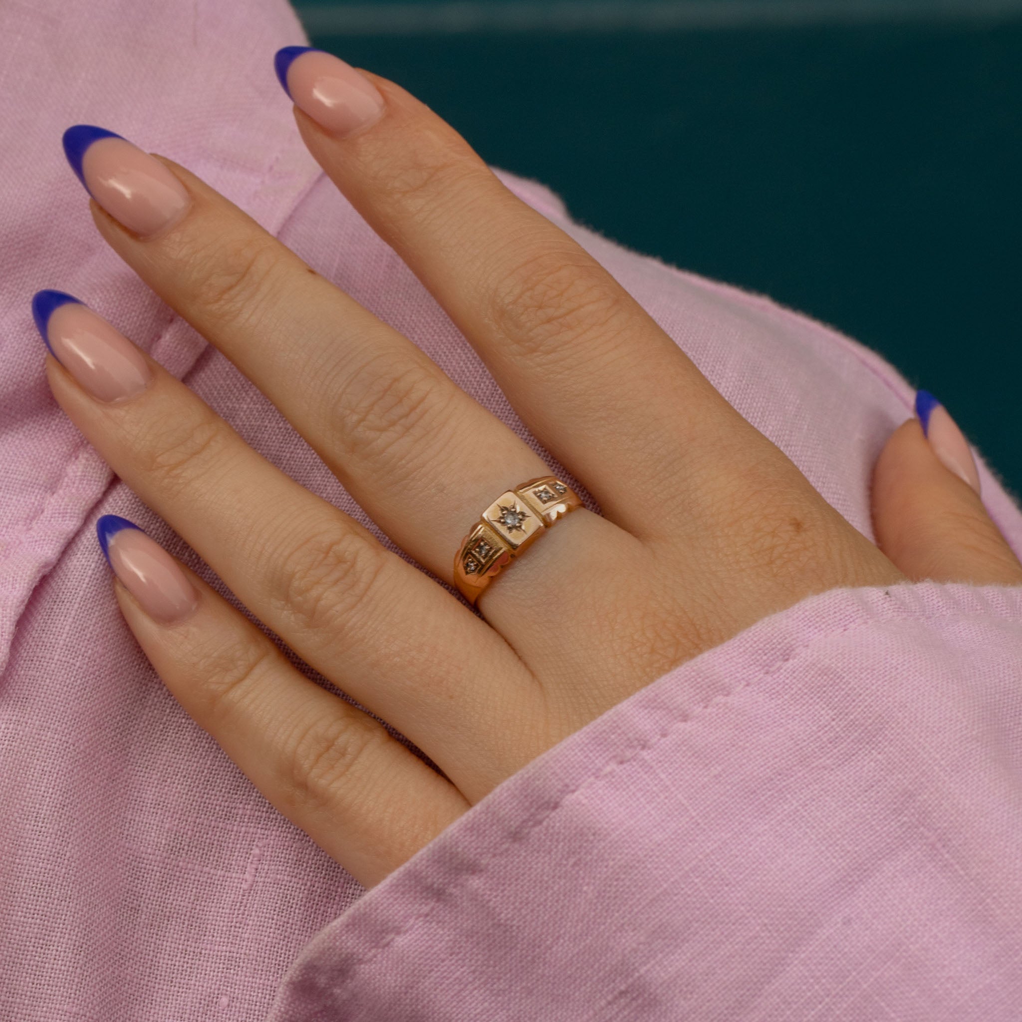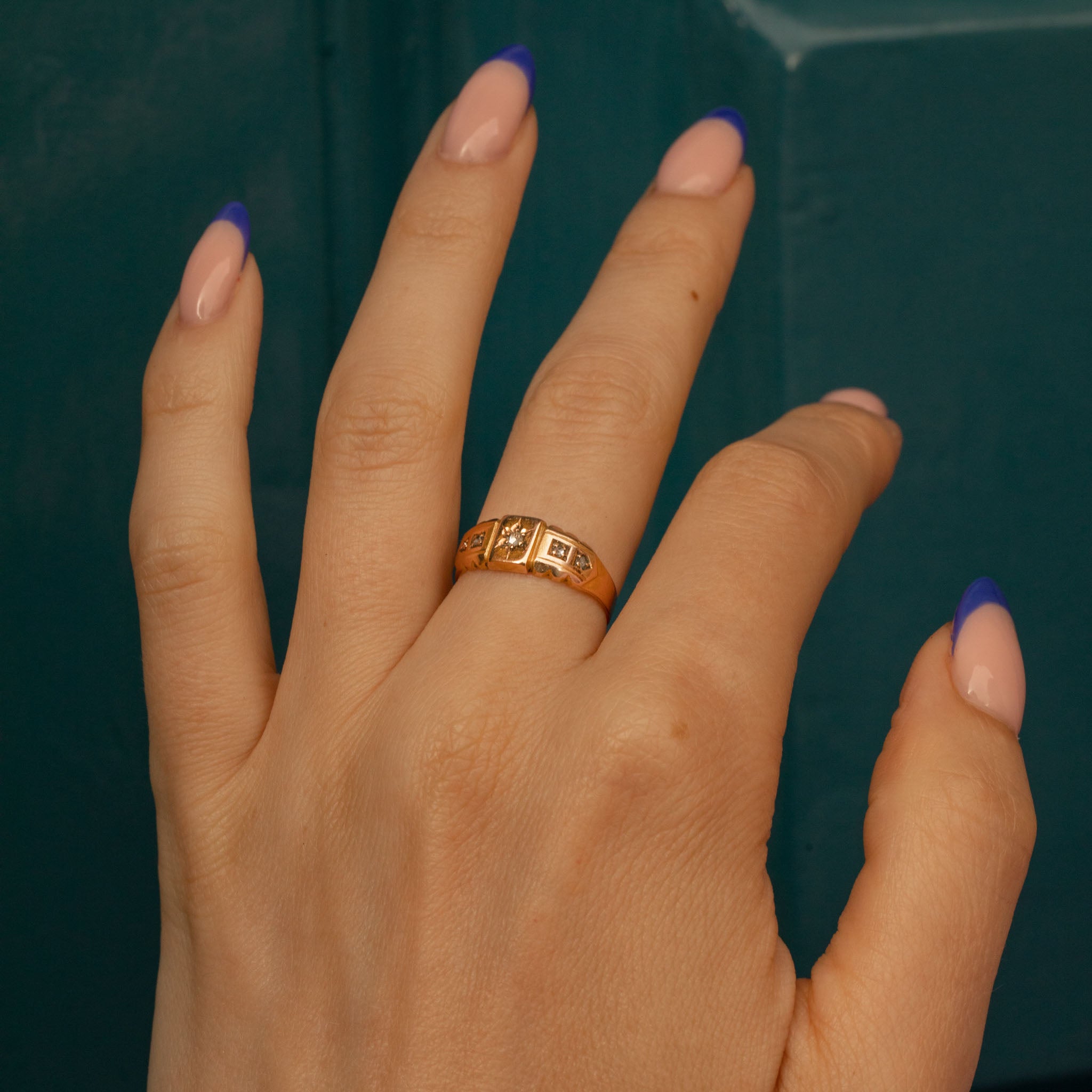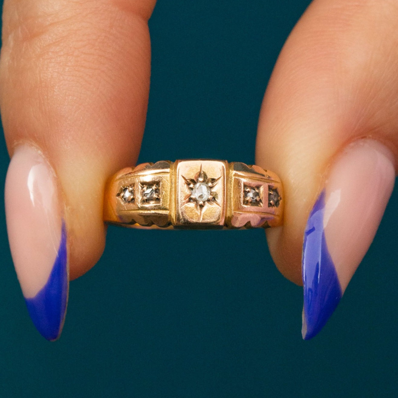 Whether it's a passion for the Victorian period or a lover of celestial jewellery, this Victorian 15ct Gold Diamond five stone gypsy ring was made for you! Featuring a panelled design she is inlaid with five Diamonds providing a wonderful sparkle.