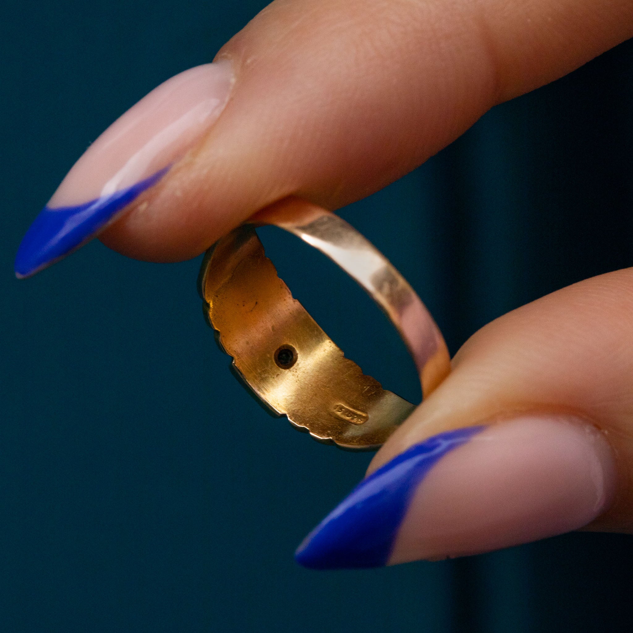 With sweet scallop edges formed entirely from buttery 15ct Gold, this antique Diamond ring brings femininity and opulence making her the perfect pick to incorporate into your carefully curating stack!