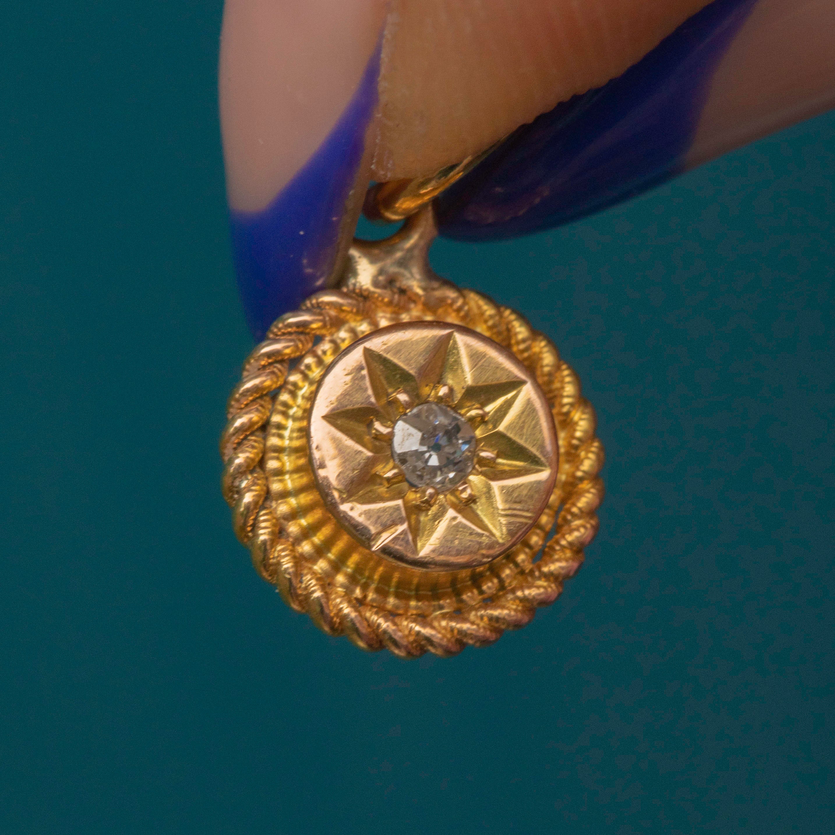 EXCELLENT. This antique 15ct Gold Etruscan revival Diamond star charm is in excellent condition. This treasure has little wear to note. The Diamond is secure in its setting and sparkles beautifully. The charm has a decorative rope border and a solid 18ct Gold jump ring so you can wear this piece with confidence! What was once likely a stick pin, this treasure has been beautifully converted into a highly wearable charm that you can enjoy on a daily basis.