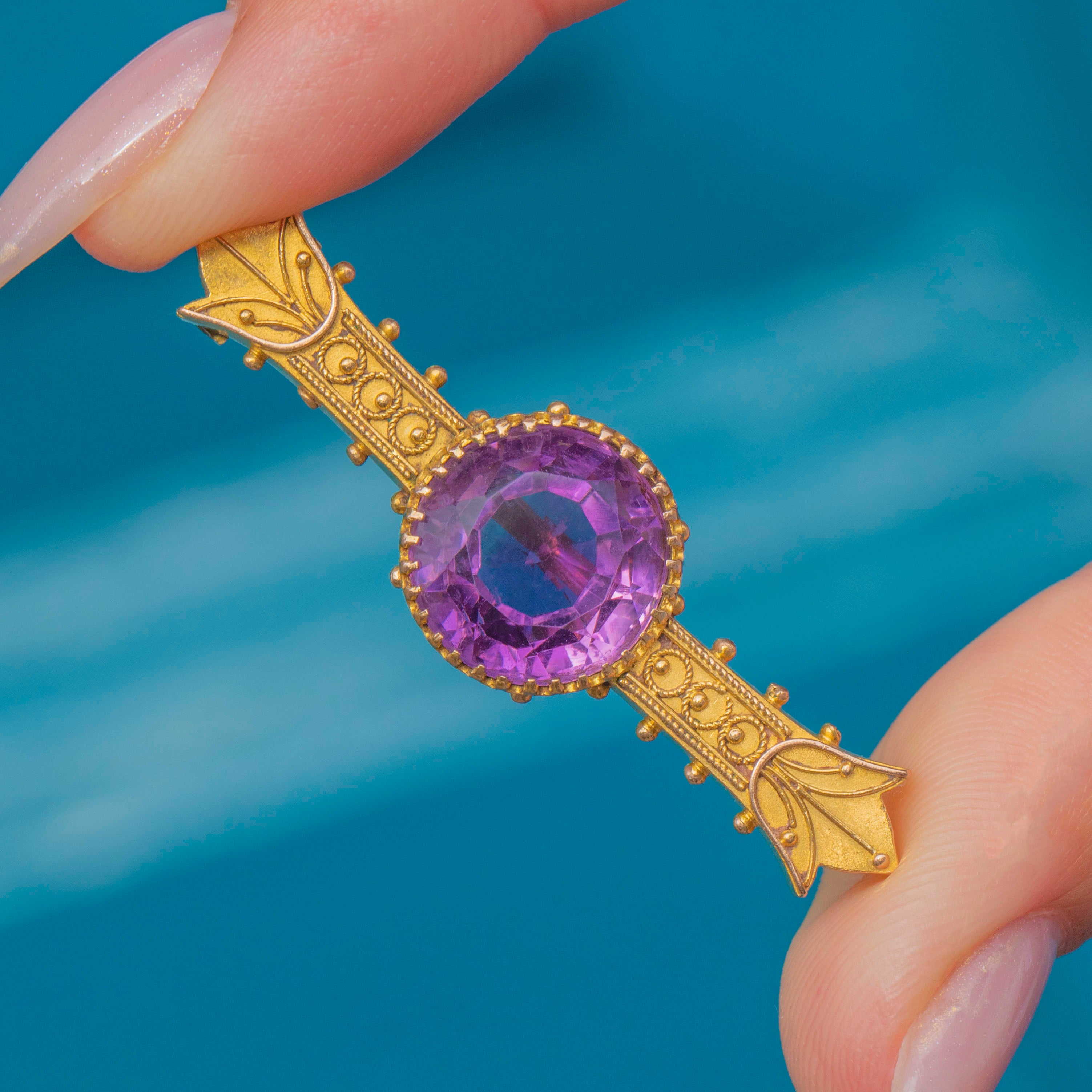 This Victorian brooch is centred by a plump Amethyst, boasting 5.45ct and projecting saturated, vibrant royal purple hues from its crisp facets.