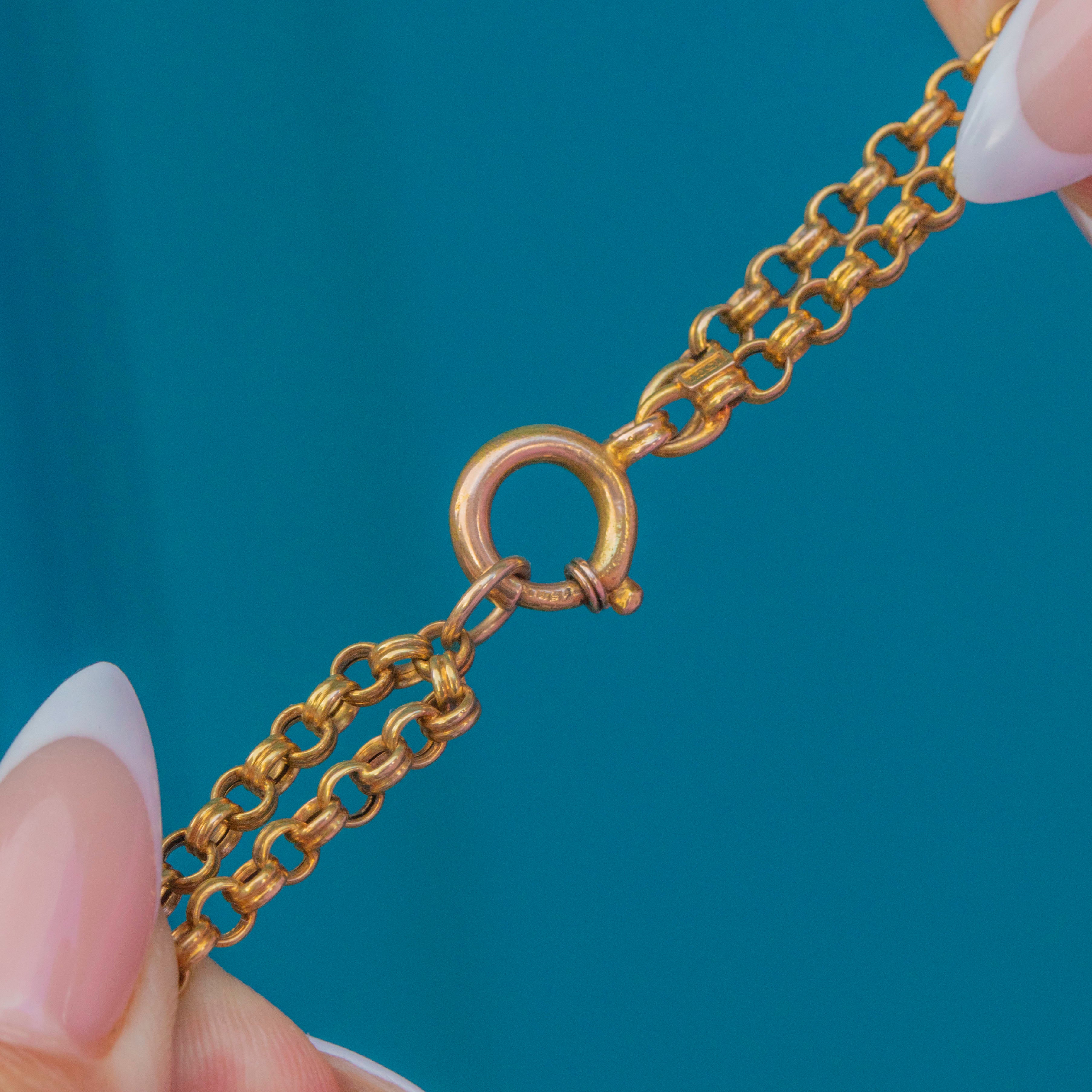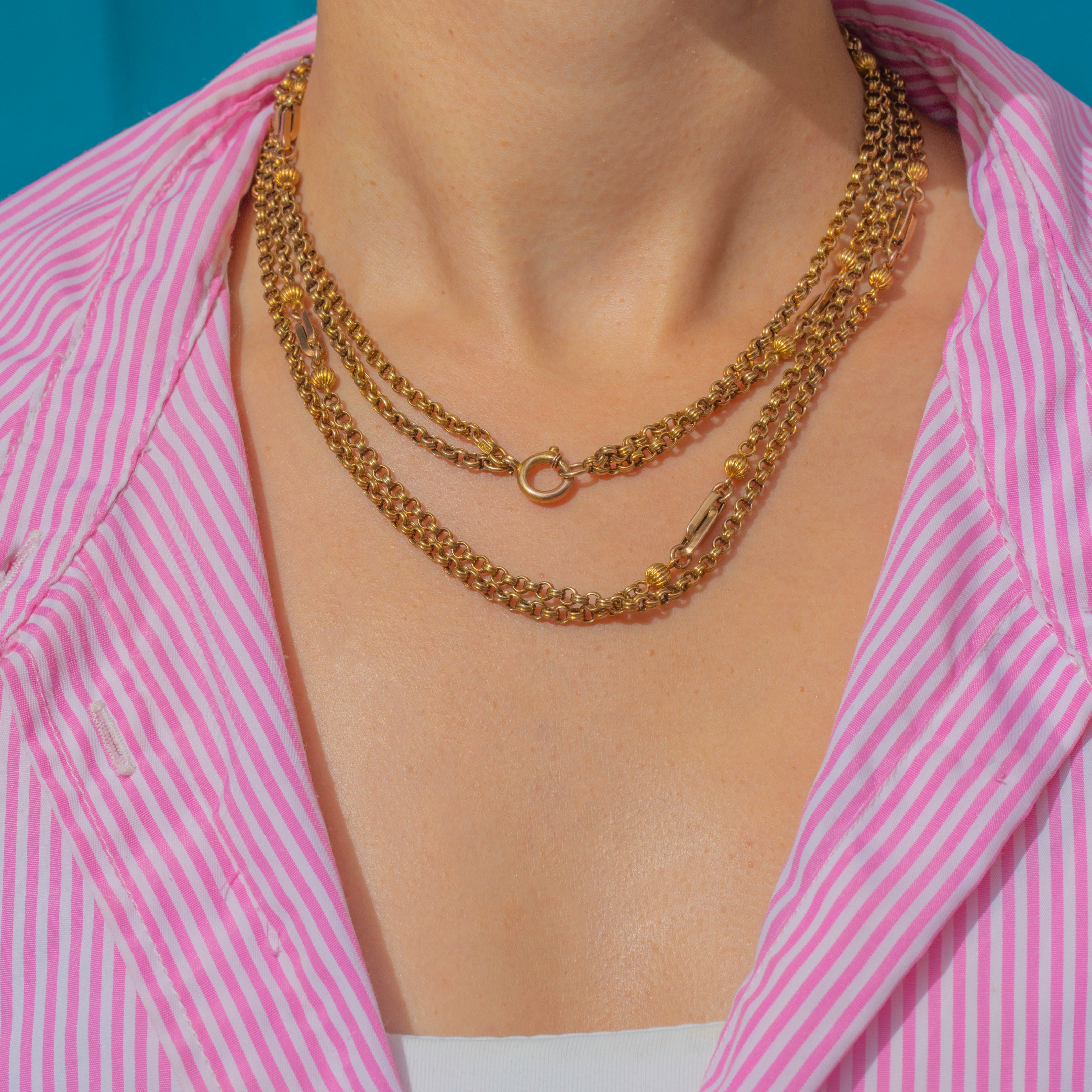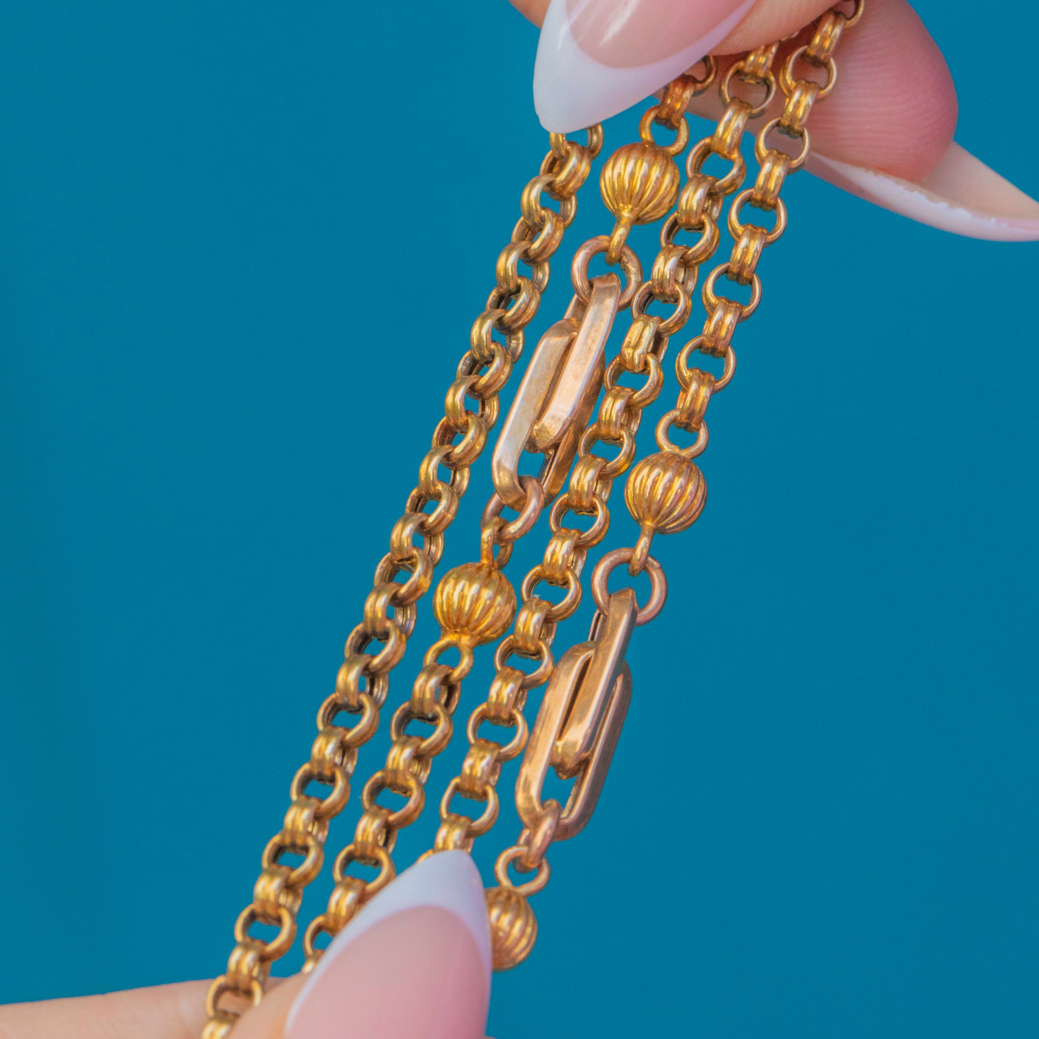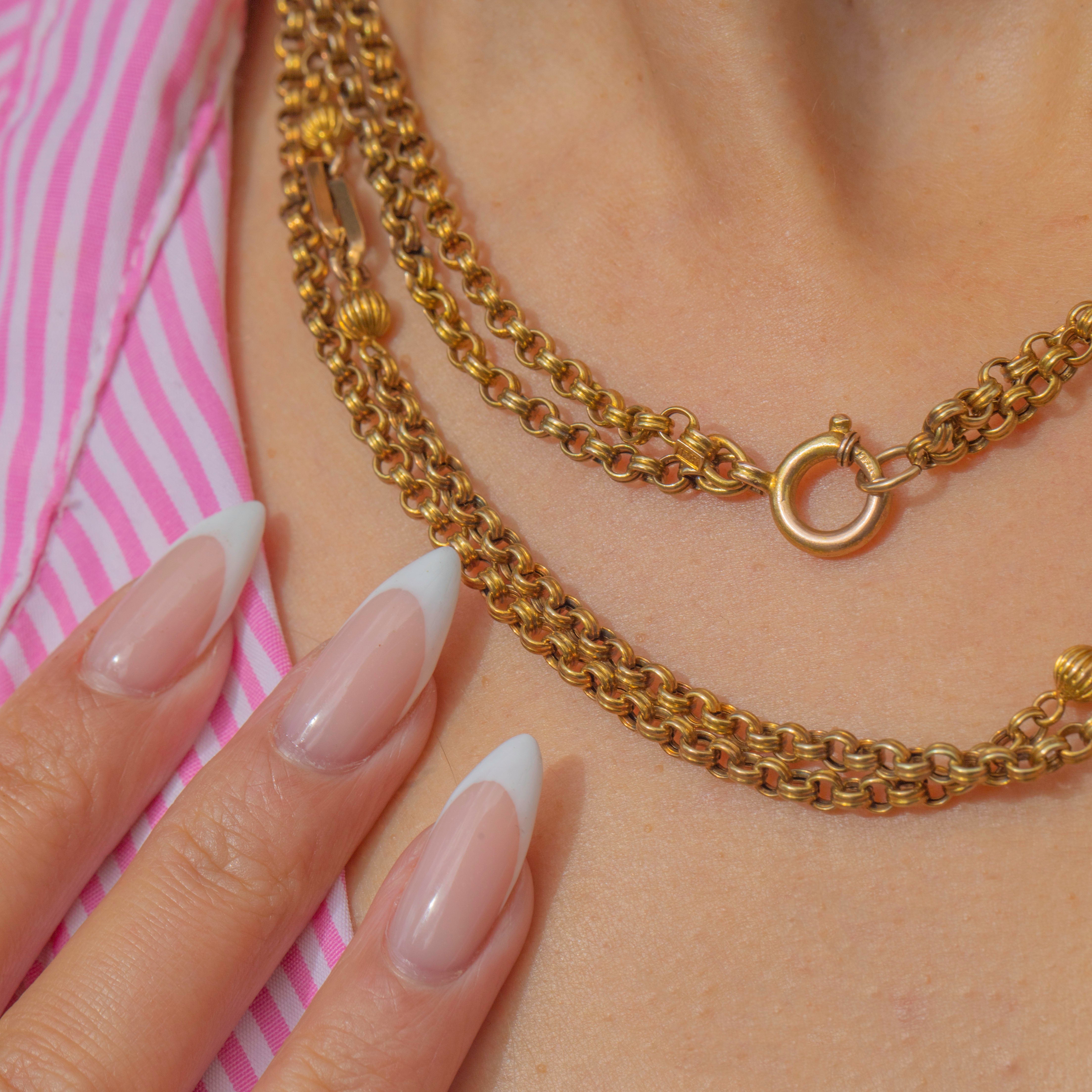 This magnificent Antique chain is crafted in rich 15ct Gold and showcases an elegant fancy link design. The double belcher links alternate with ball and fetter forms, giving the chain beautiful rhythm and texture as it drapes. At an impressive 63" long, this chain offers endless styling options, wear it full length, doubled, or layered with other favourites.